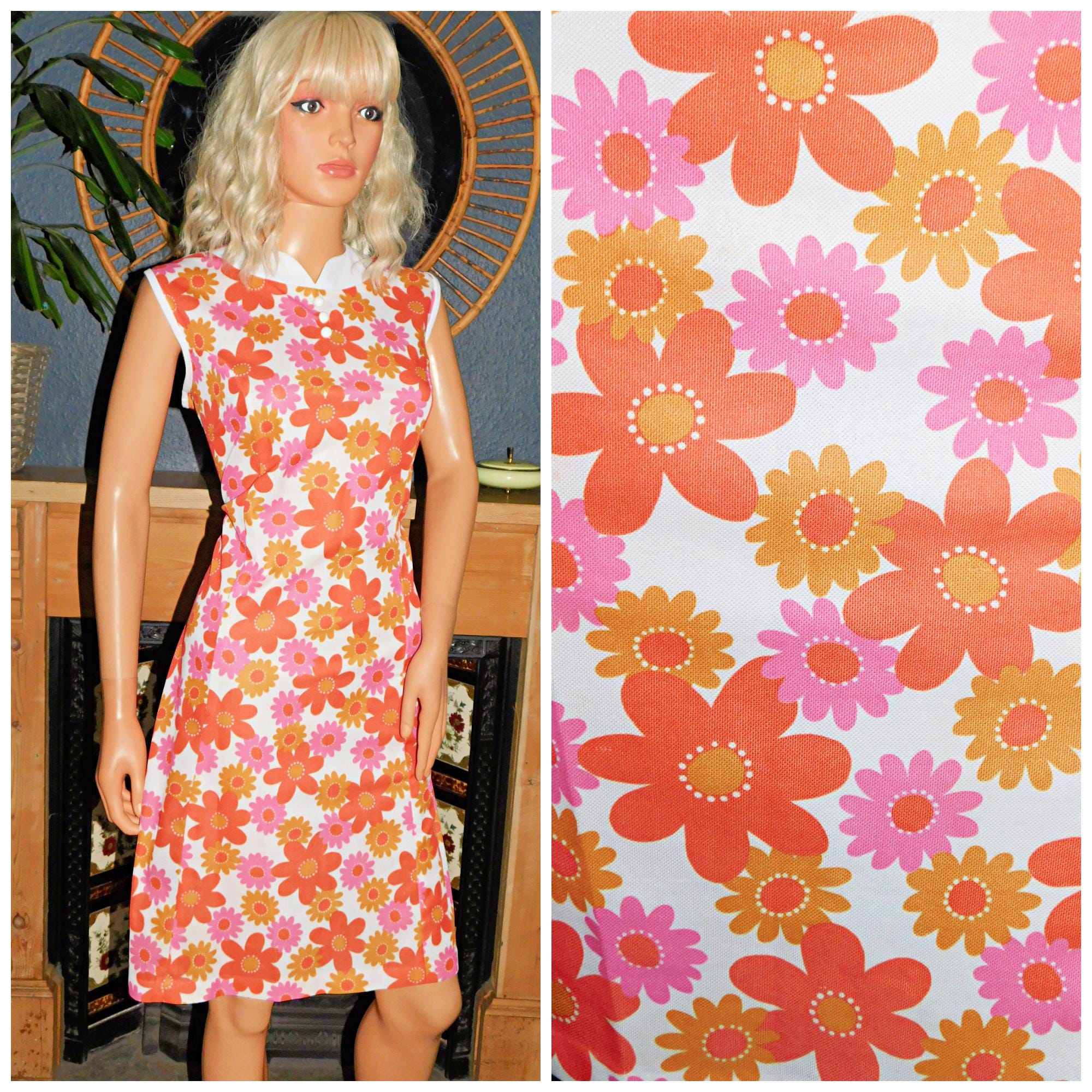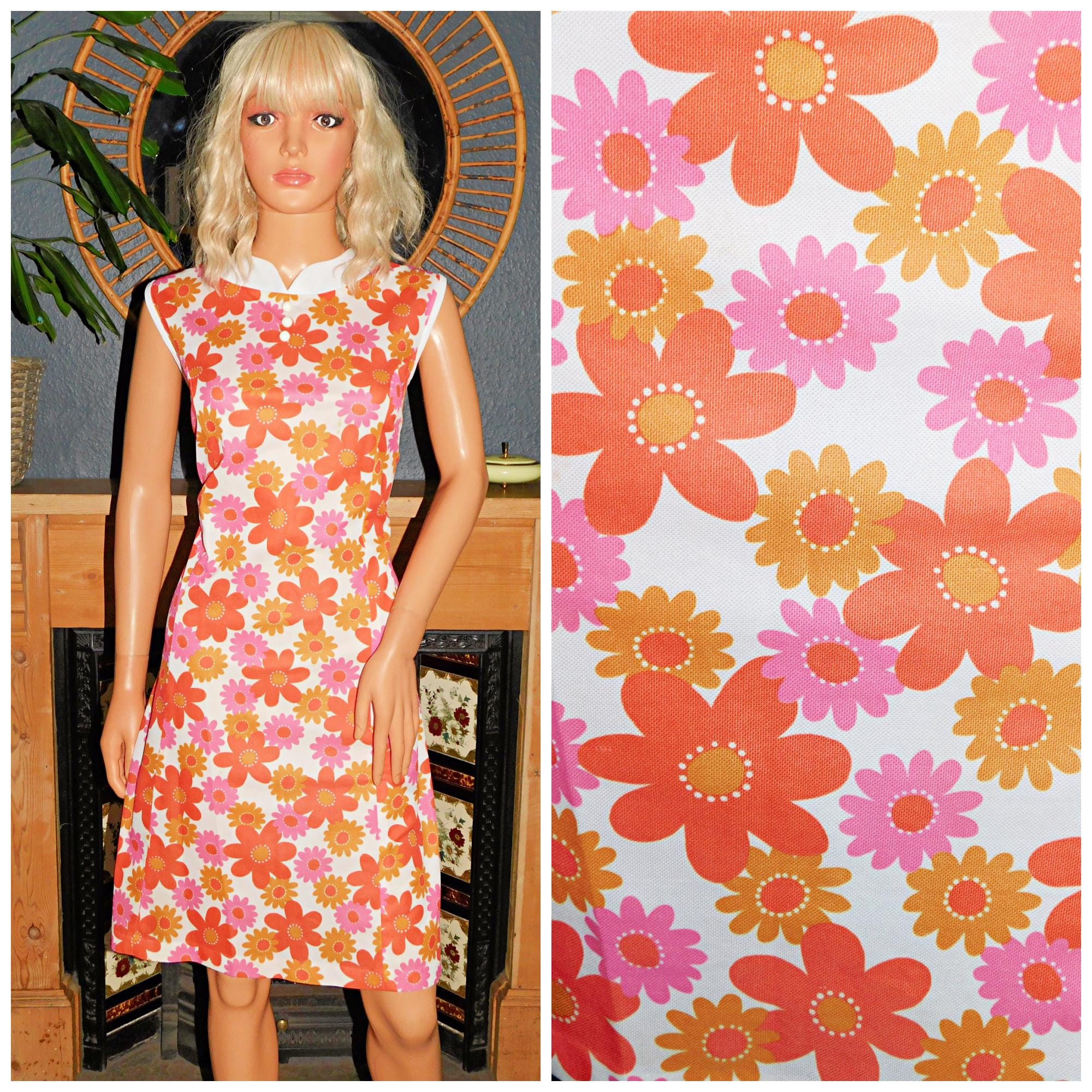 Original Sixties Mod Scooter dress in a orange/pink bold psychedelic/flower power print