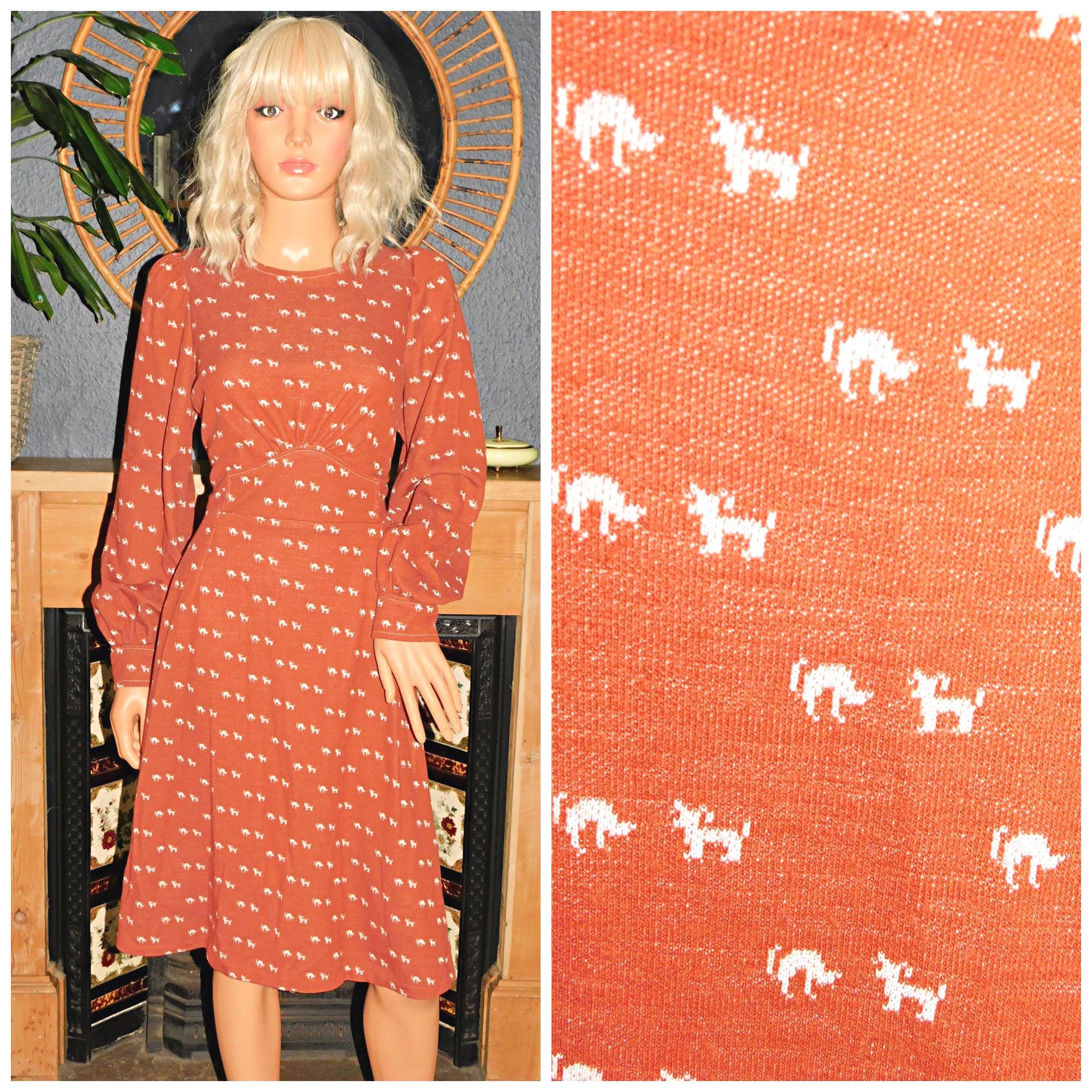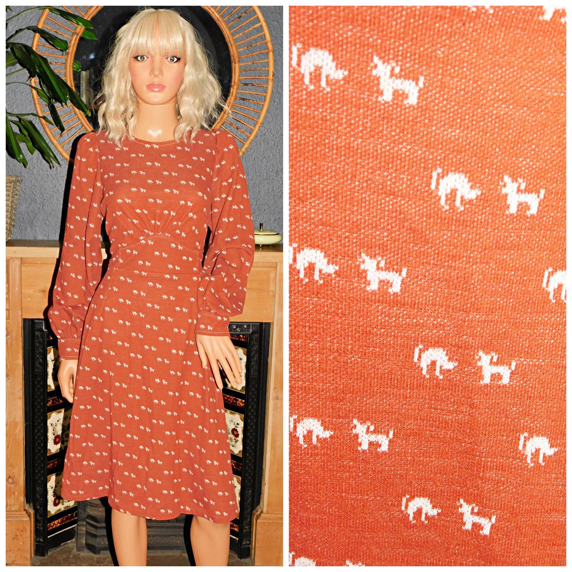 Vintage 70s Kitsch Tan NOVELTY DOG Print Boho Day Dress 14 16 M L 1970s Pat Farrell