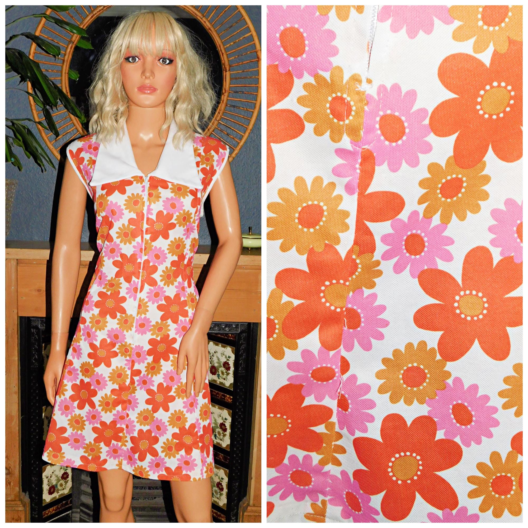 Vintage 60s Orange Pink FLOWER POWER PSYCHEDELIC Mod Scooter Dress 16-18 L Xl 1960s Modette Kitsch Contrast Collar