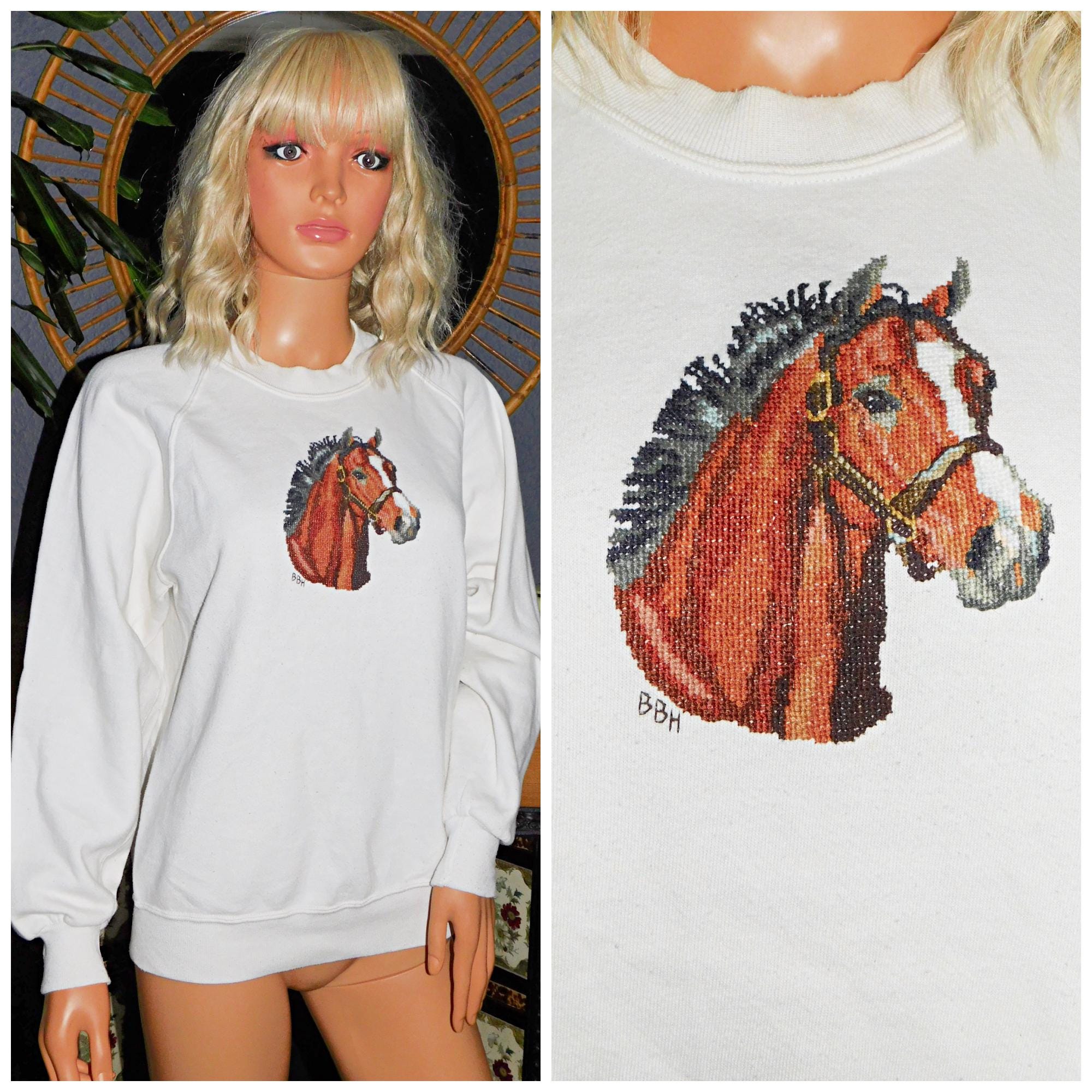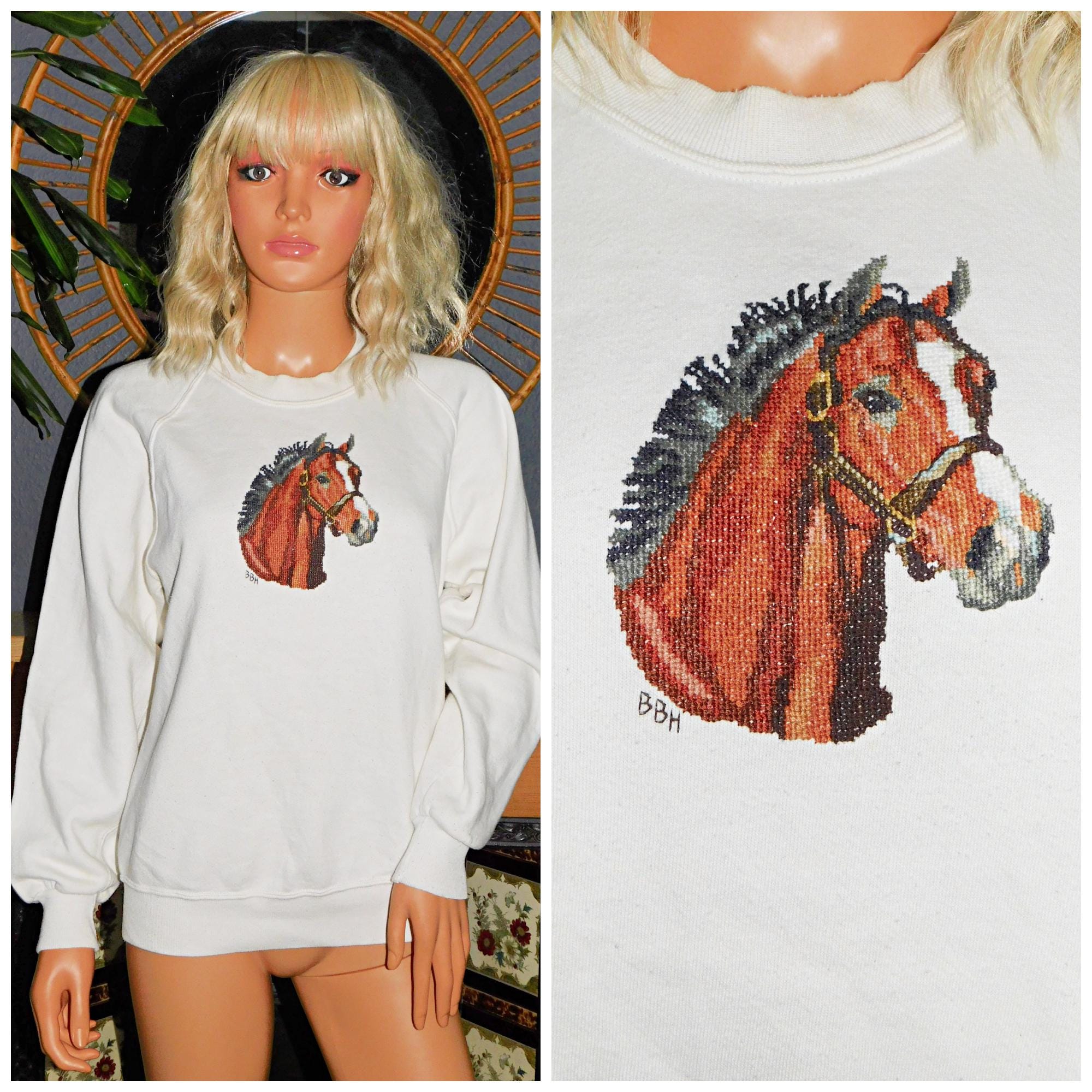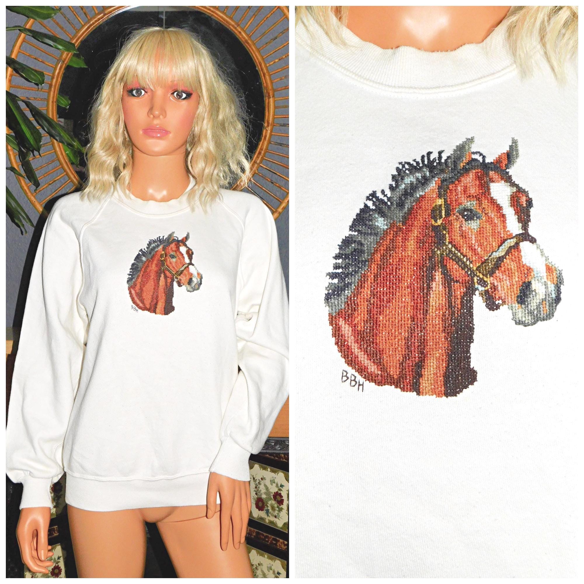 Vintage 80s 90s White EMBROIDERED HORSE Sweatshirt Xs S 1980s 1990s