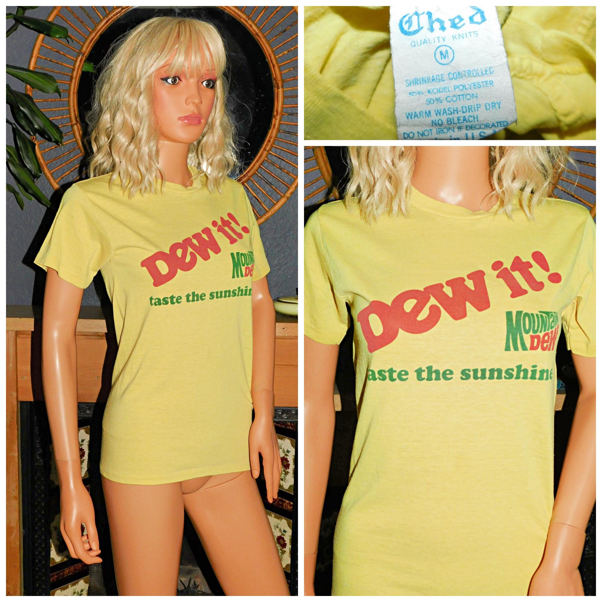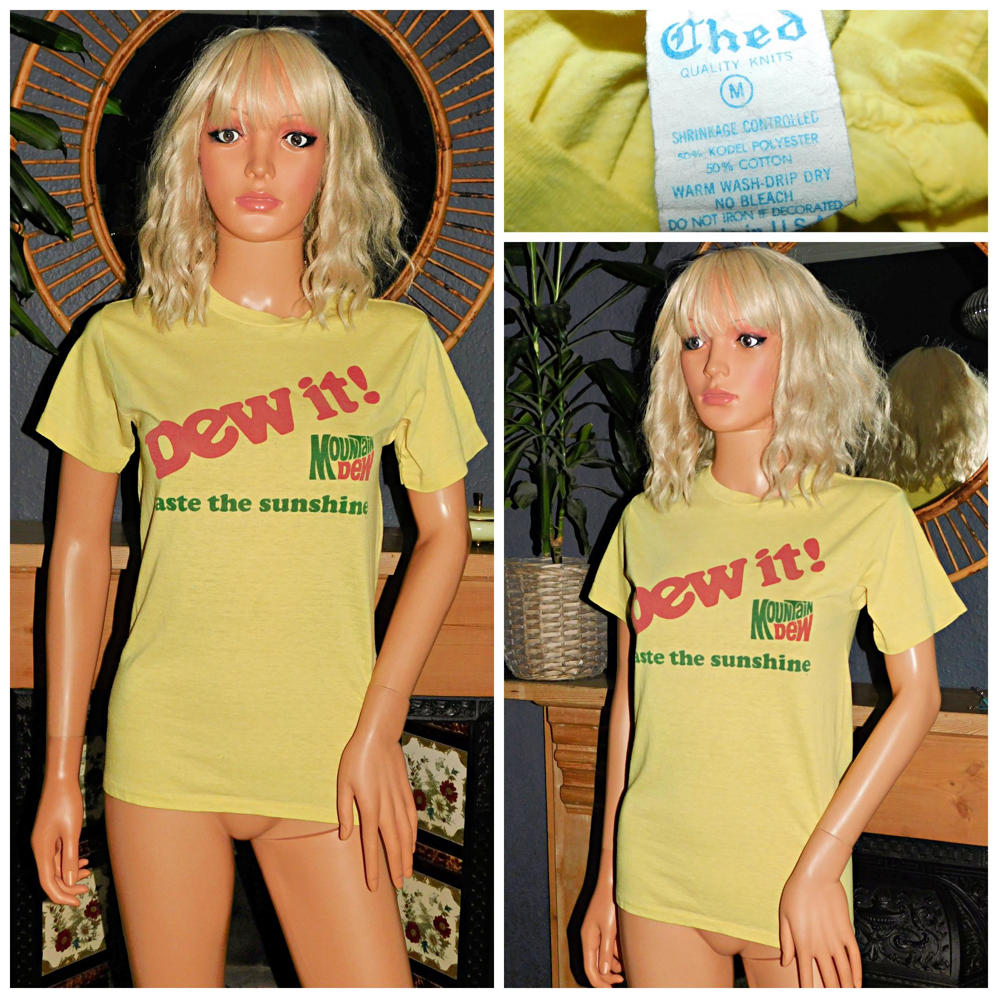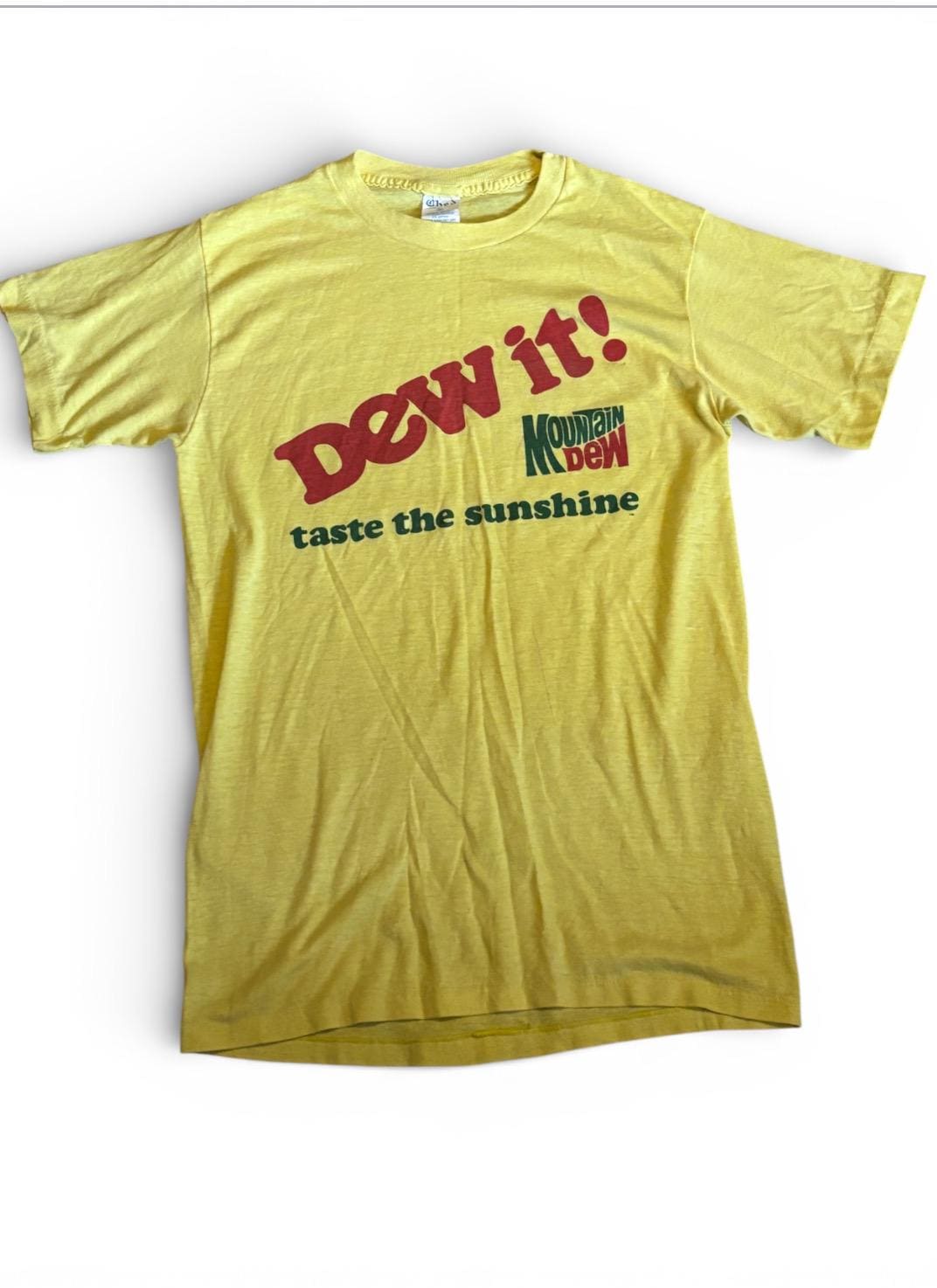 Super soft Seventies yellow T shirt in a 50/50 blend with red/green 'Dew it, taste the Sunshine' Mountain Dew graphic