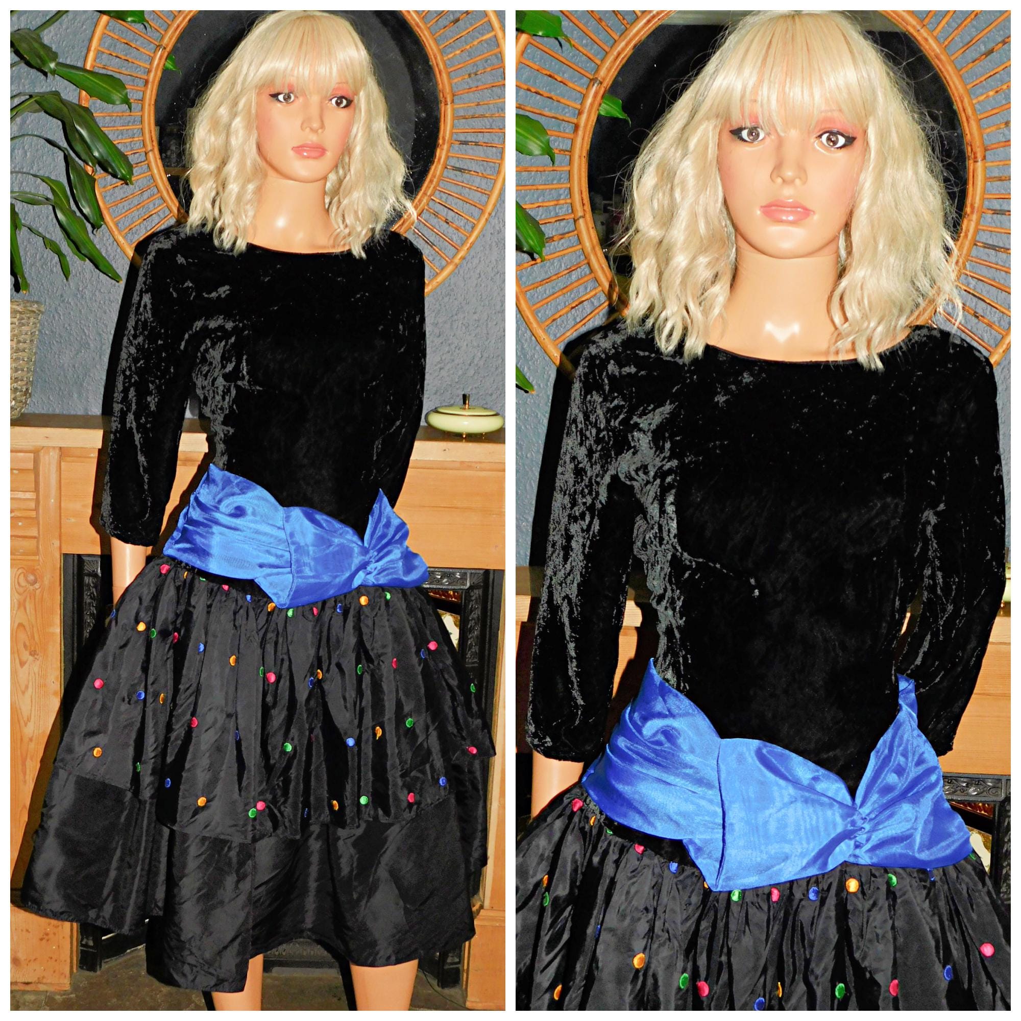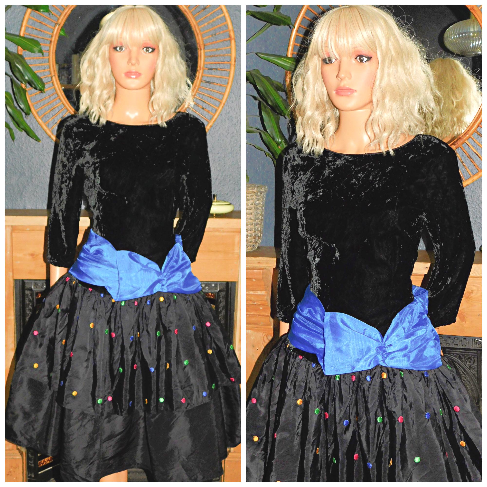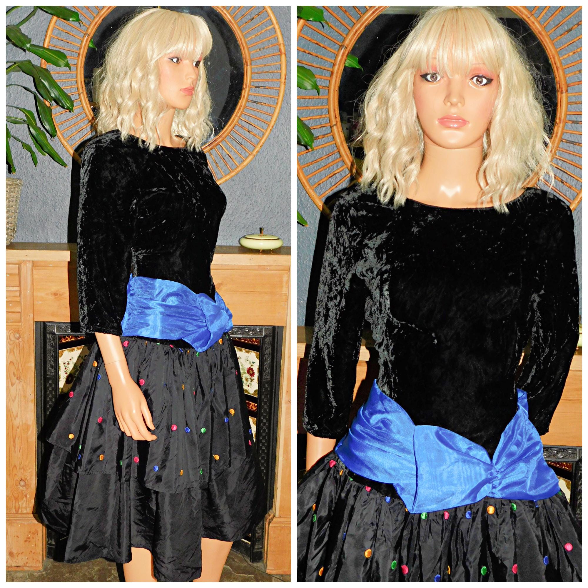 Vintage 1980s Black Velvet Blue BOW Front SPOTTY Prom Party Dress 10 S 1980s POLKA Dot