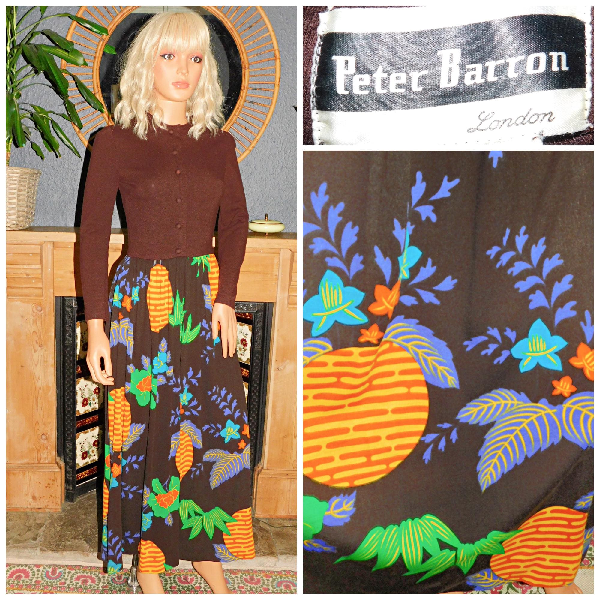 Vintage 70s Brown Orange Multicoloured CONTRAST GEOMETRIC Floral Print Midi Maxi Dress 8 S Xs 1970s Kitsch