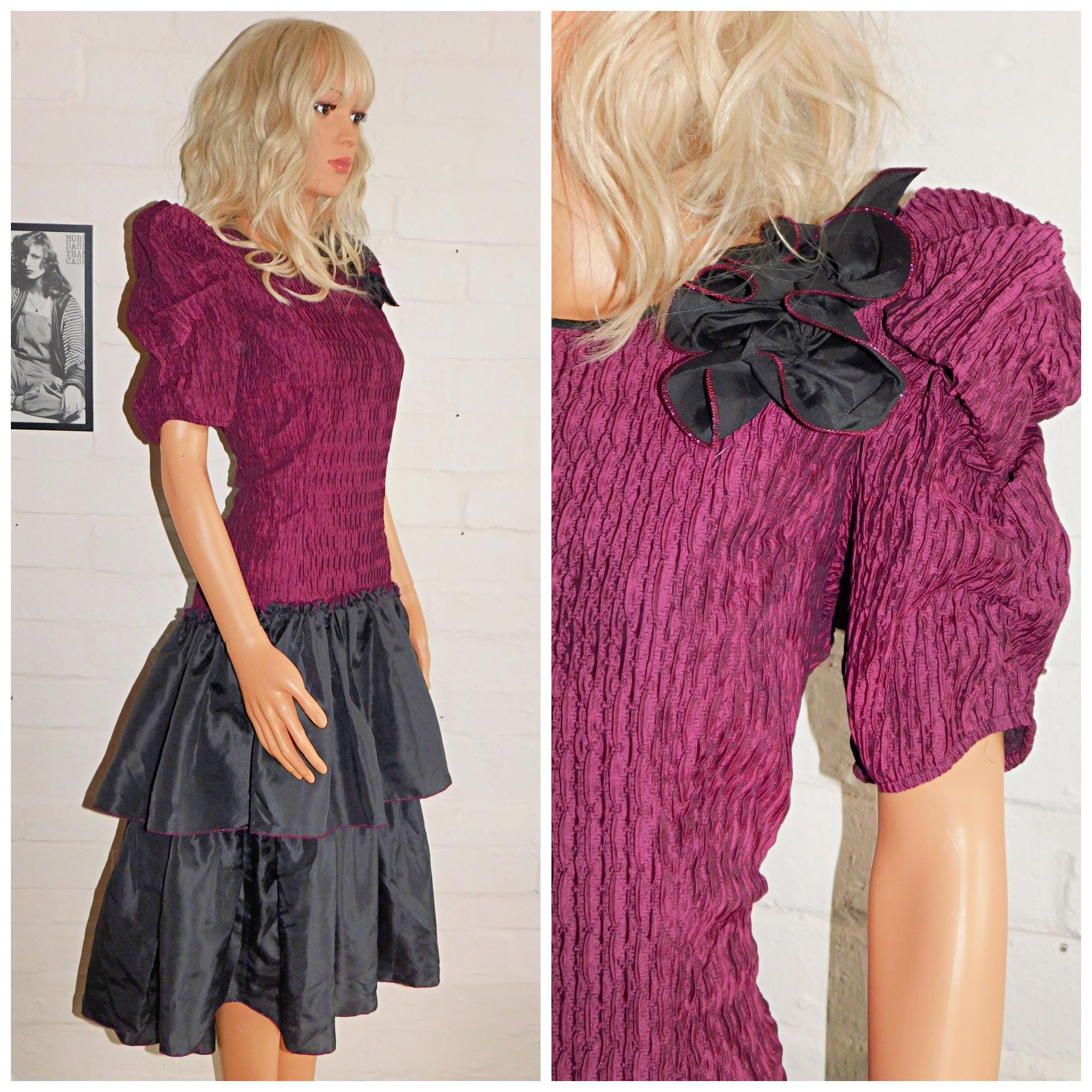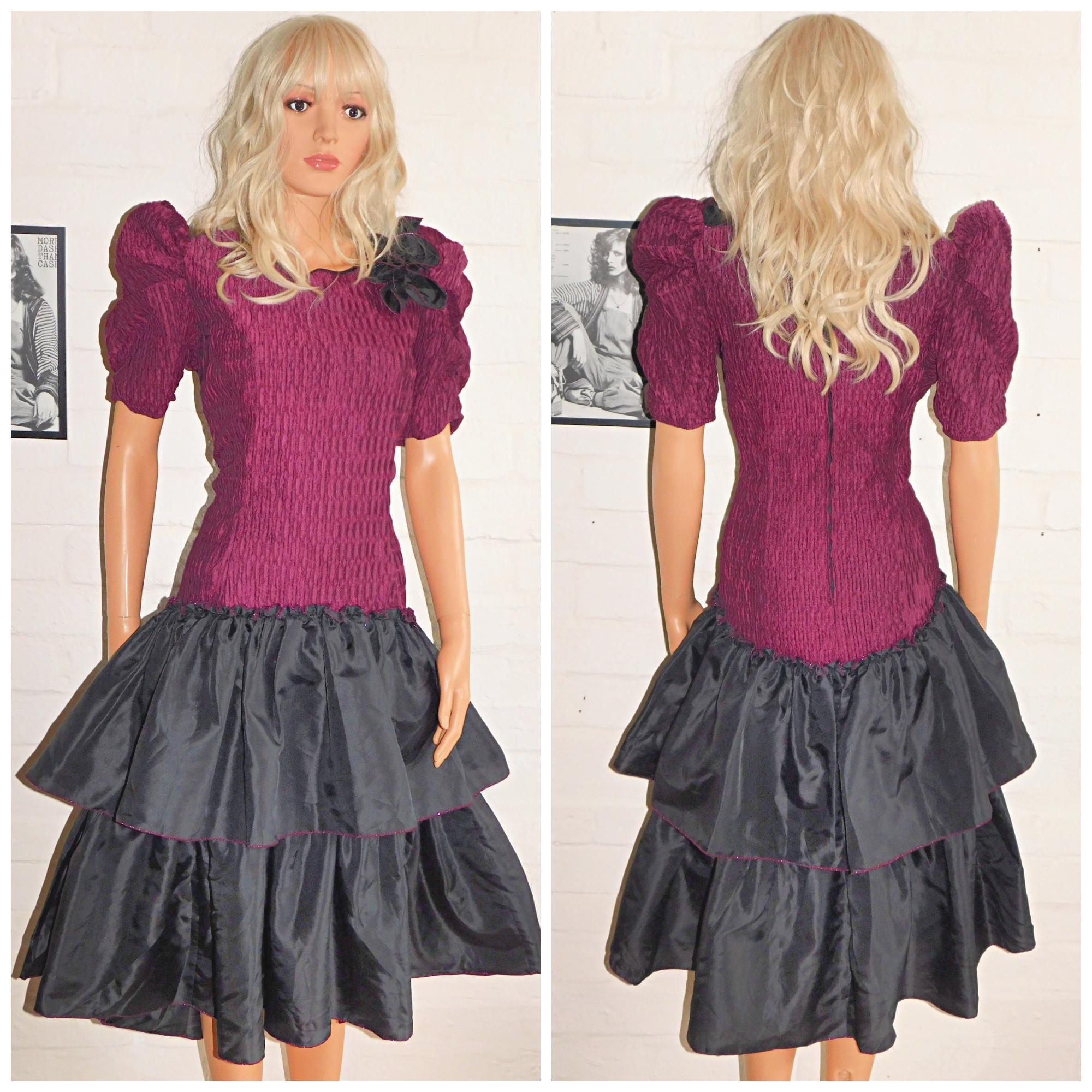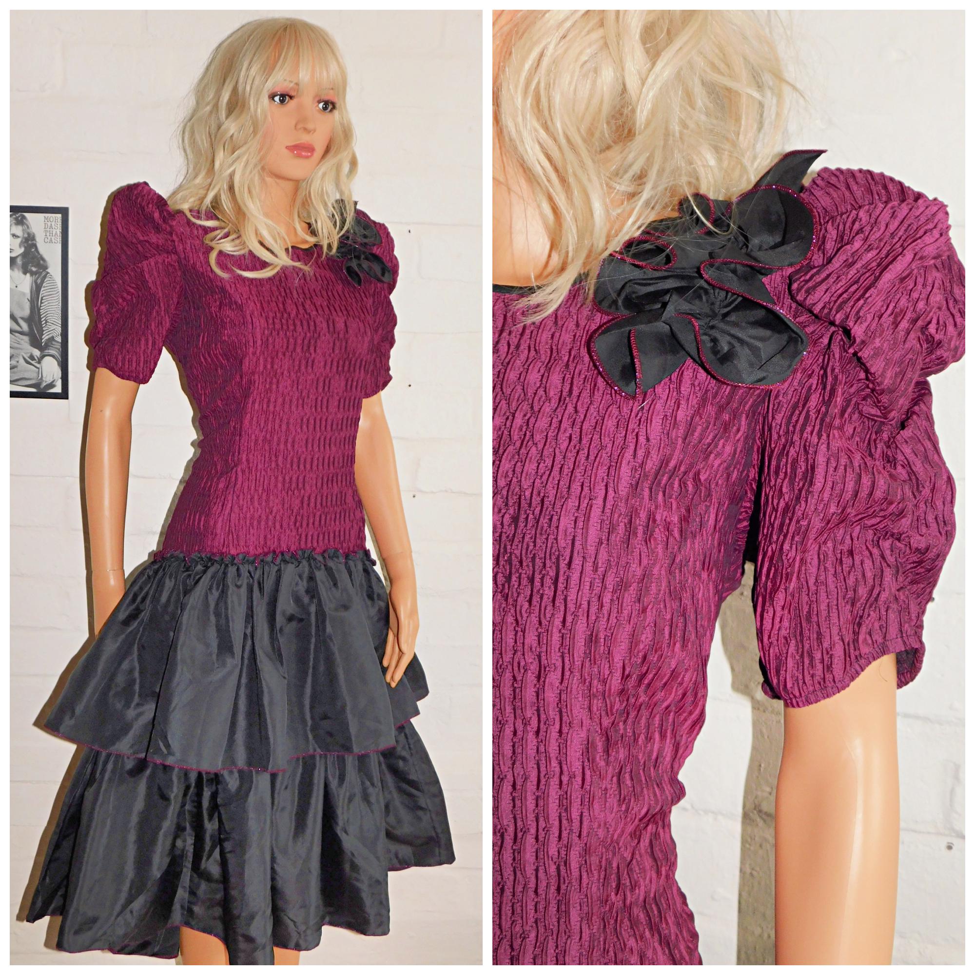 Vintage 80s Black Maroon Purple Drop Waist RARA Prom Party Dress 12 M 1980s Kitsch Cocktail Avant Garde Puff Slvd Pink