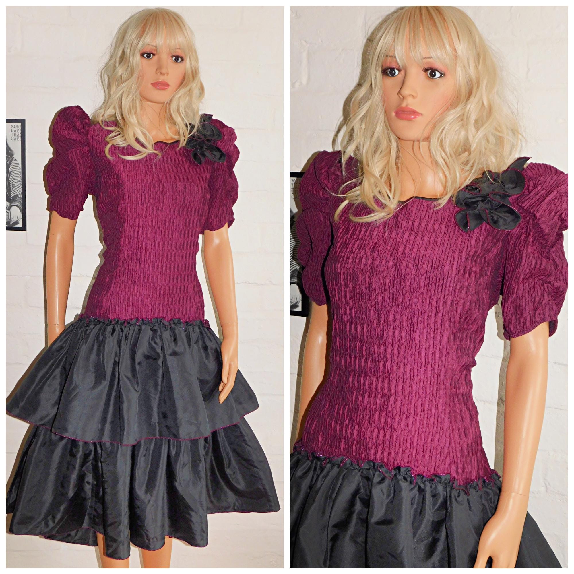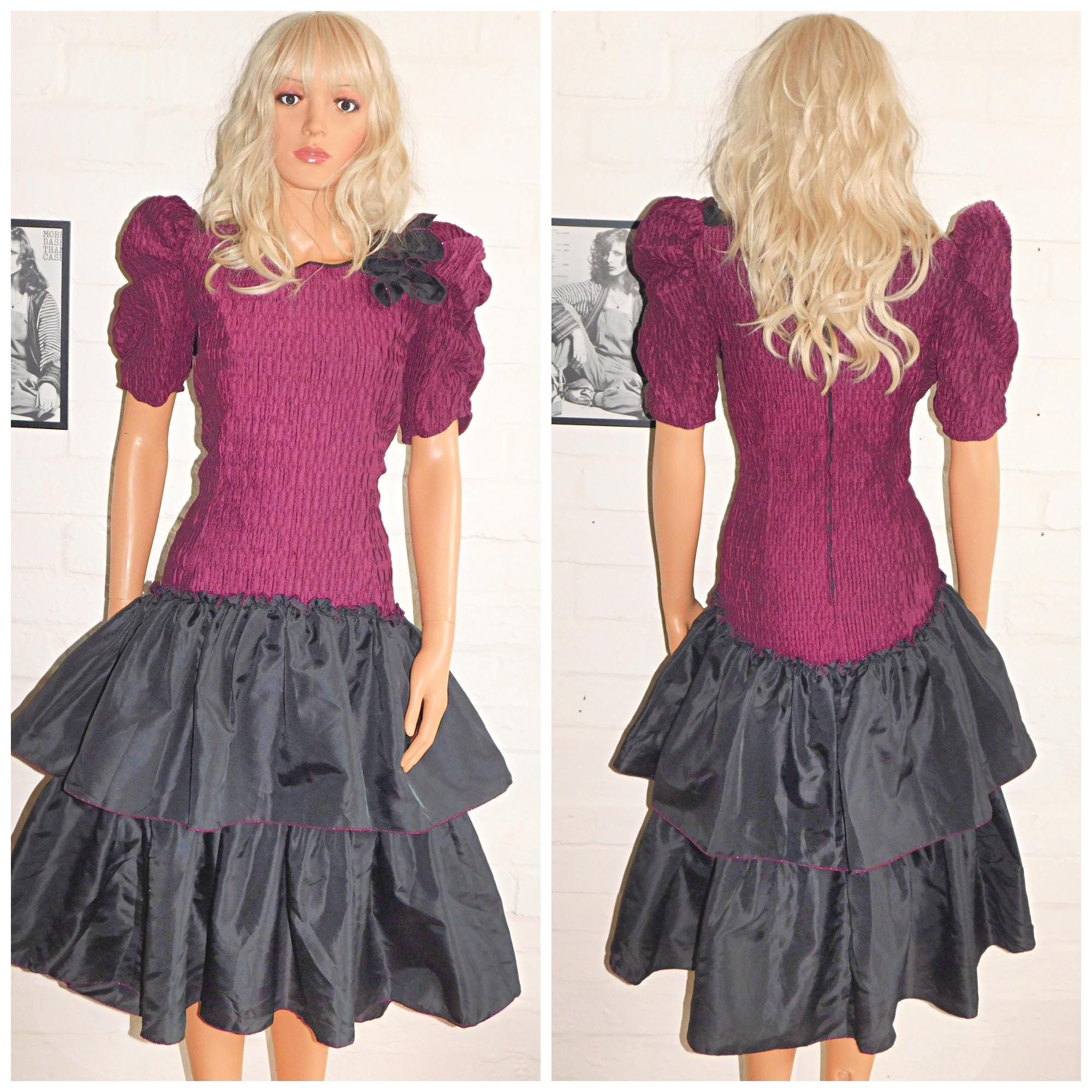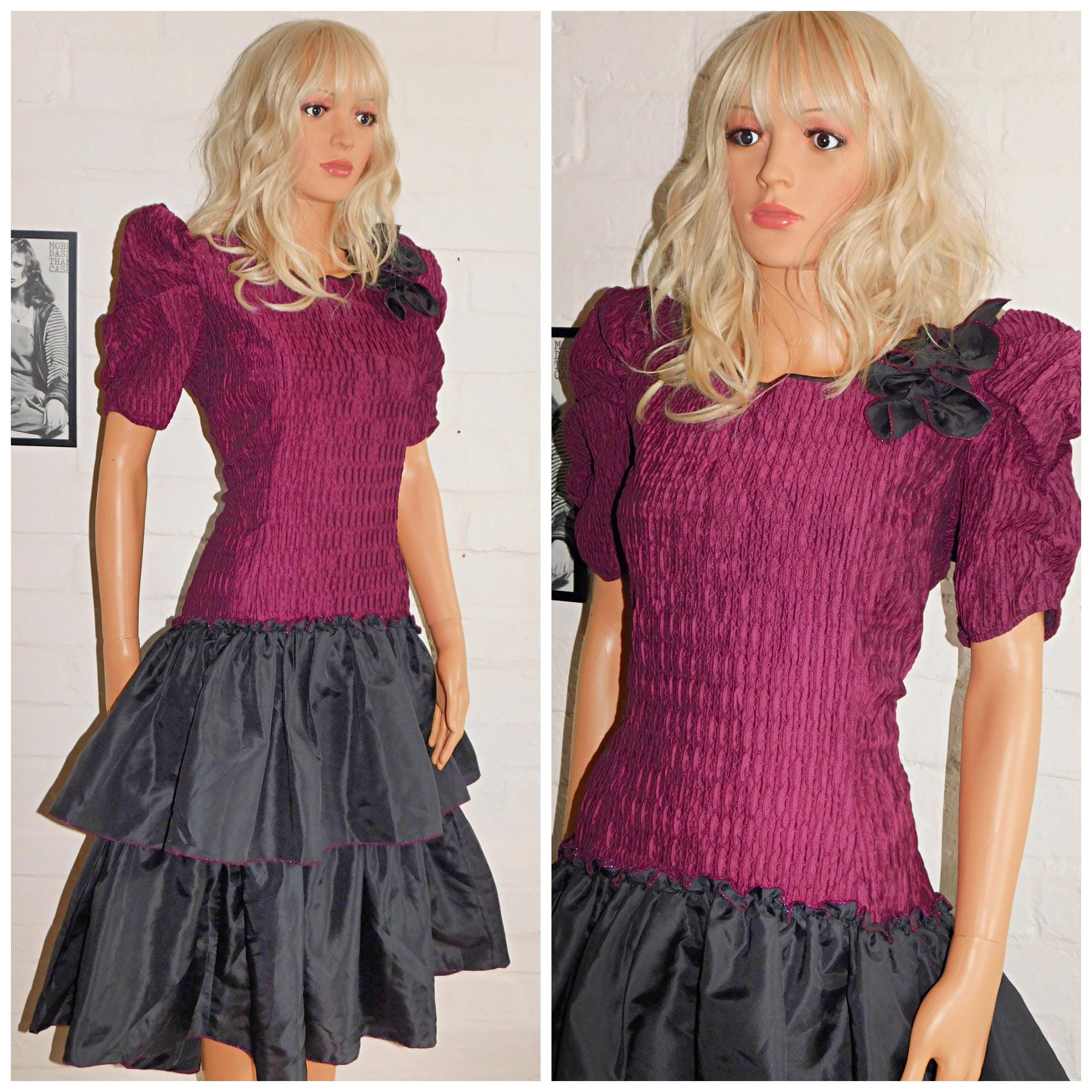 Vintage 80s Black Maroon Purple Drop Waist RARA Prom Party Dress 12 M 1980s Kitsch Cocktail Avant Garde Puff Slvd Pink