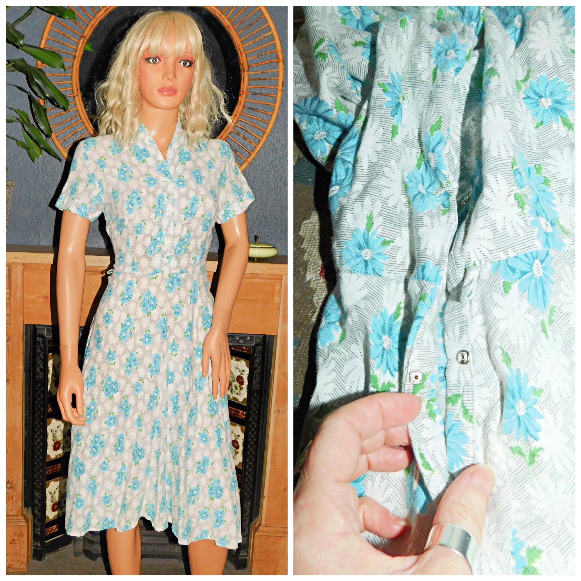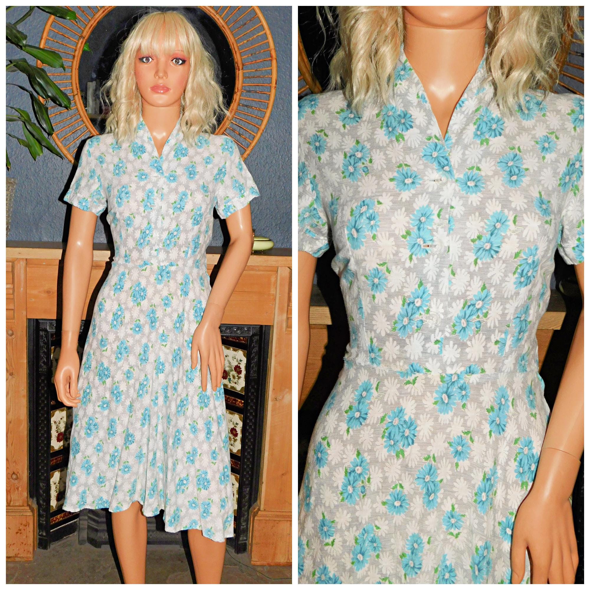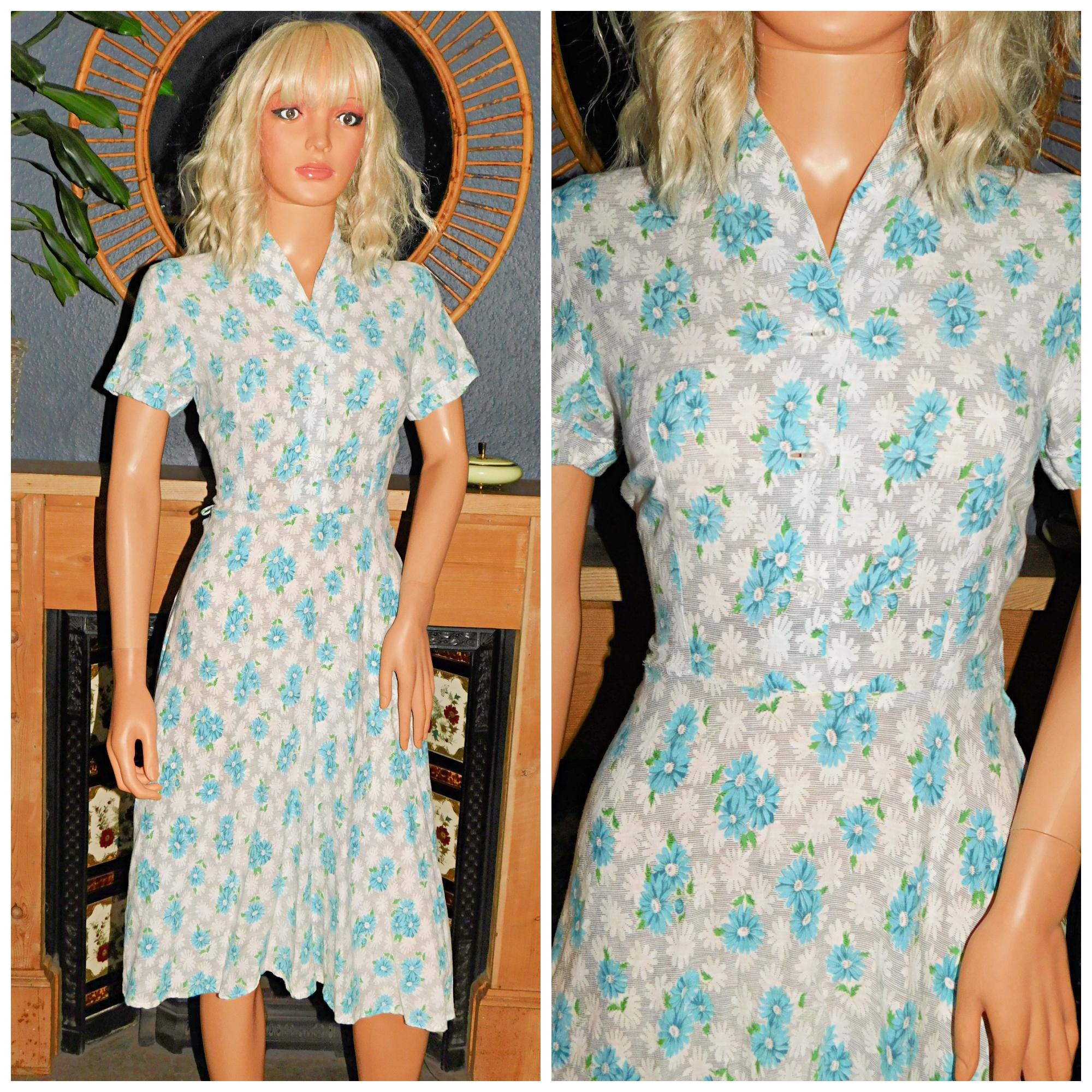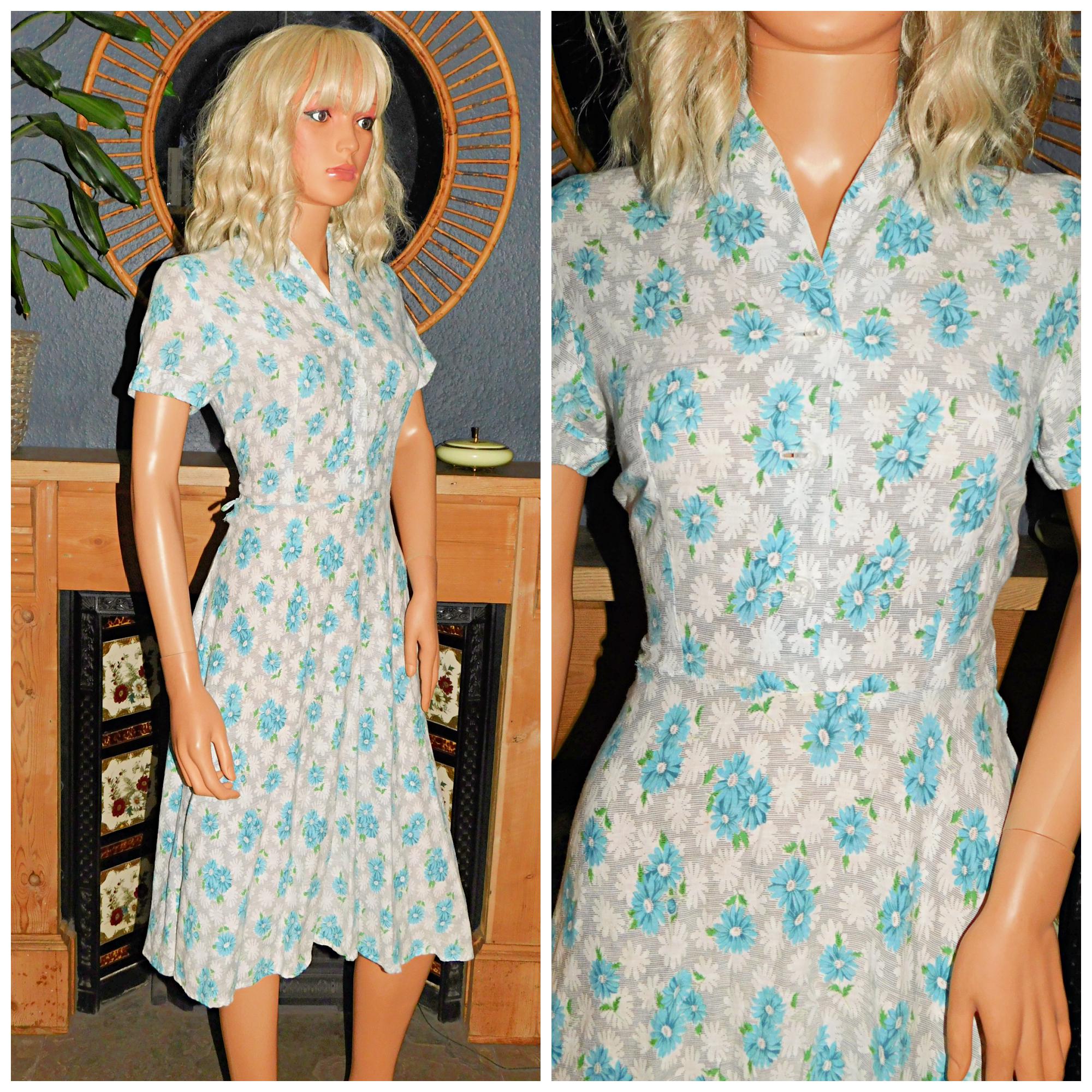 Vintage 40s Blue White Grey DAISY Floral Print Tea Dress 10 S 1940s