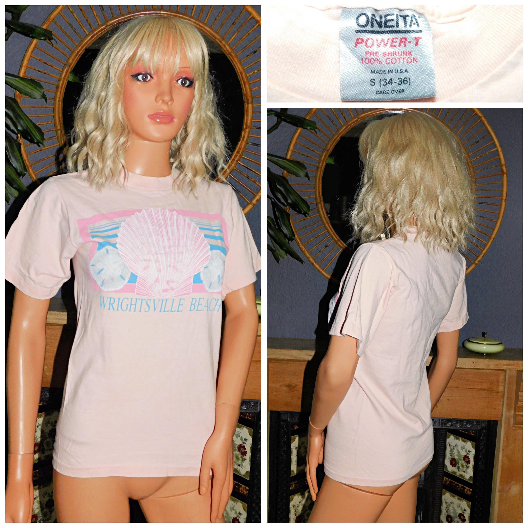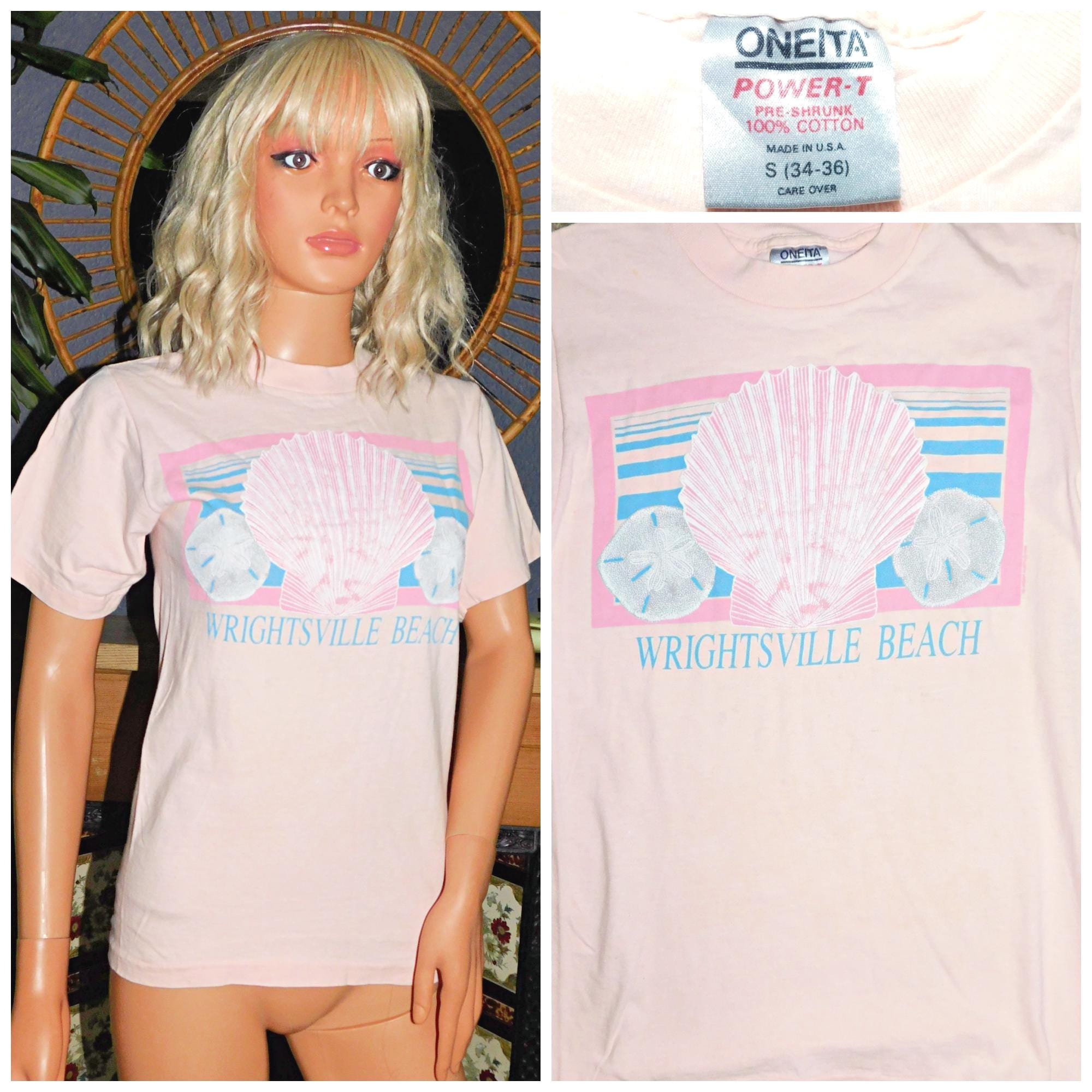 Vintage 80s 90s Soft Single Stitch Pink WRIGHTSVILLE BEACH Print T Shirt Xs 1990s Graphic Tee Sea Shell