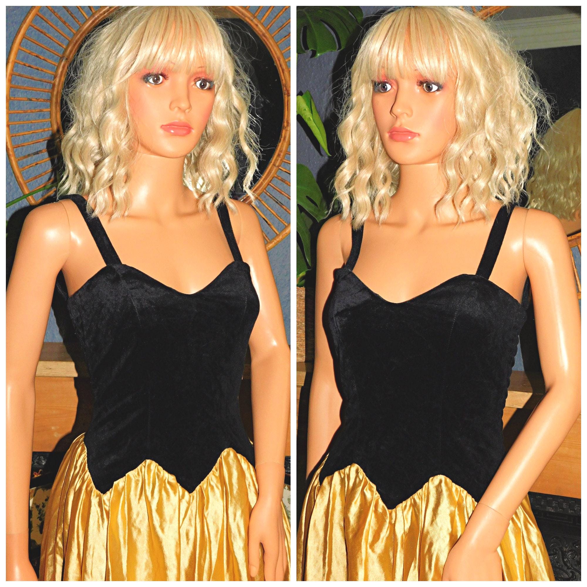 Vintage 80s Black Velvet METALLIC GOLD Yellow PROM Party Dress 10 12 S M 1980s Wet look Kitsch Detatchable Straps