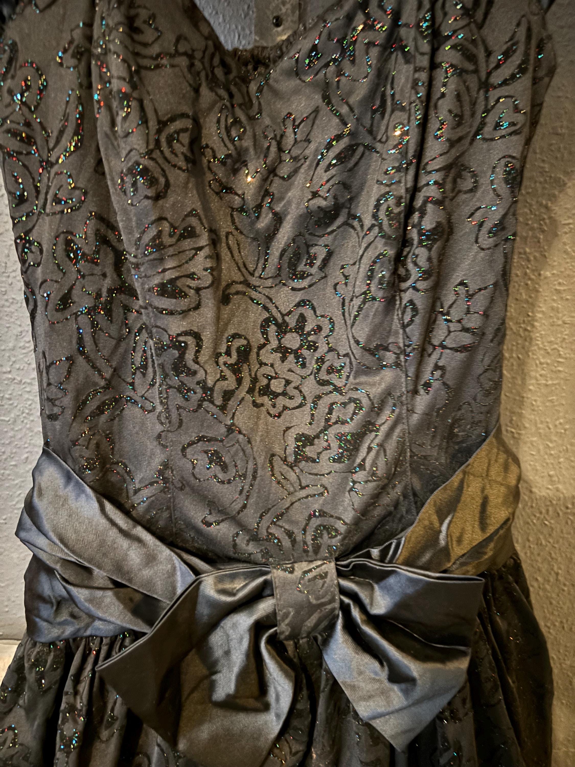 Classic 80s prom dress in black with a glittery velvet pattern and satin trim (pattern is different to the one pictured...please see last pic for actual pattern)