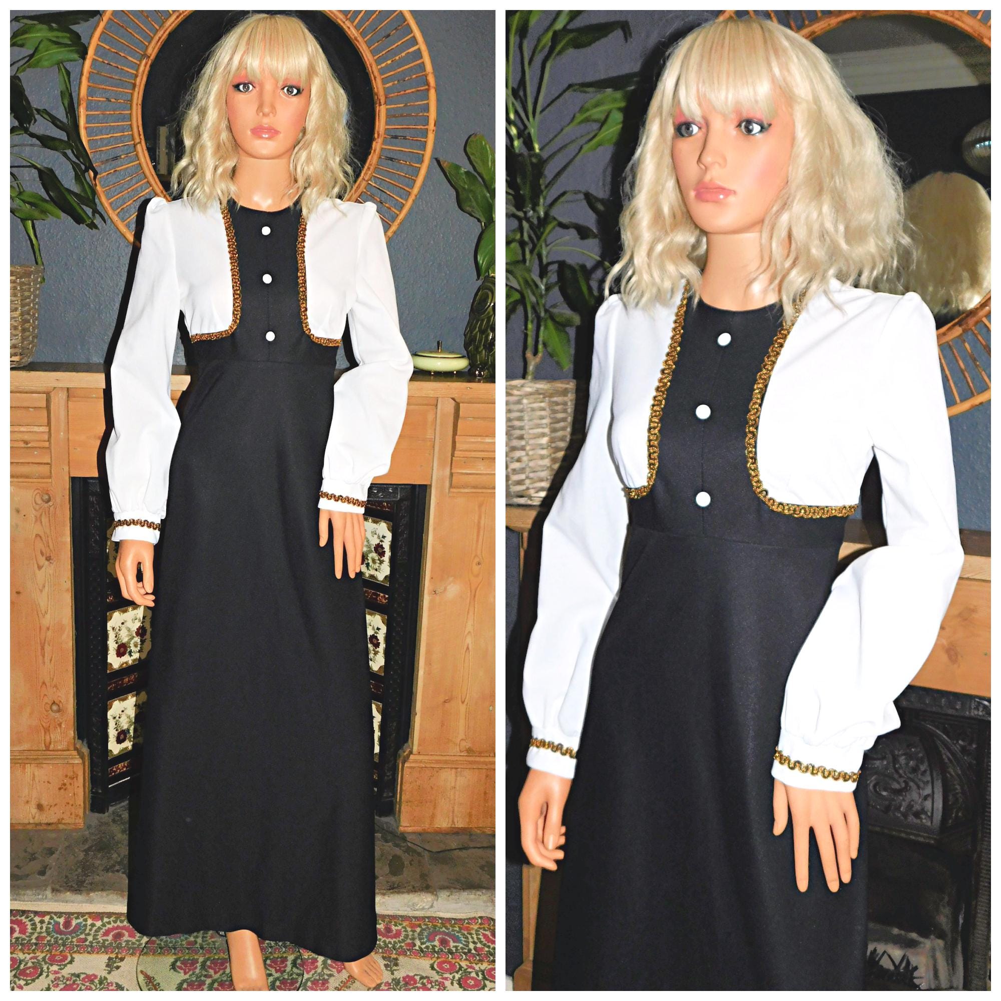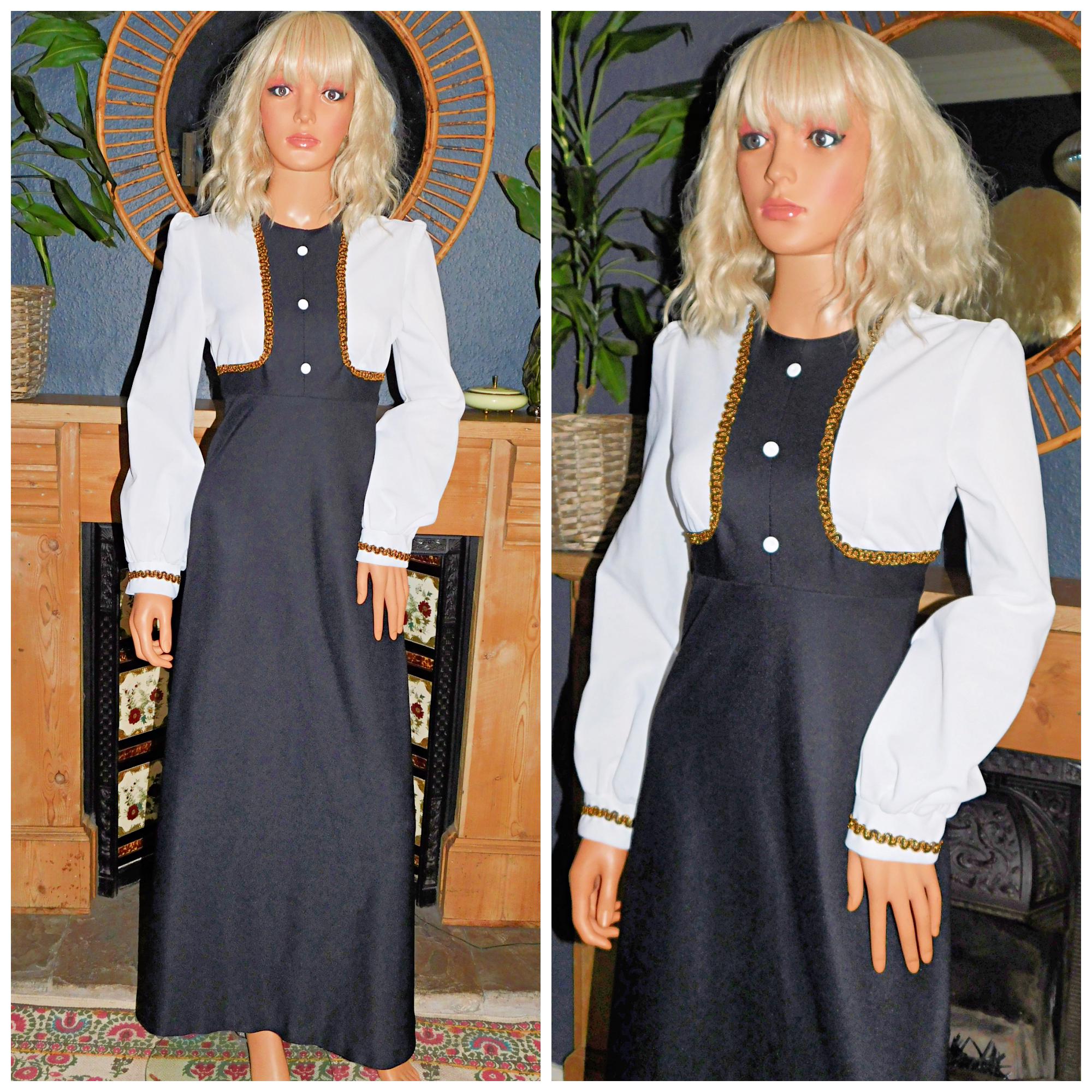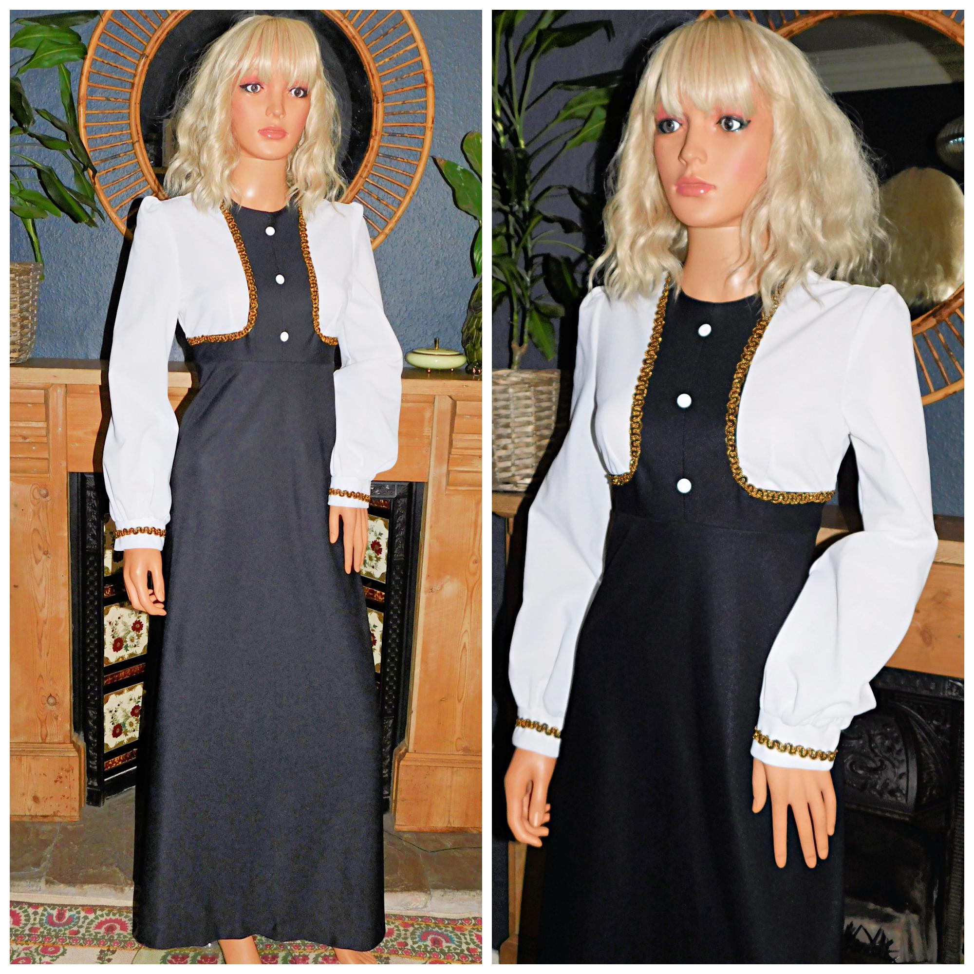 Vintage 70s Black White Gold GOTHIC Maxi Dress 12 M 1970s Kitsch