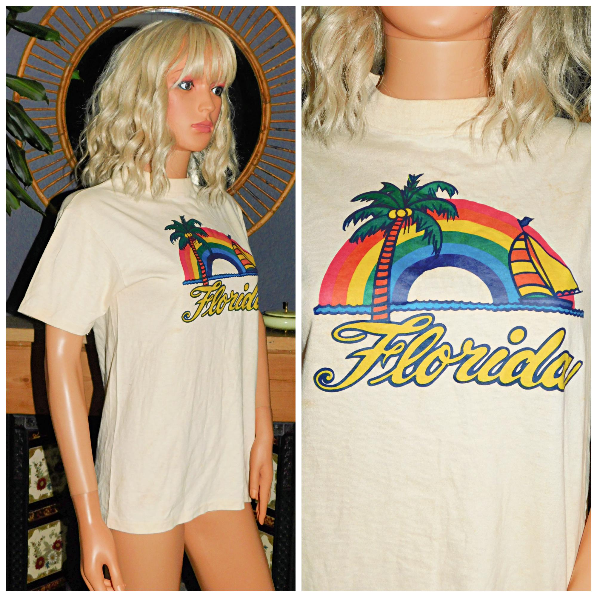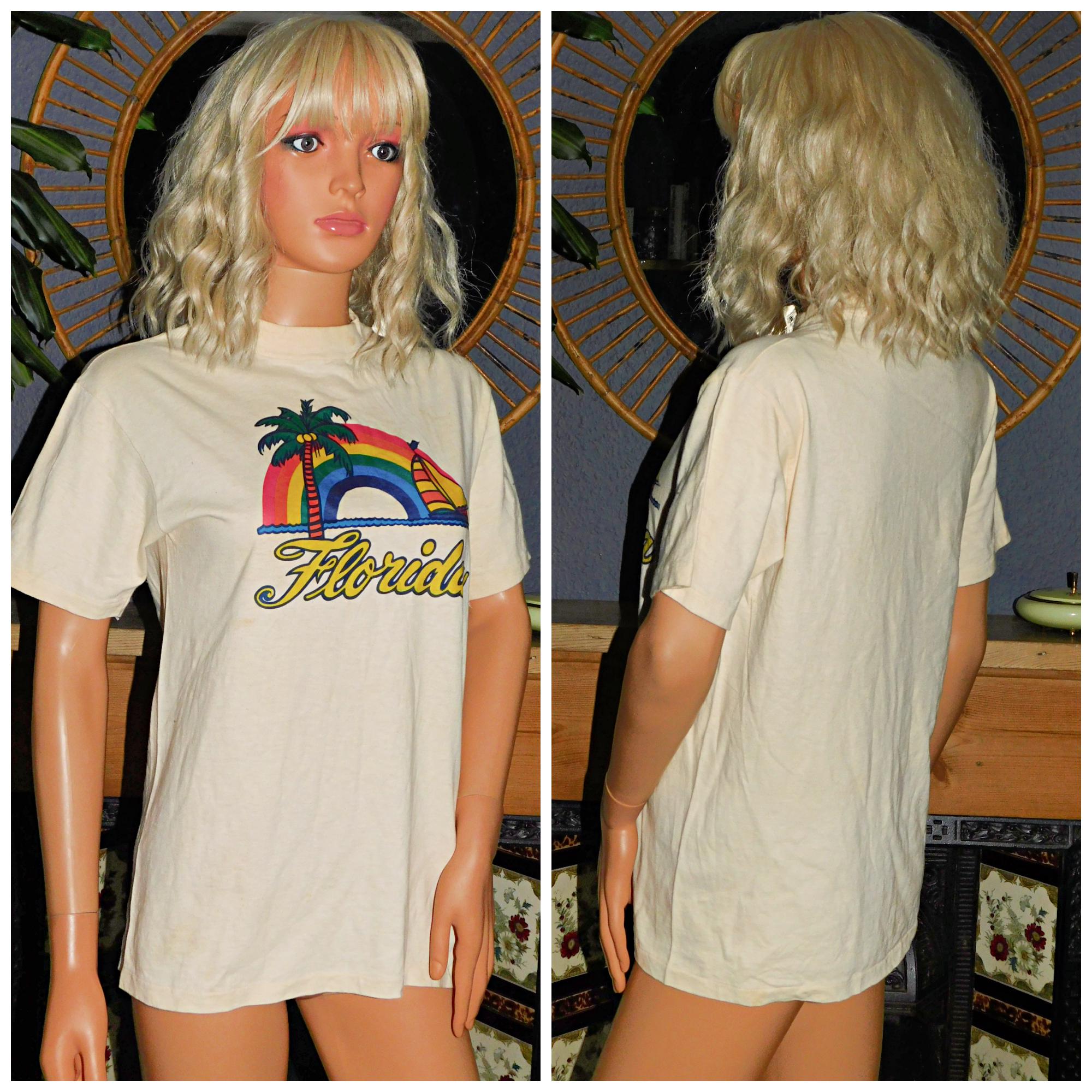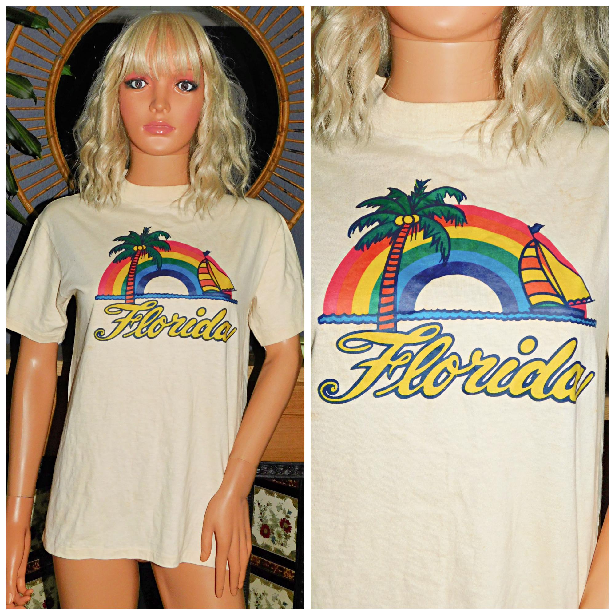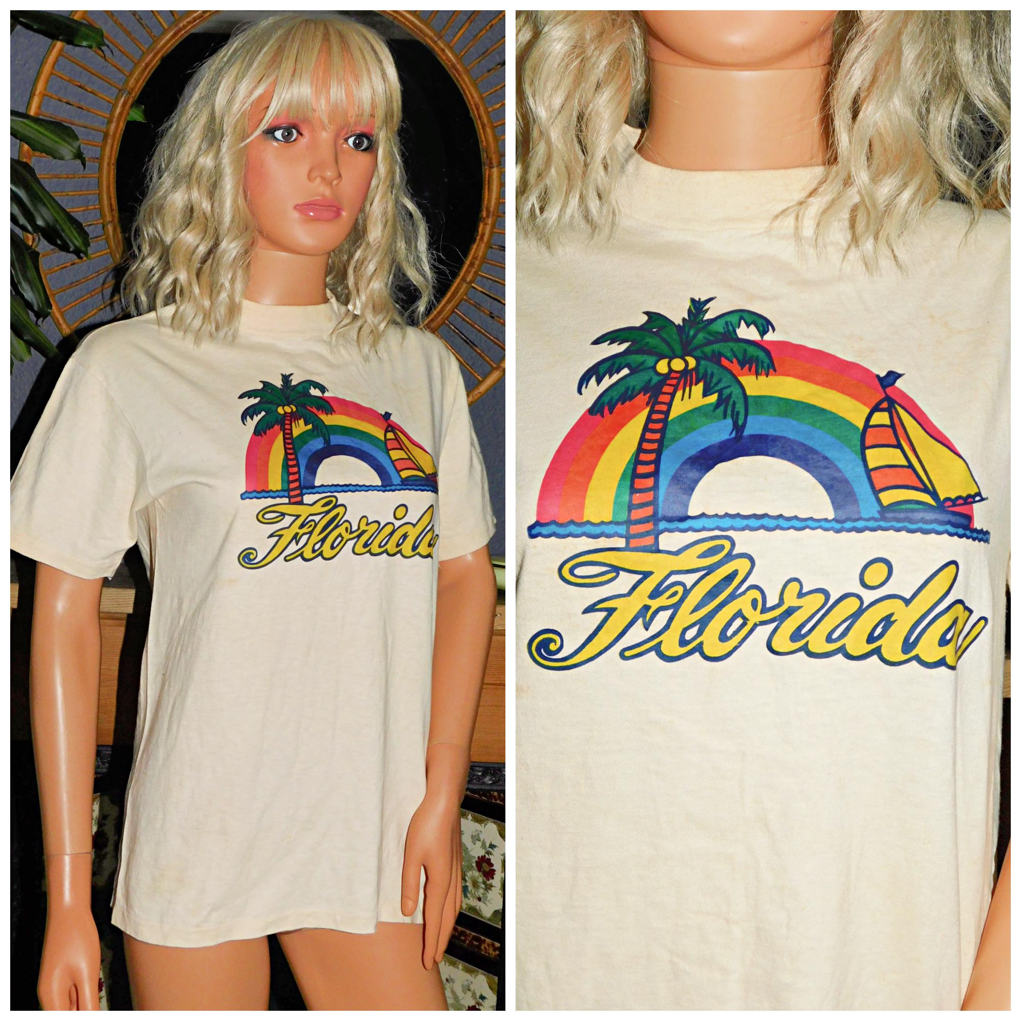 Vintage 80s Yellow Soft Single Stitch Florida Rainbow PALM TREE Print T Shirt S M Unisex Graphic Tee 1980s