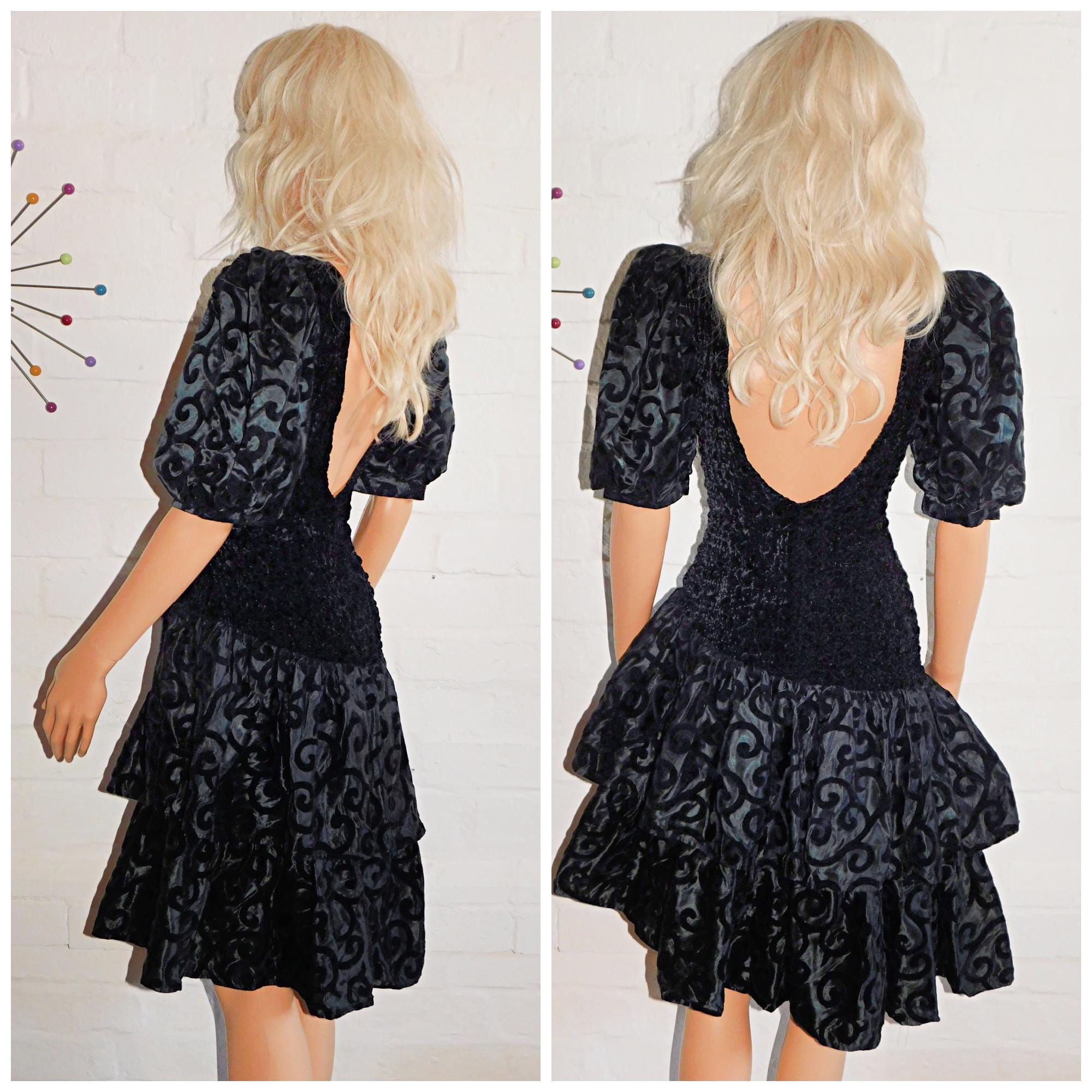 Classic Eighties prom dress in black with black patterned skirt/sleeves