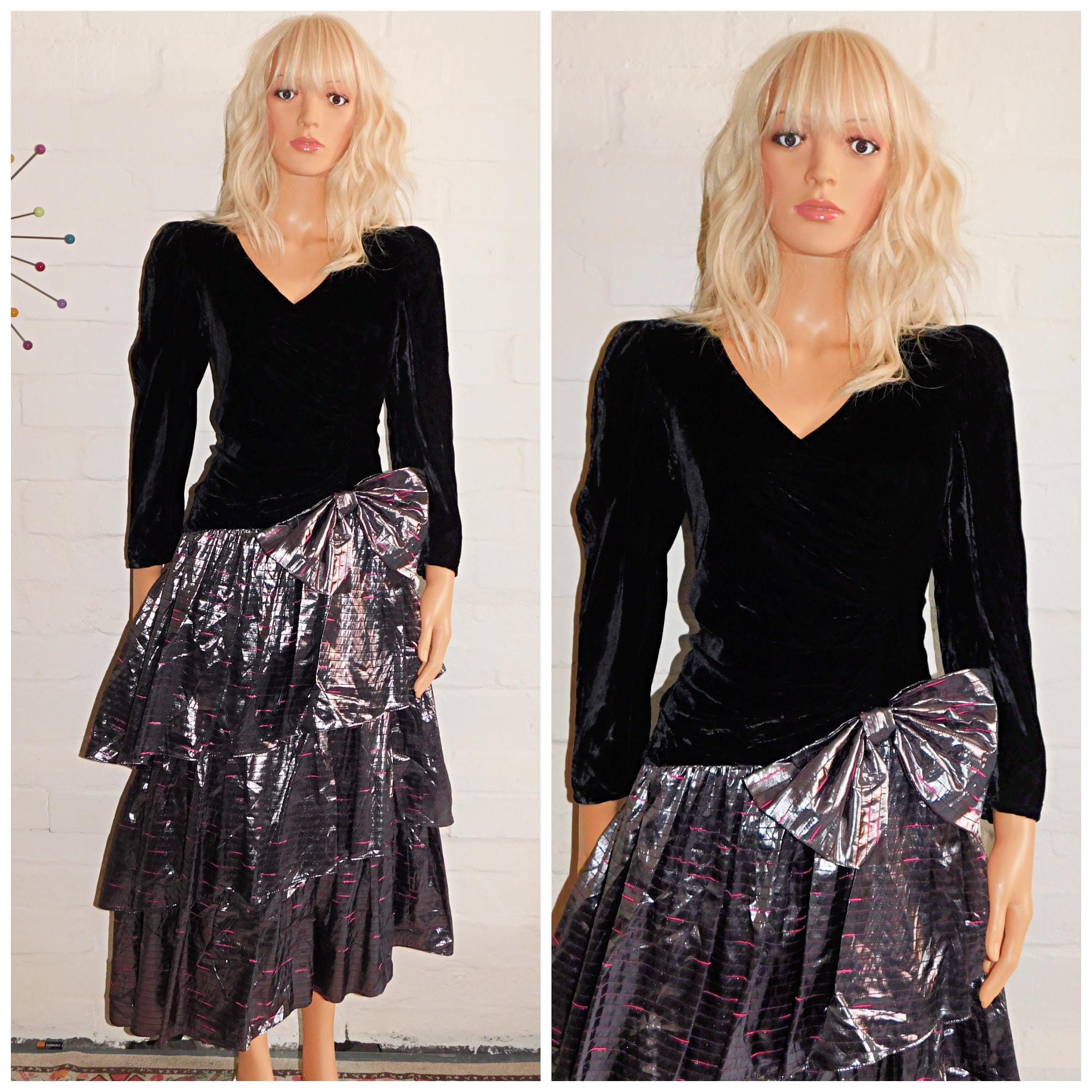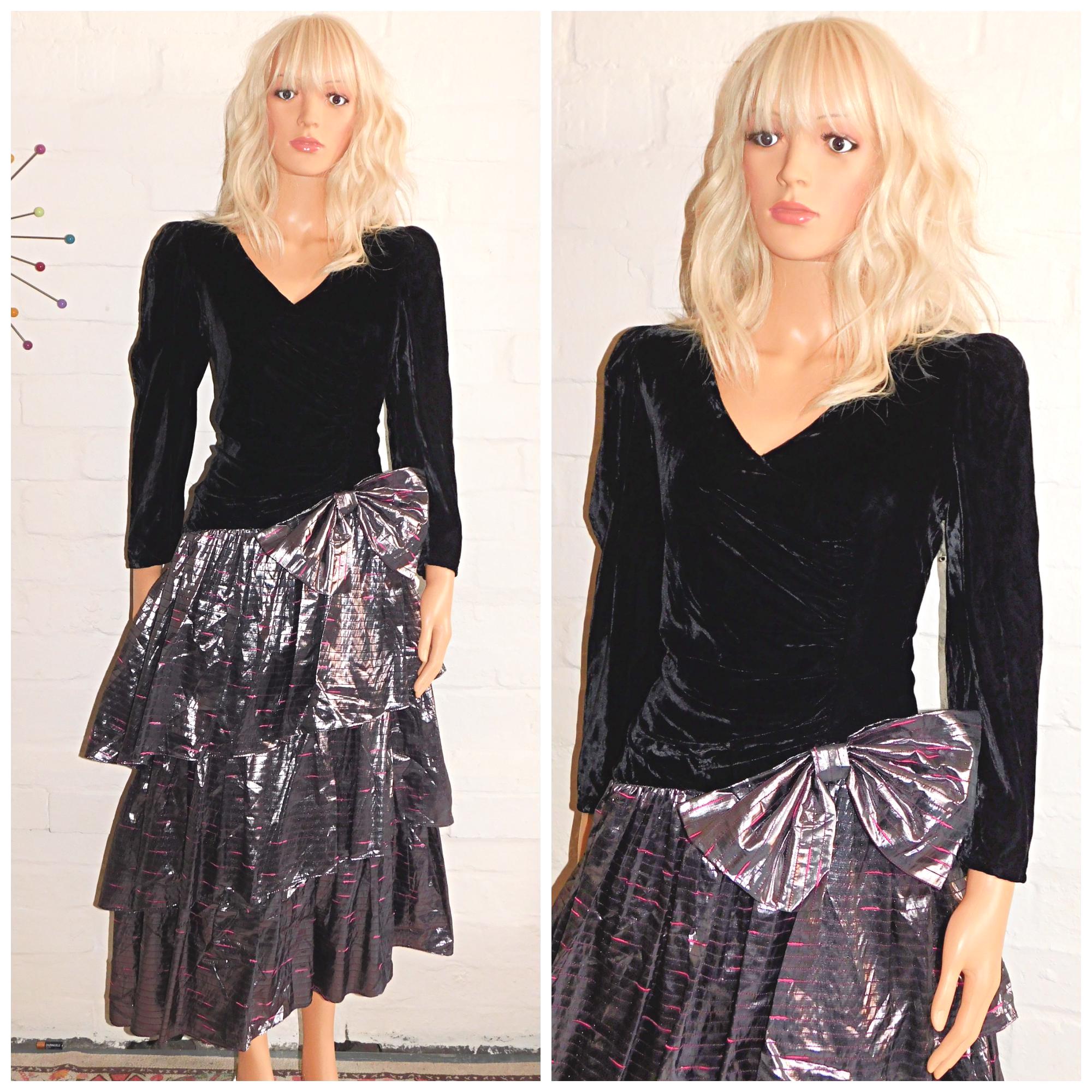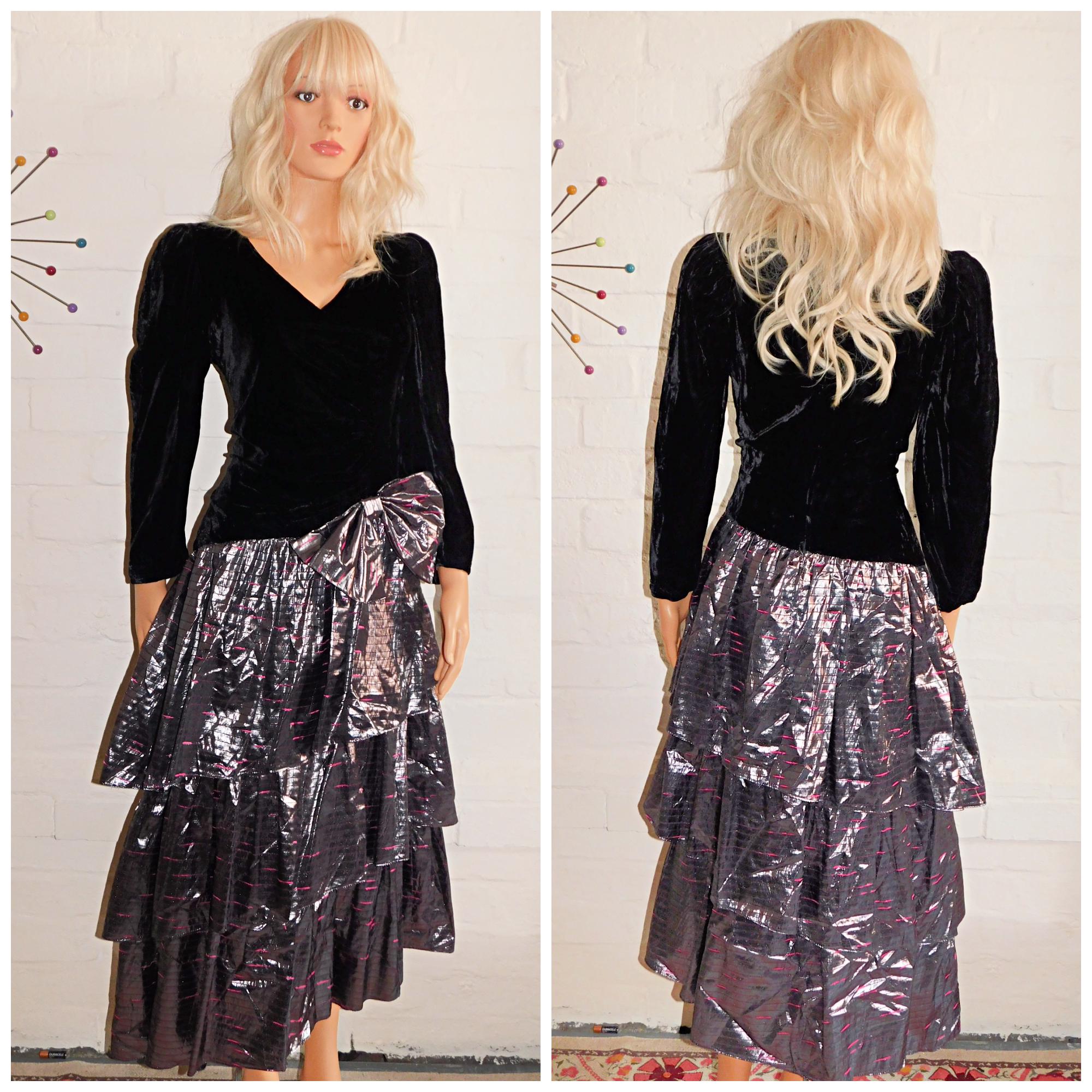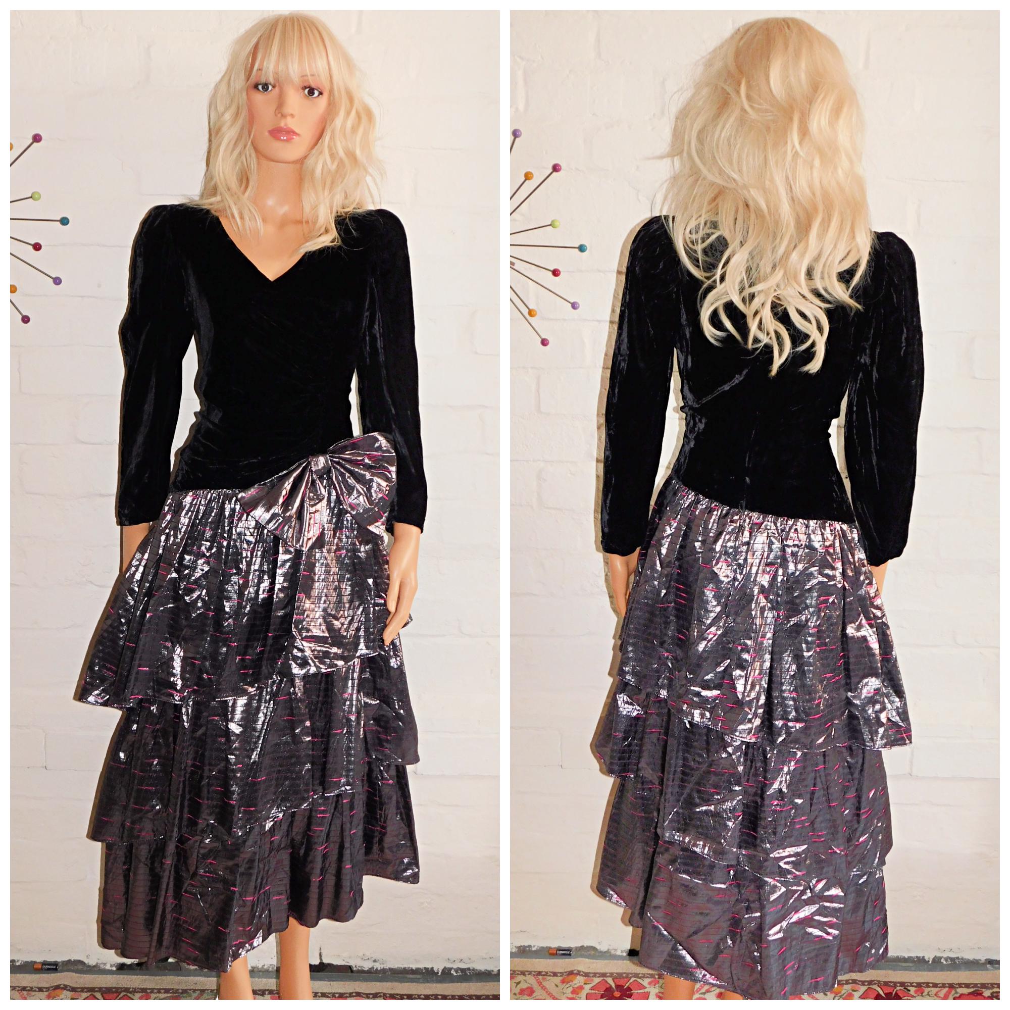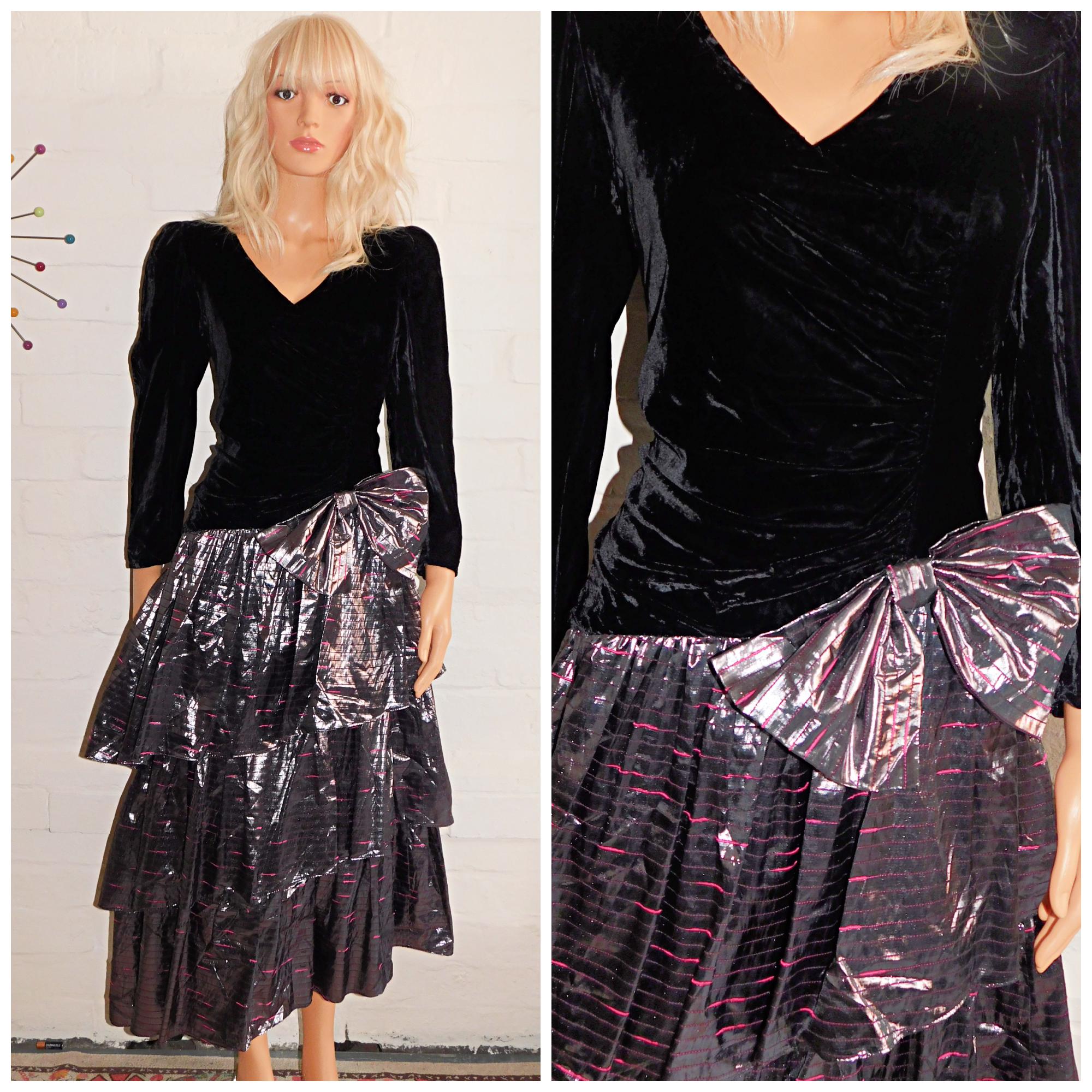 Absolutely Stunning Eighties prom/party dress in black velvet and metallic silver with hot pink stripes/flecks! (Classic Eighties)