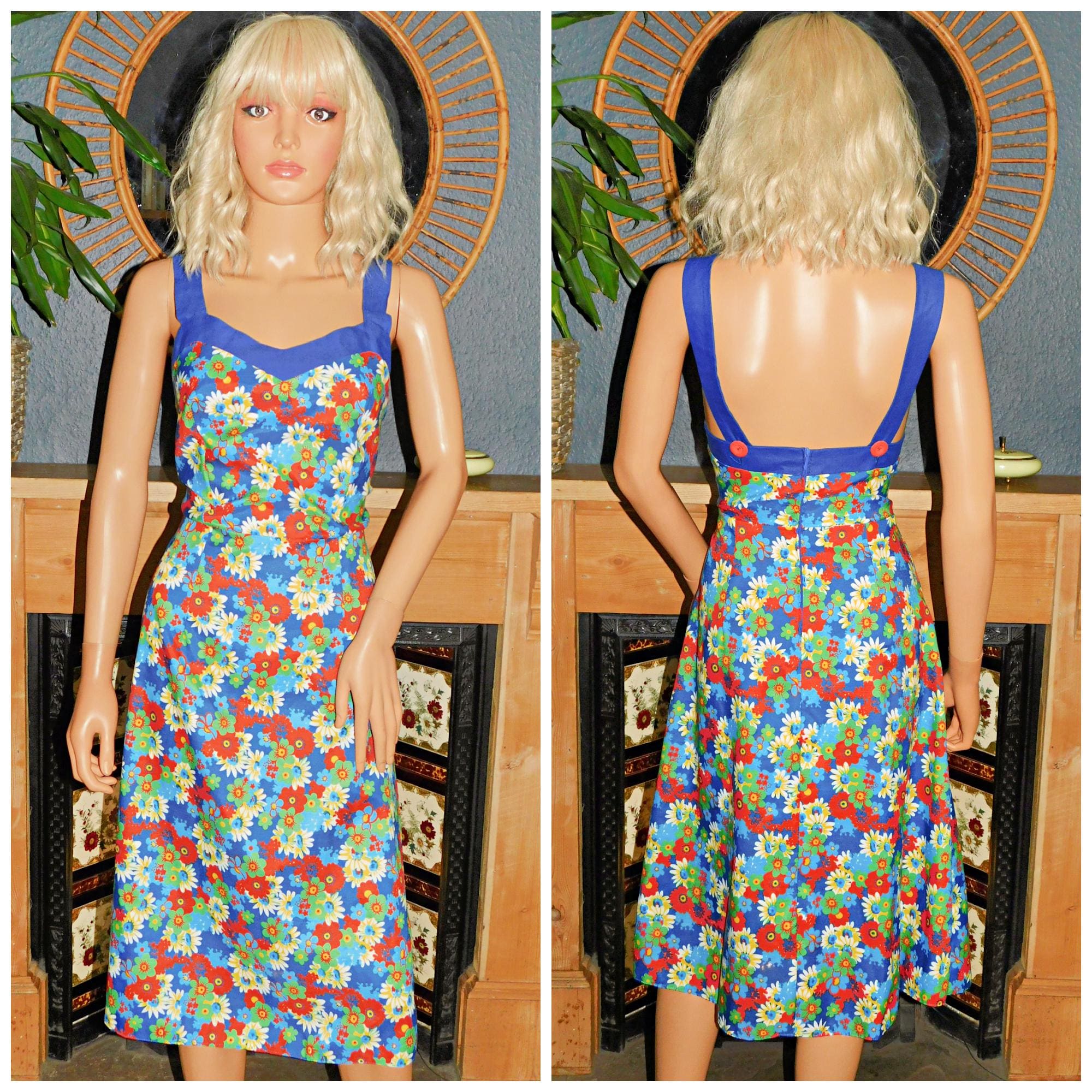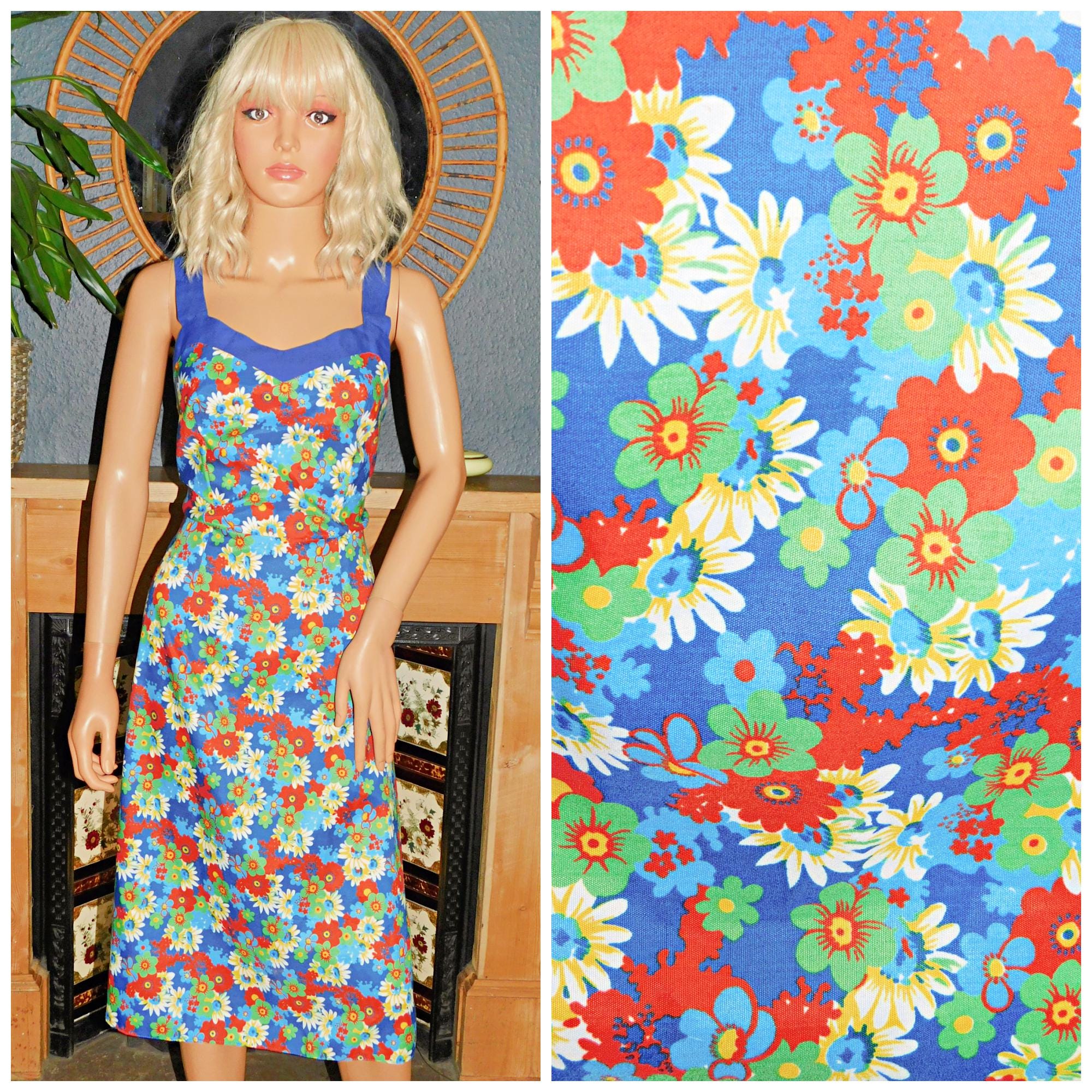 Late Seventies bold multicoloured psychedelic flower power pinnafore dress