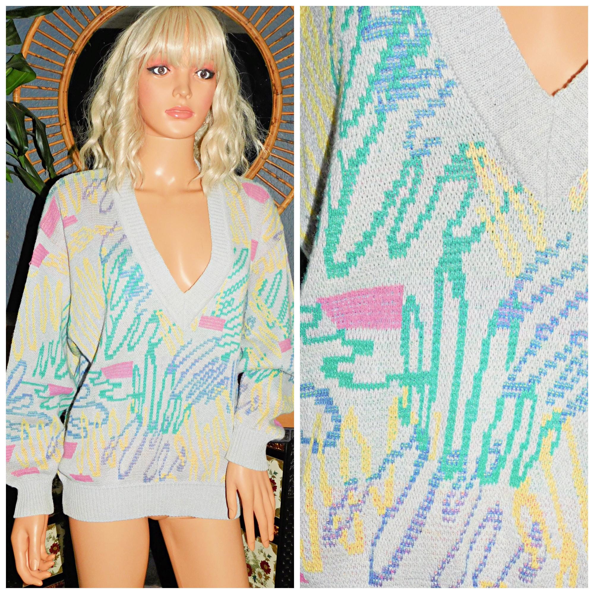 Fabulously kitsch Eighties jumper in a grey/multicoloured abstract graffiti print