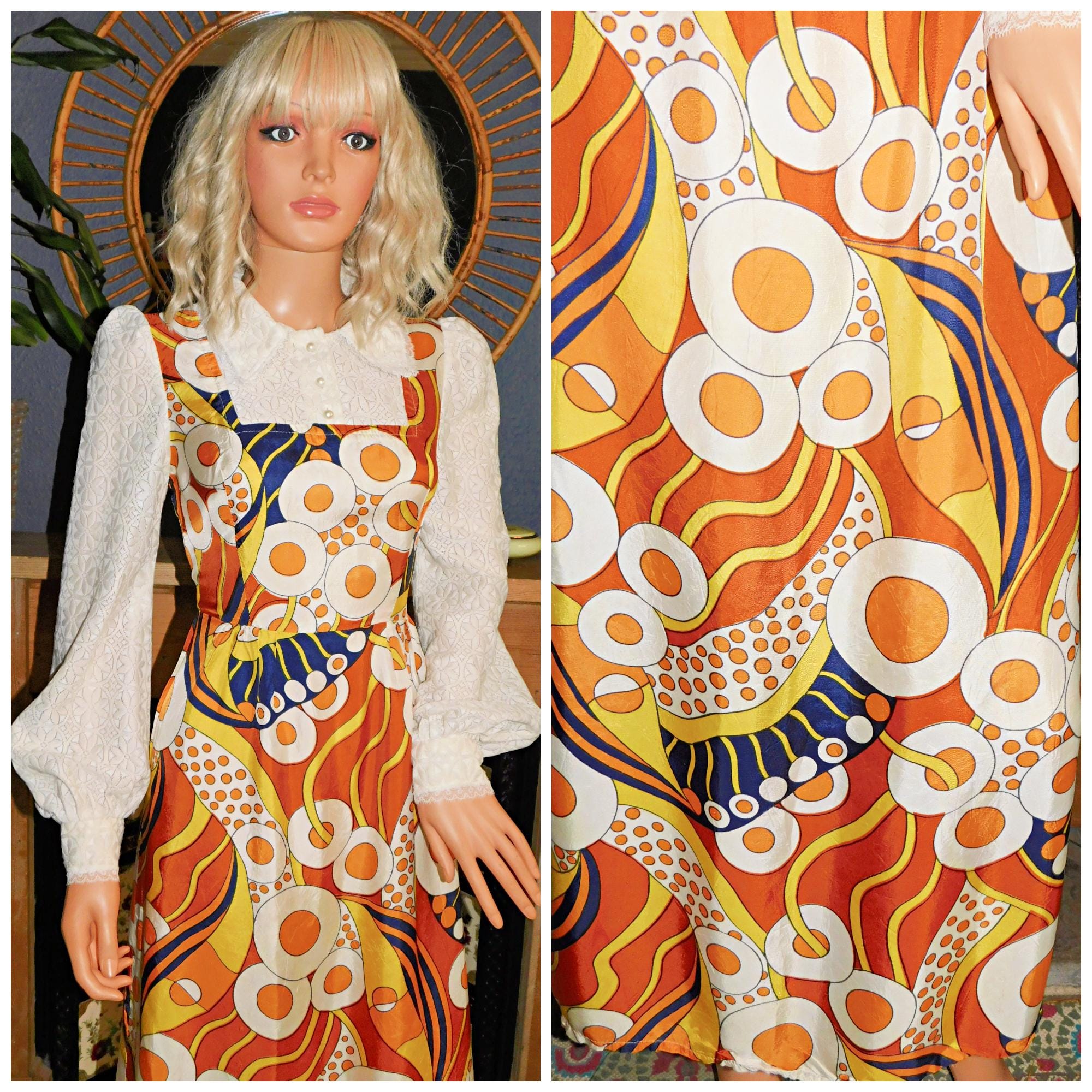 Stunning Original late Sixties/early Seventies maxi dress in a yellow/orange/black geometric print...looks like fried eggs!