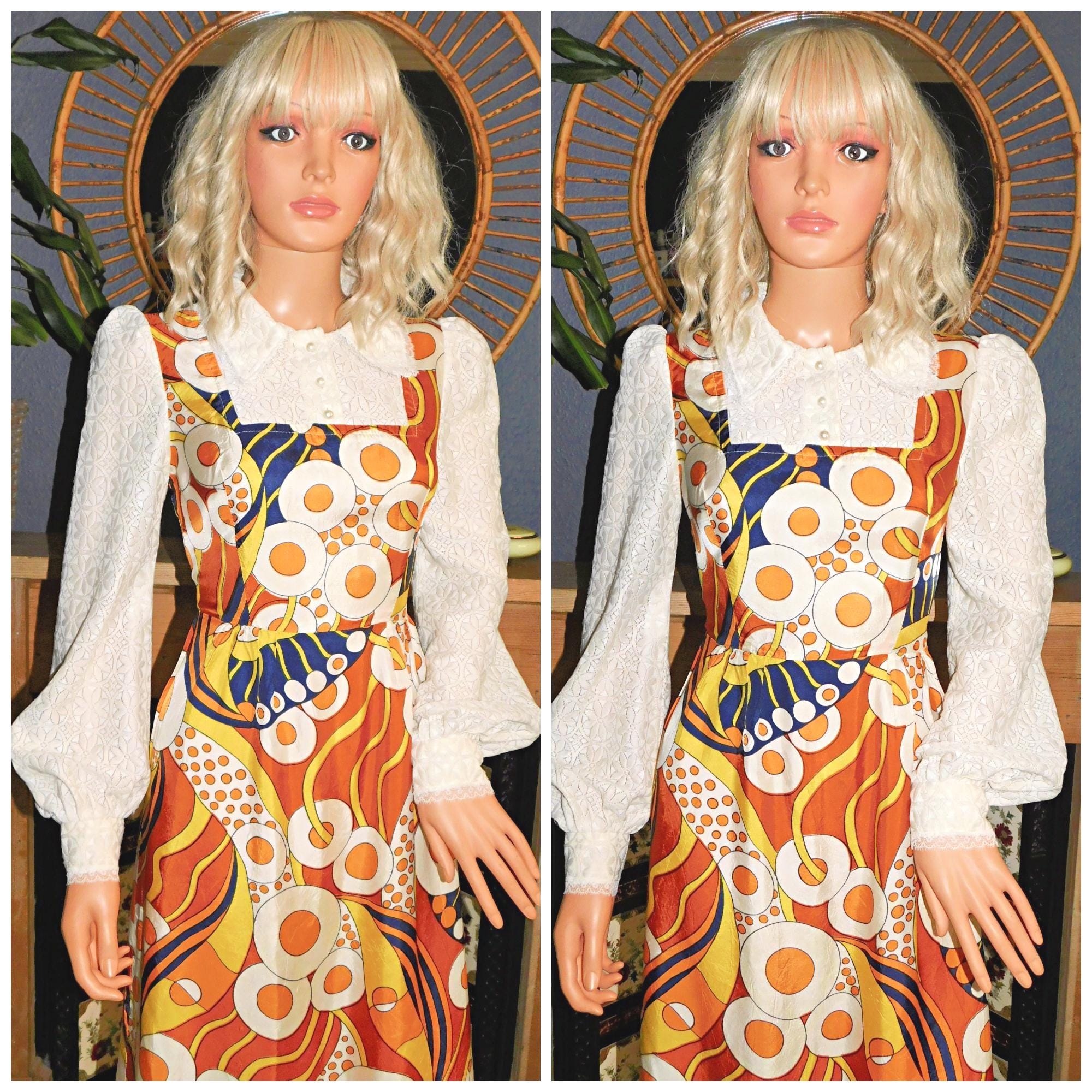 Vintage 60s 70s Yellow NOVELTY GEOMETRIC EGG Print Lace Bib Maxi Dress 6 8 Xs 1970s