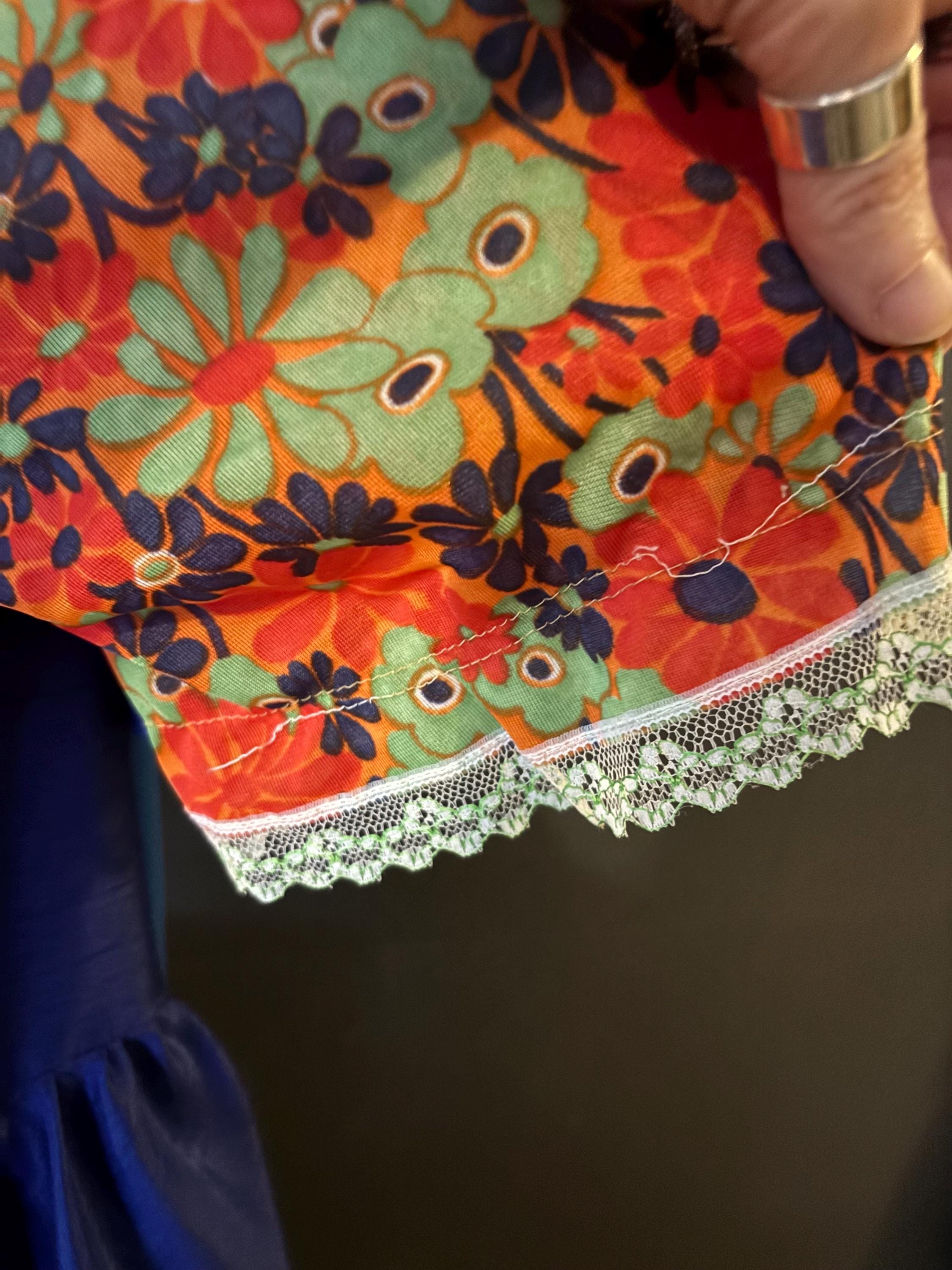 Gorgeous Sixties mini dress/nightie in a bold multicoloured flower power nylon with pale green lace trim