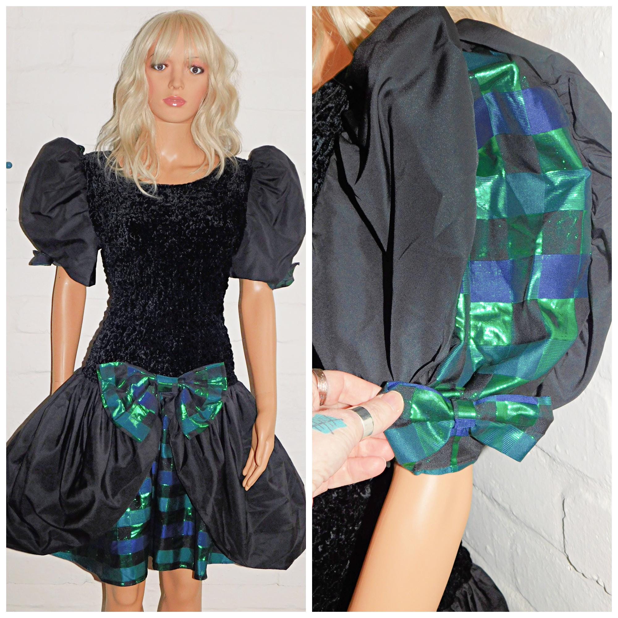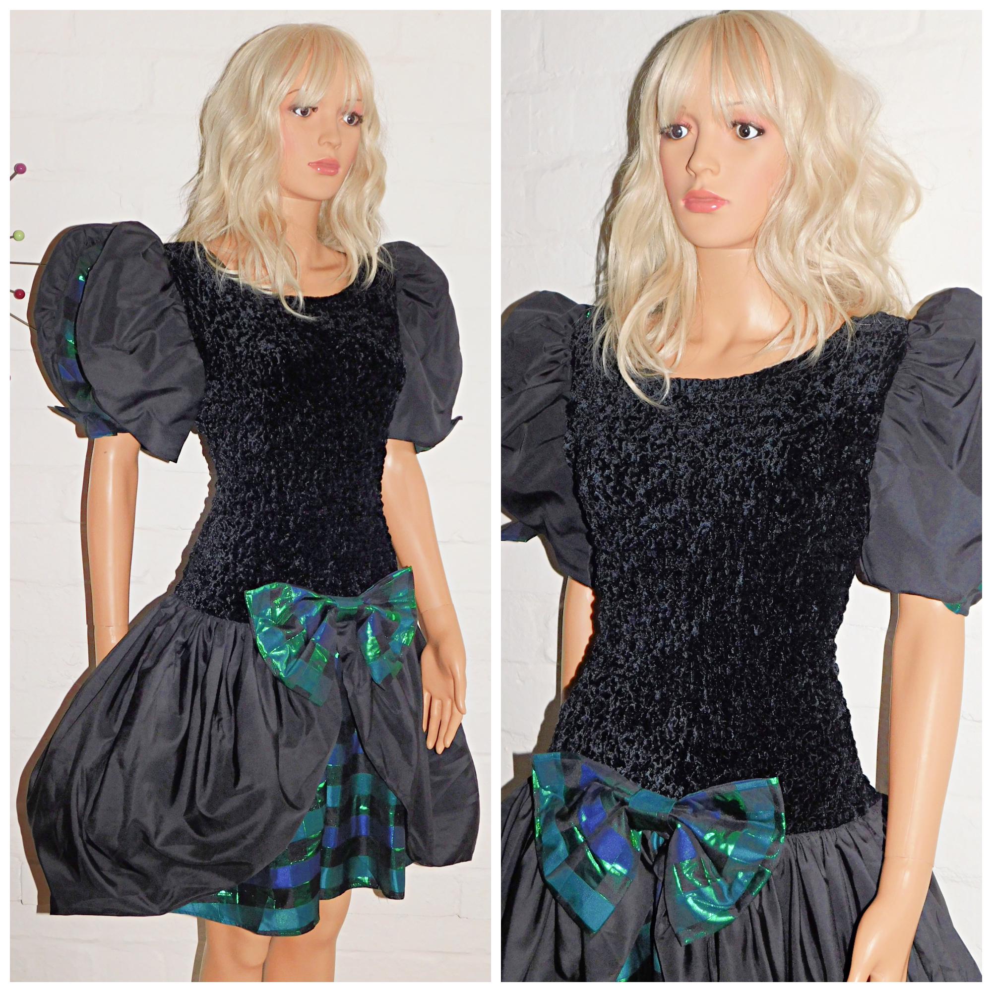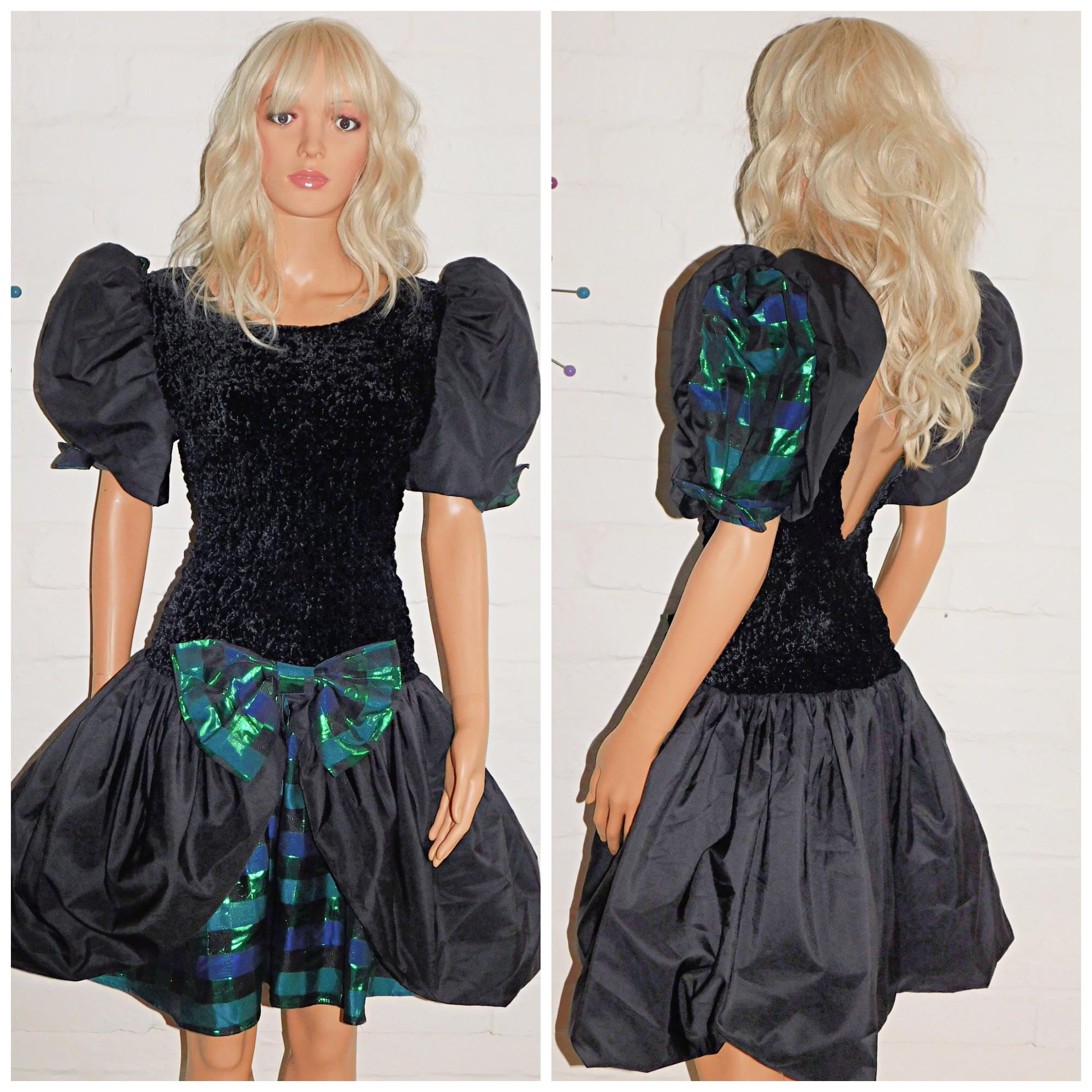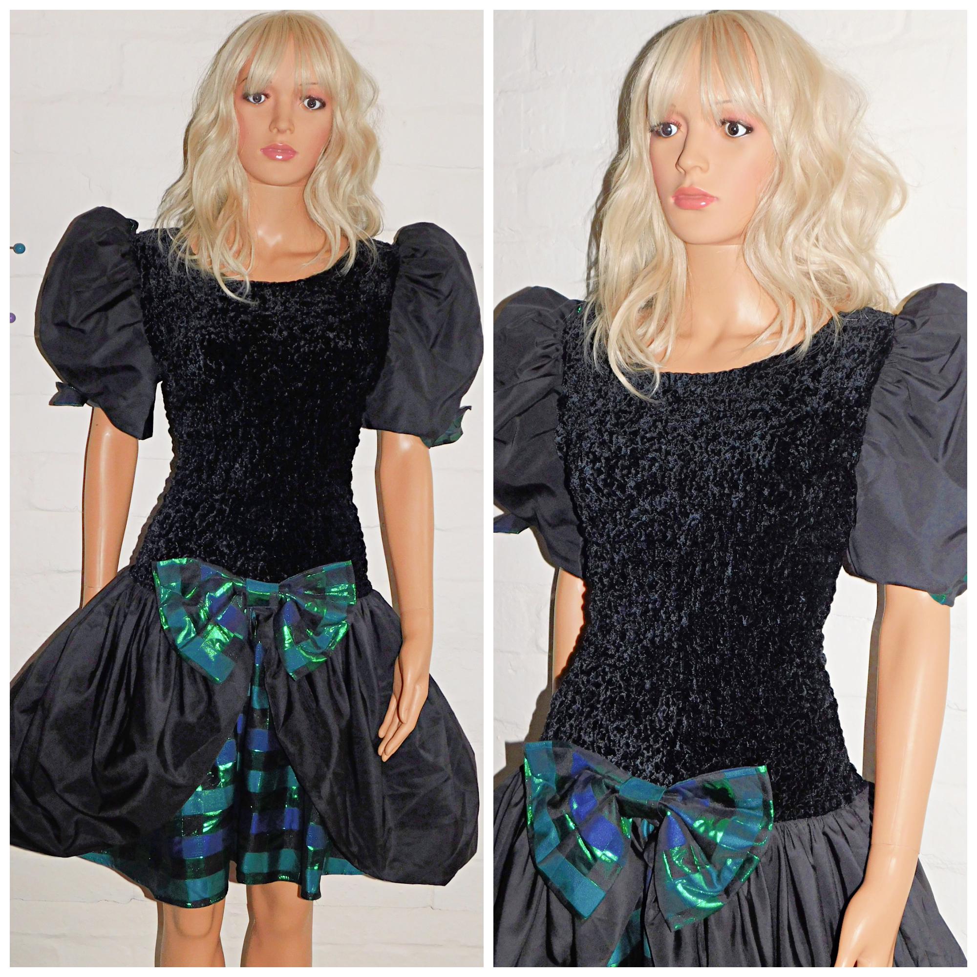 Original 80s mini prom dress in black with contrasting metallic green/blue check trim