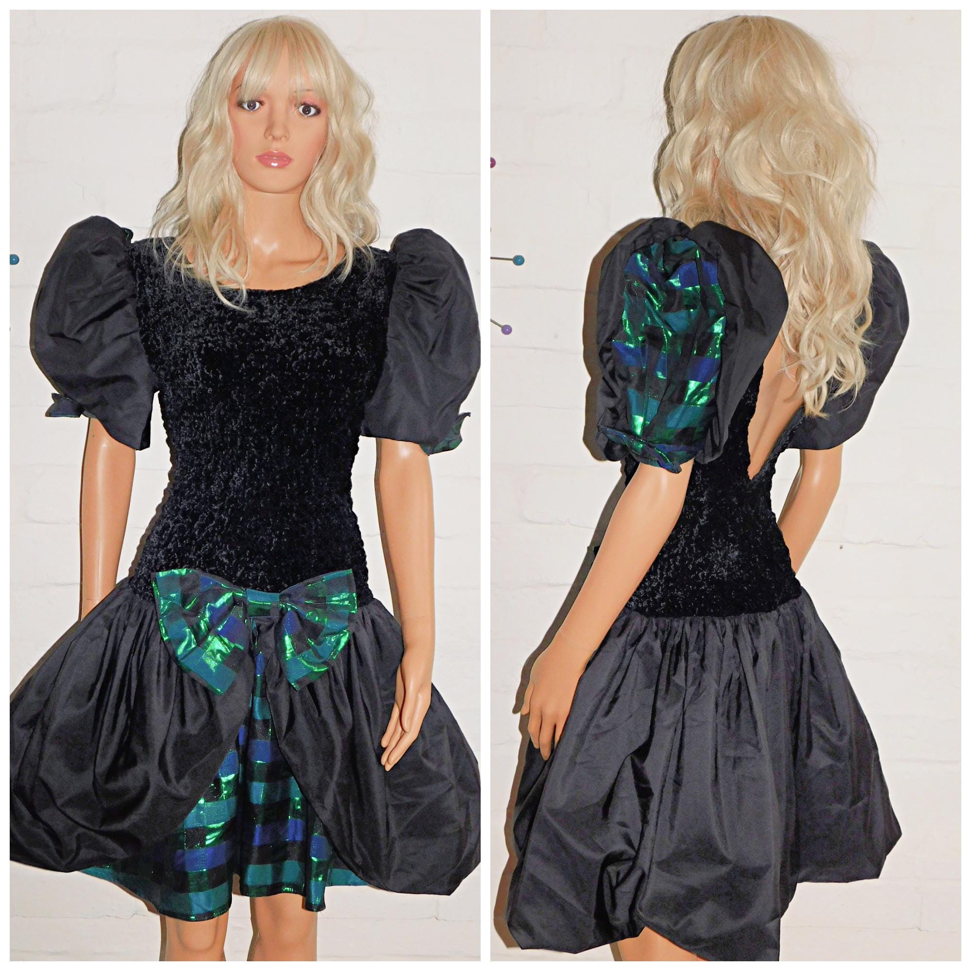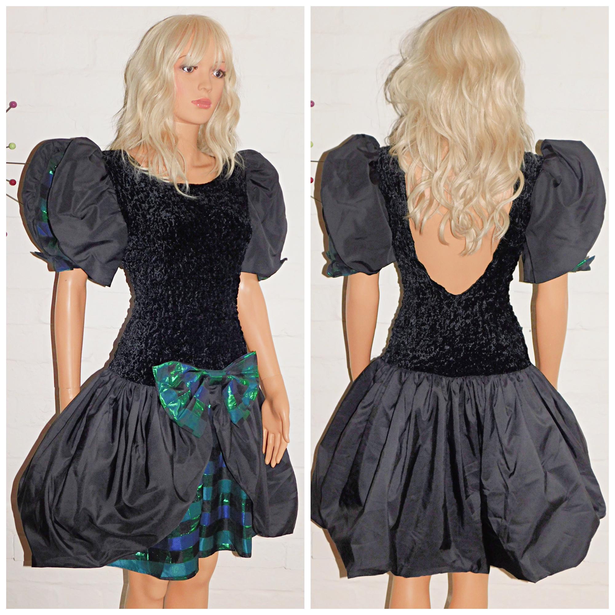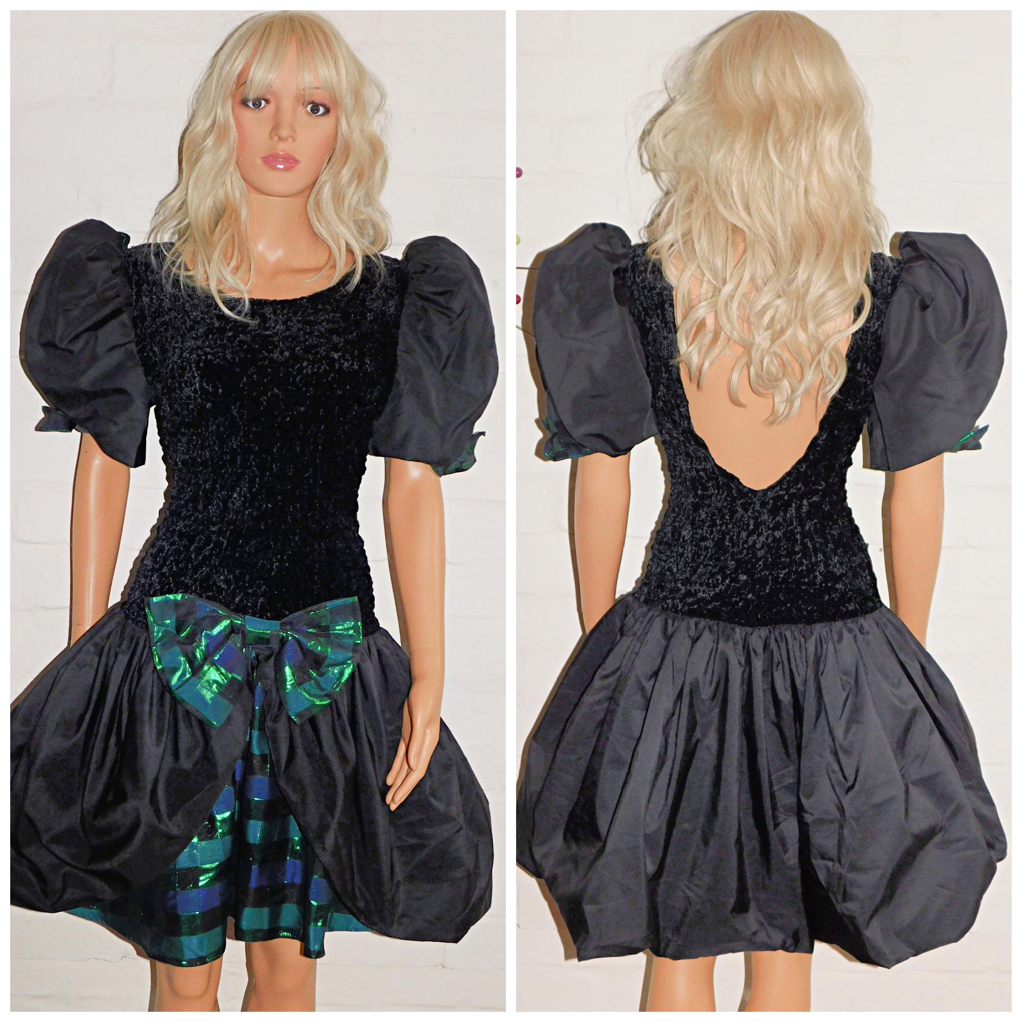 Vintage 80s Black Green Blue METALLIC BOW Front Prom Party Dress 12 14 M 1980s Extreme Avant Garde Kitsch Bubble Hem Mini Puffball Check