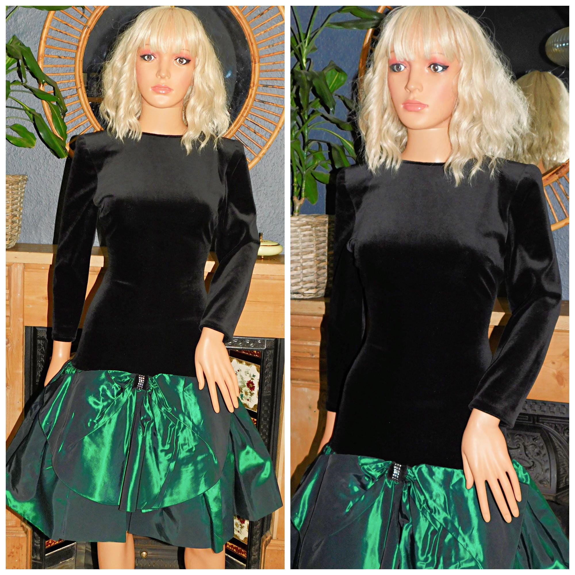 Gorgeous Eighties prom dress in black velvet with contrasting green skirt