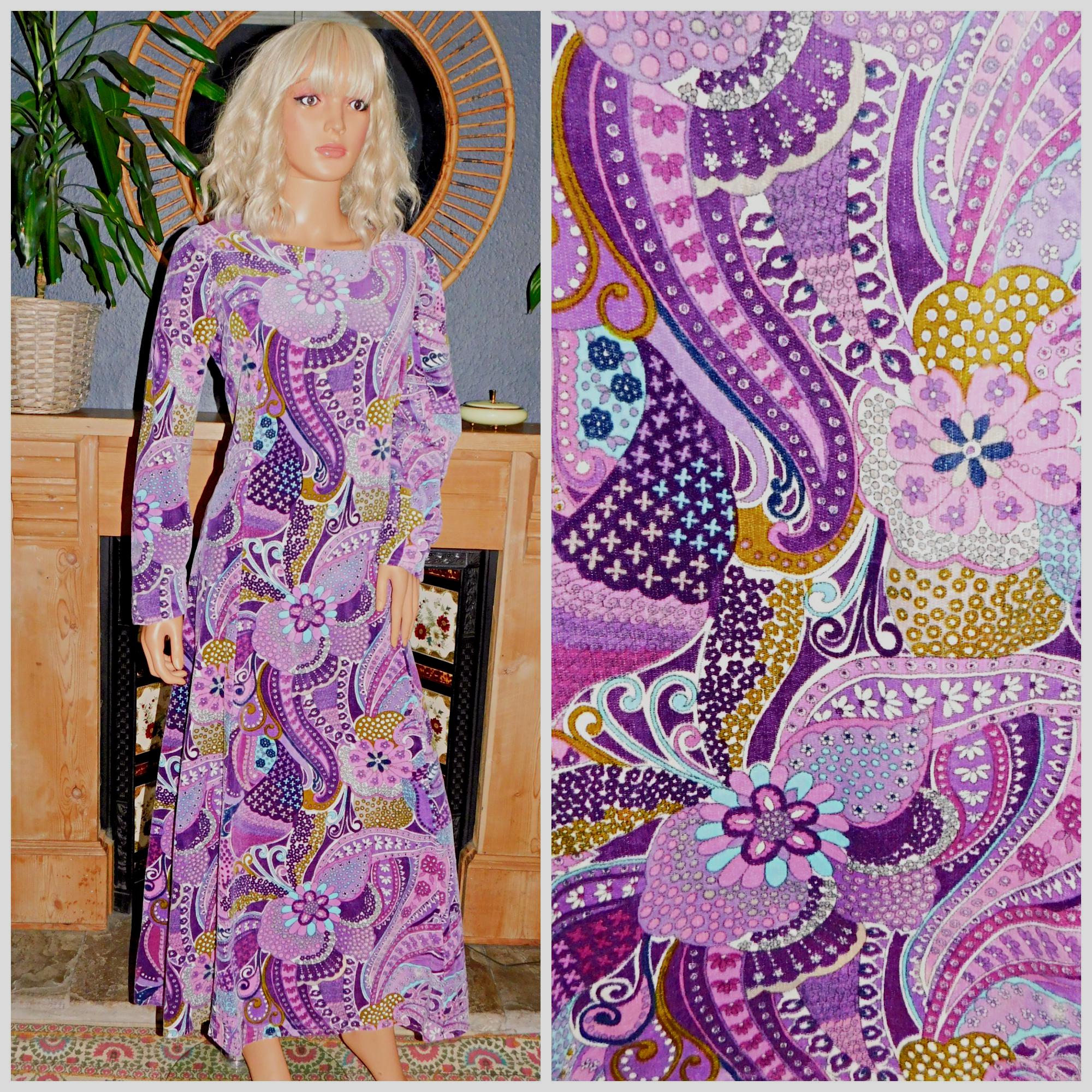 Gorgeous Original Seventies hand made midi dress in a purple/multicoloured psychedelic print
