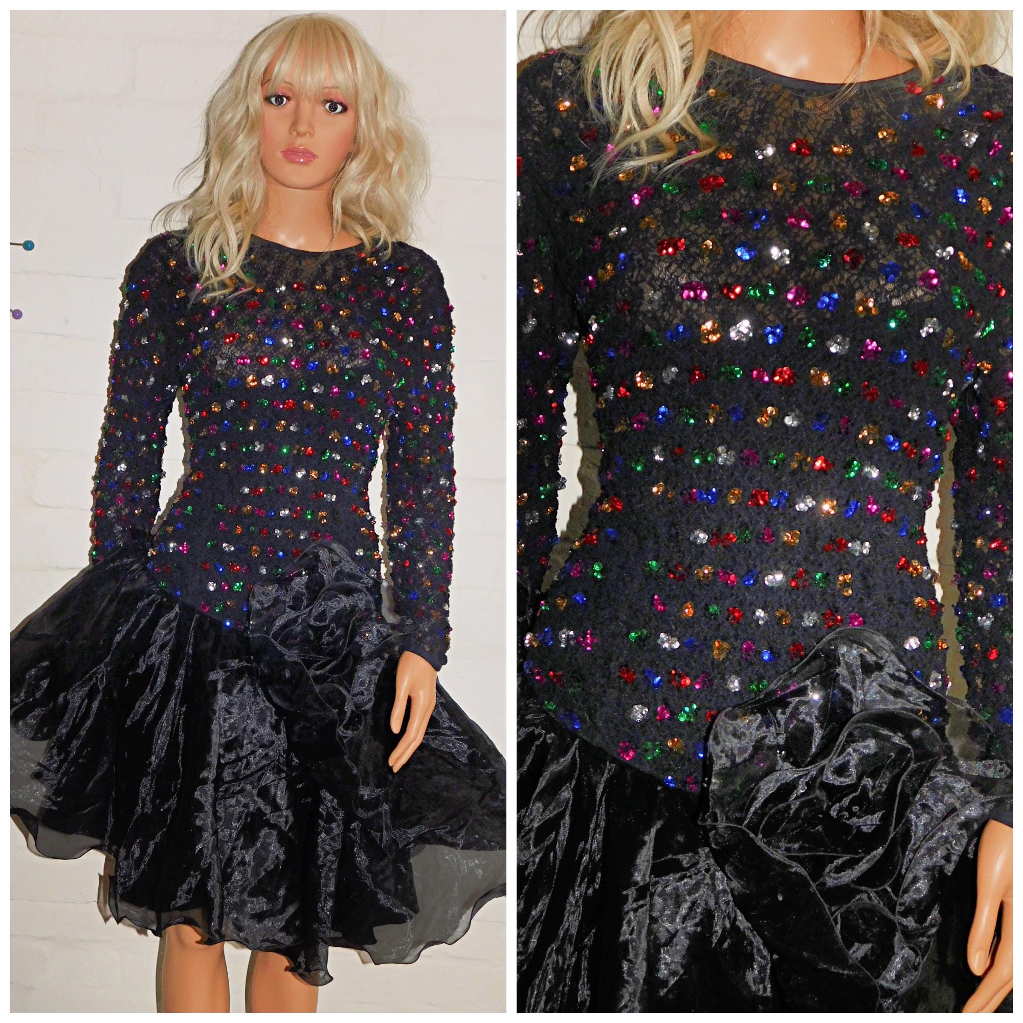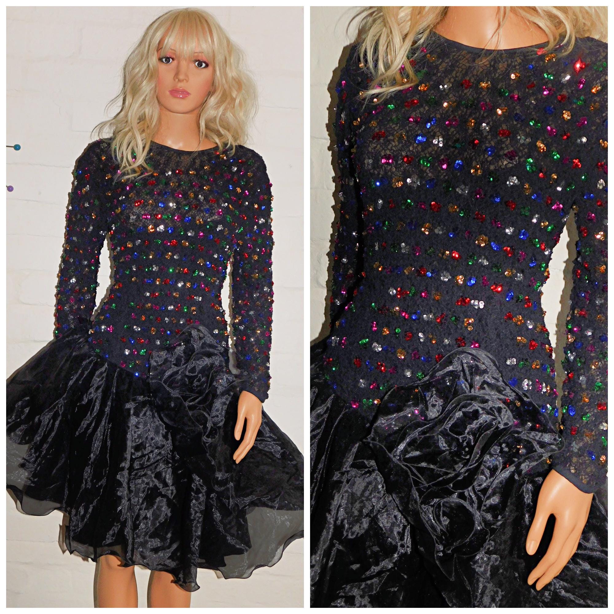 Vintage 1980s AVANT GARDE Black Multicoloured SEQUIN Drop Waist Prom Party Dress 14 M 80s Kitsch Vera Mont