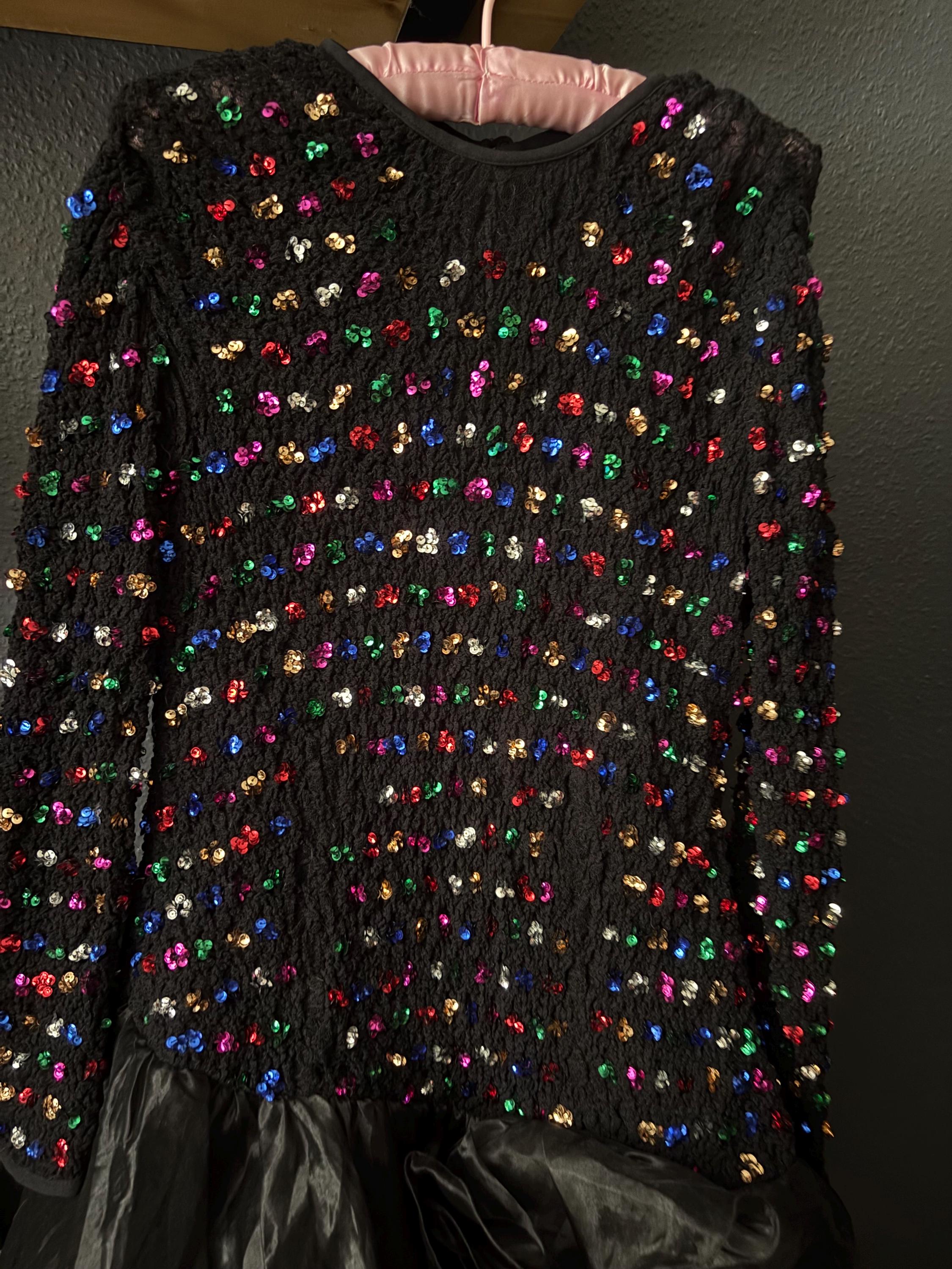Classic Eighties prom dress in black with bright multicoloured sequin detail to bodice