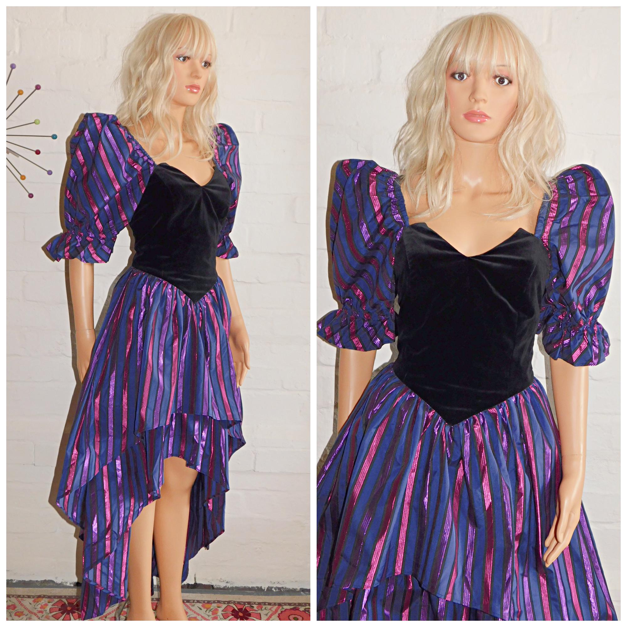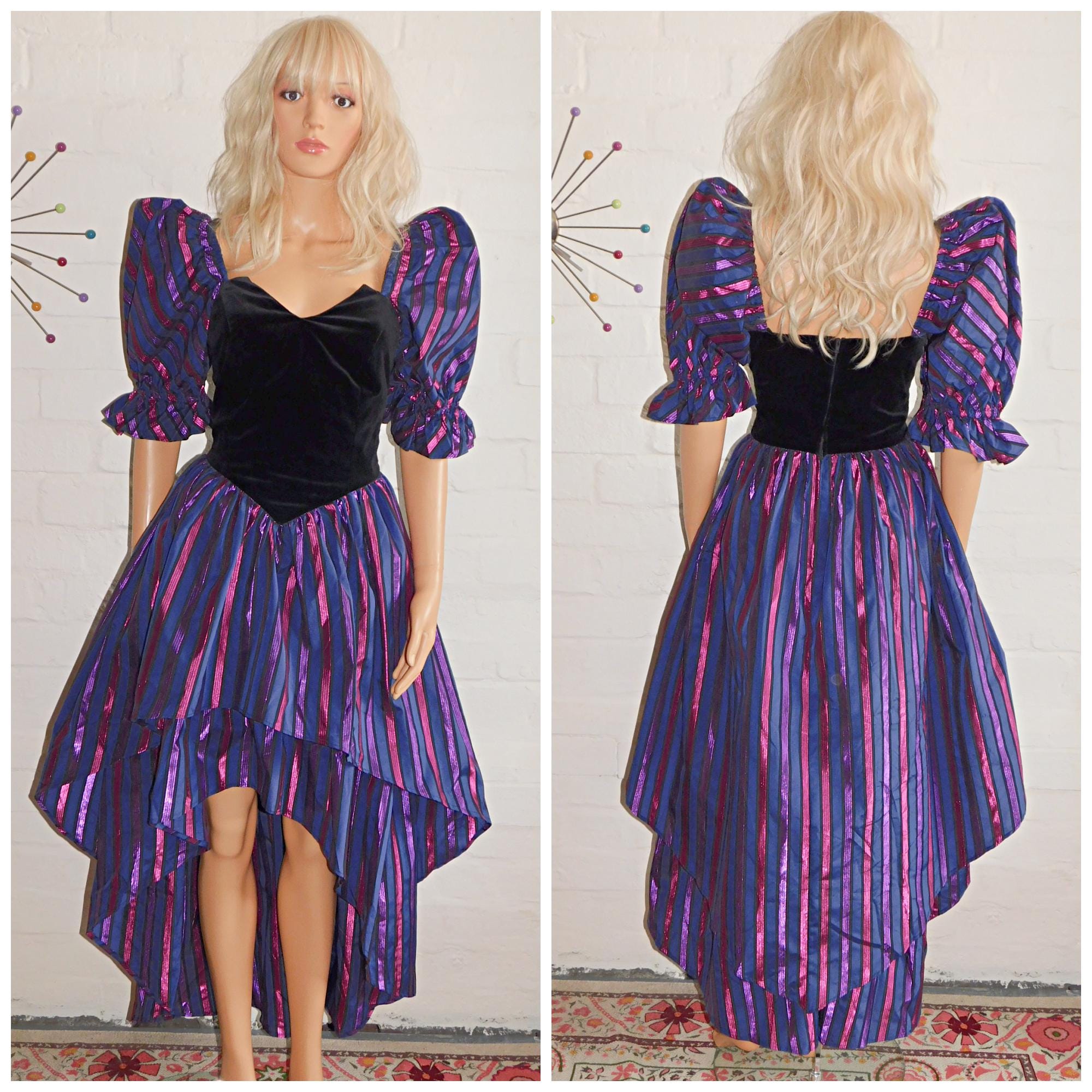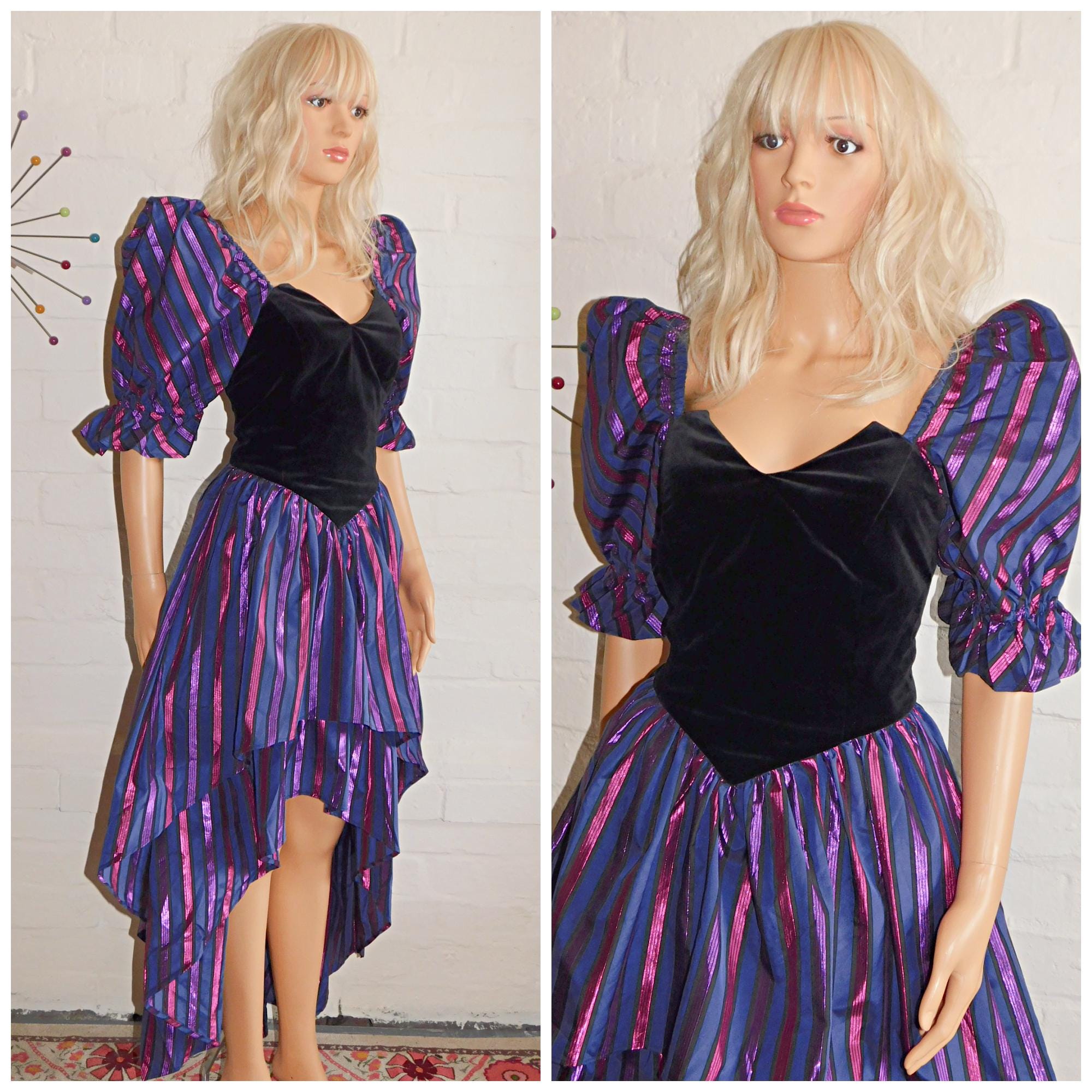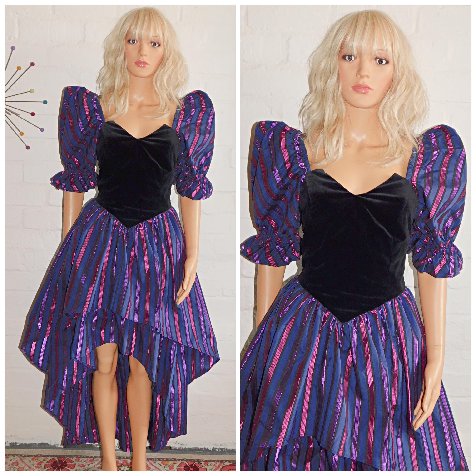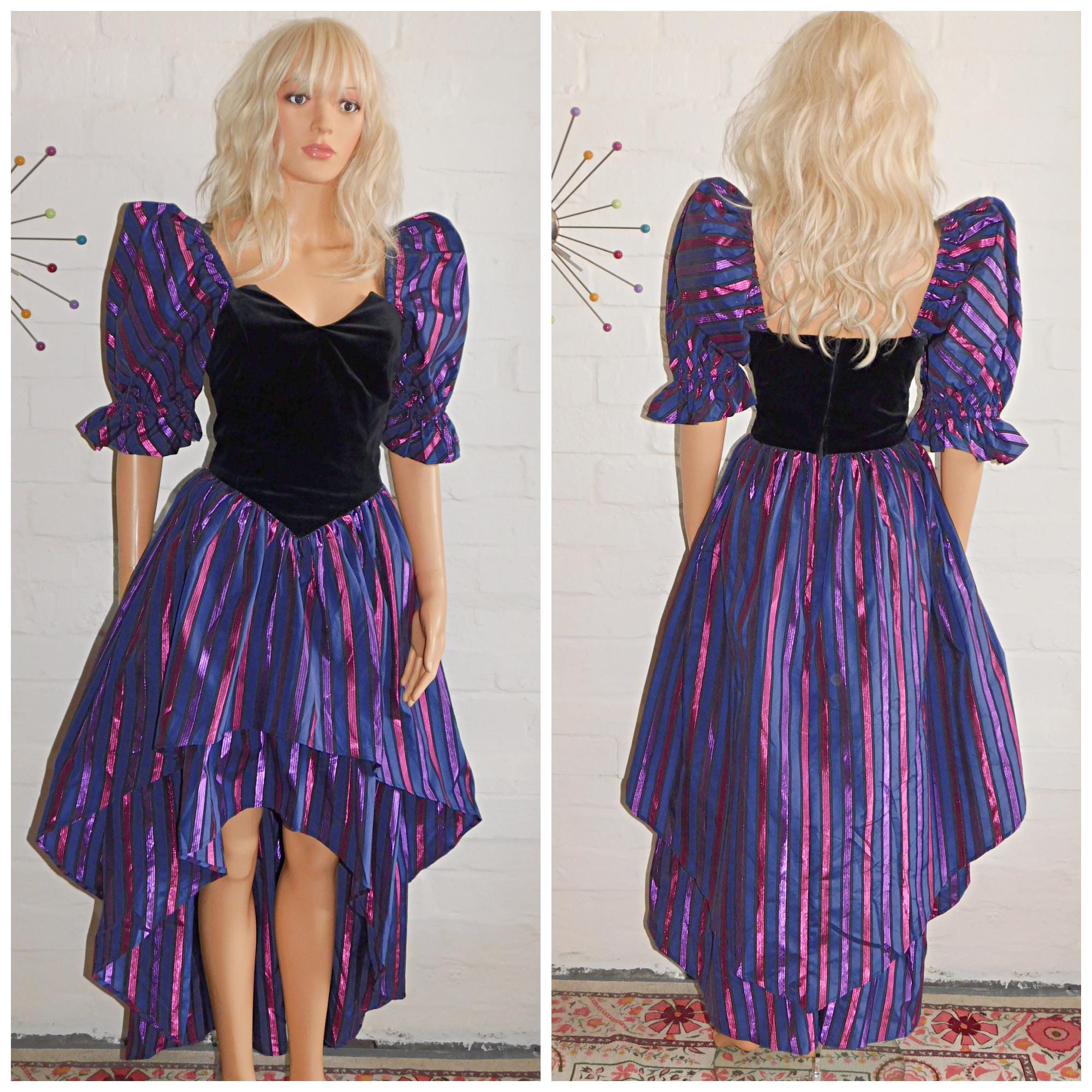 Vintage 80s Avant Garde Black METALLIC Purple Pink STRIPED PUFF Slvd Prom Party Dress 8 Xs S 1980s Kitsch