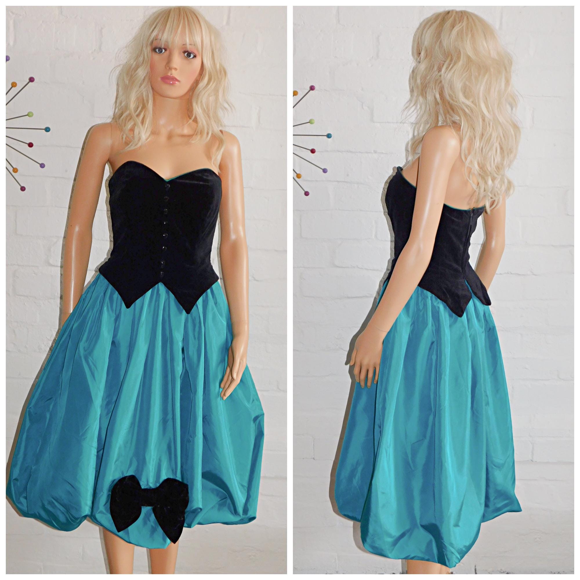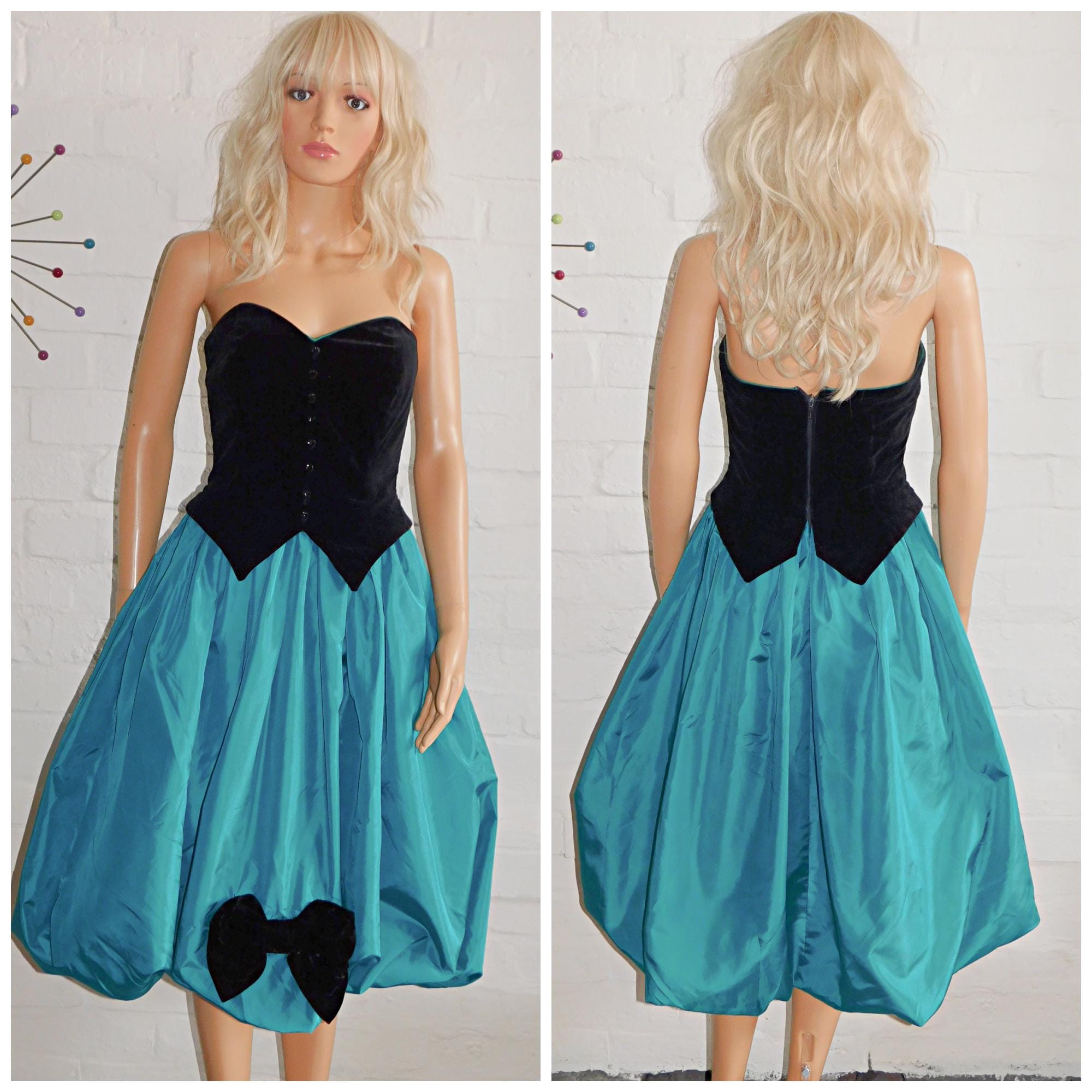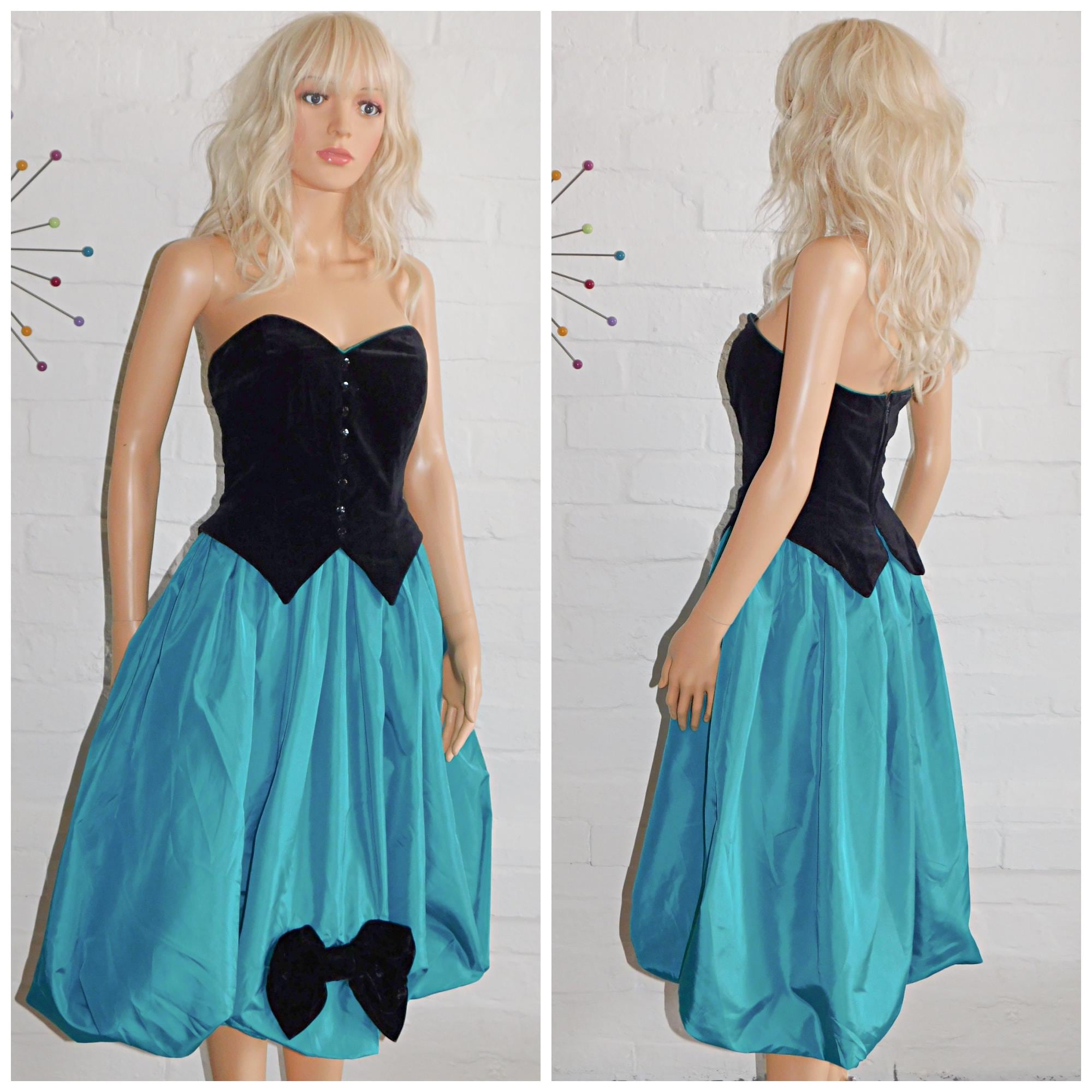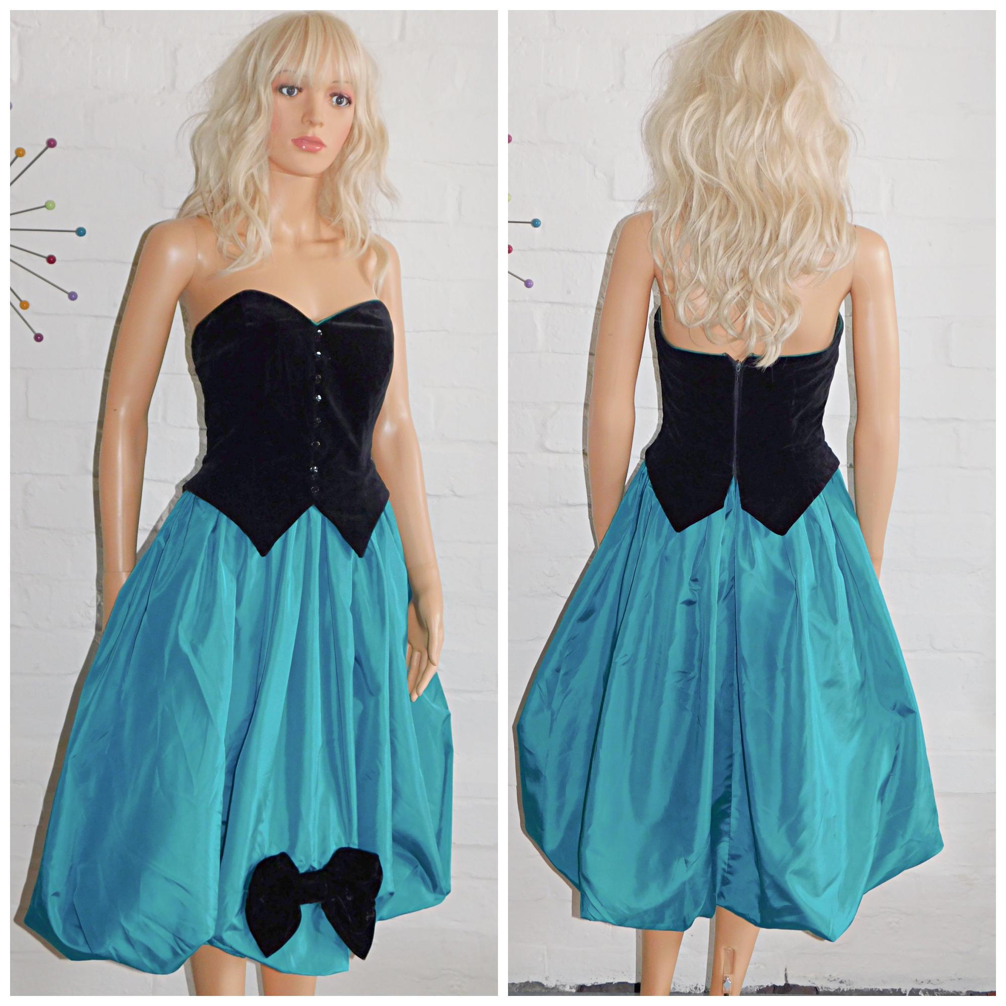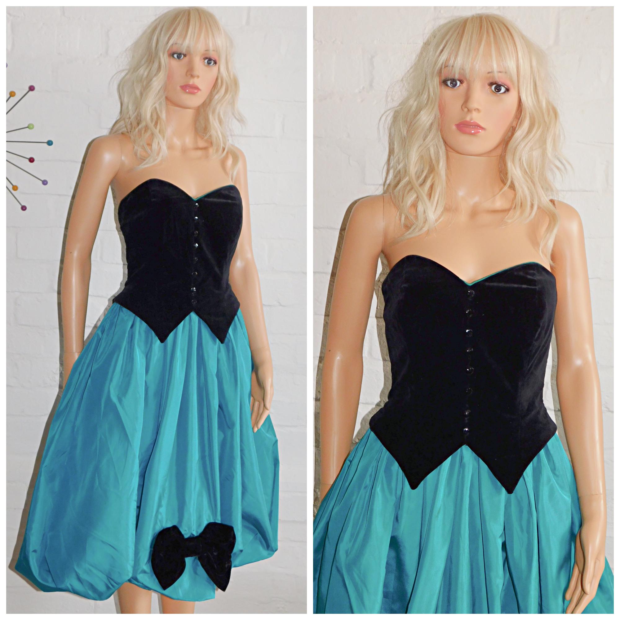 Vintage 80s Black Green Tuxedo Strapless BOW BUBBLE Hem Prom Party Dress 6 8 Xs 1980s Kitsch Puffball