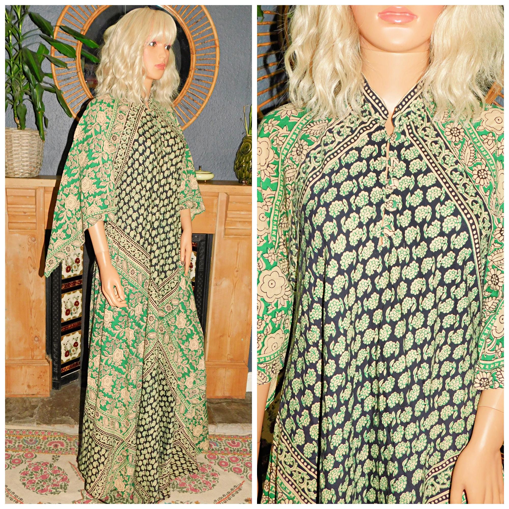 Vintage 70s Green Black Cream COTTON BLOCK PRINT Bohemian Hippy Hippie Maxi Caftan Kaftan Dress M 1970s Festival Boho