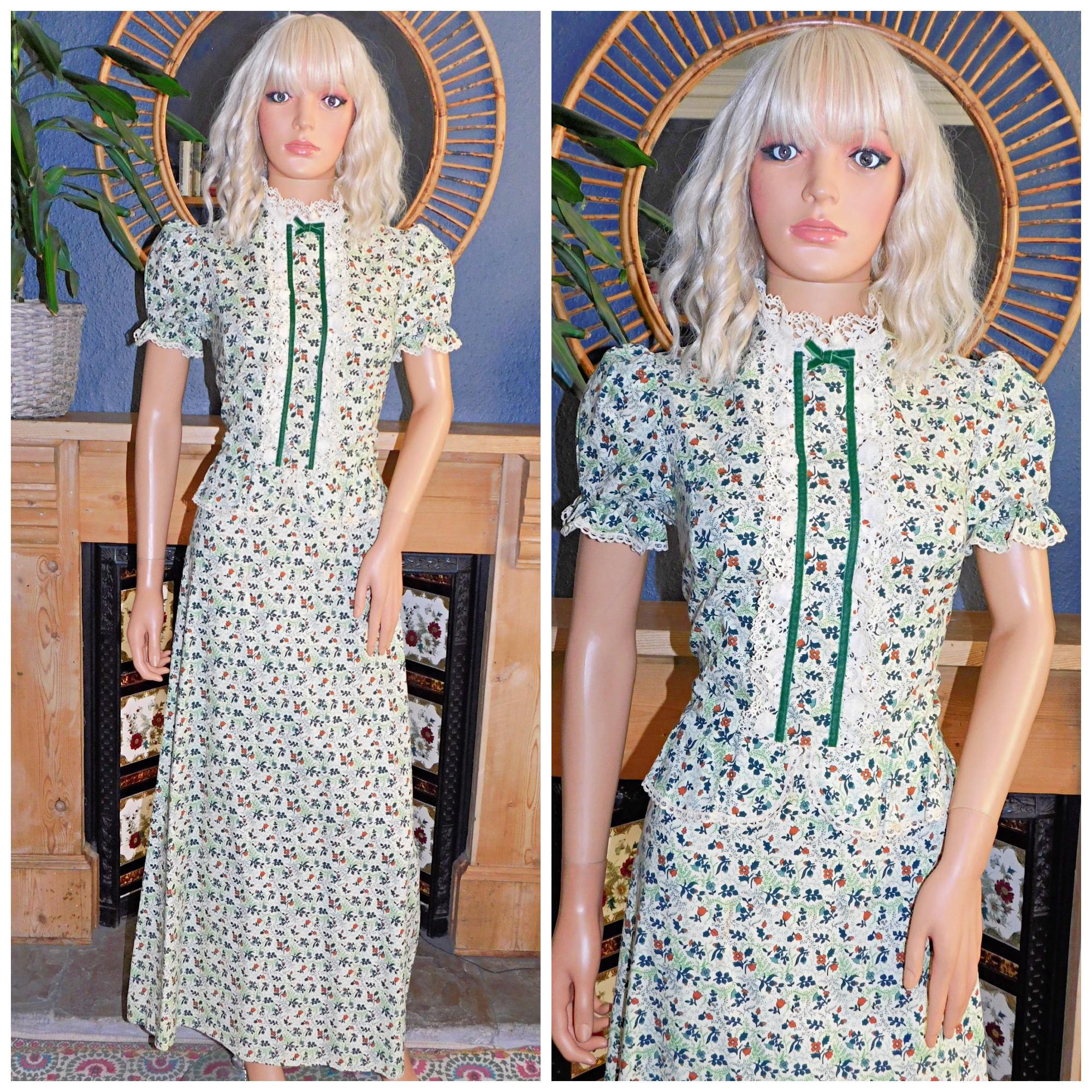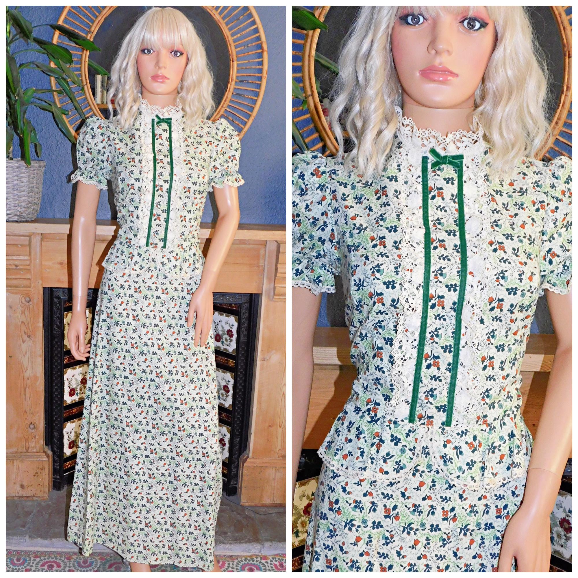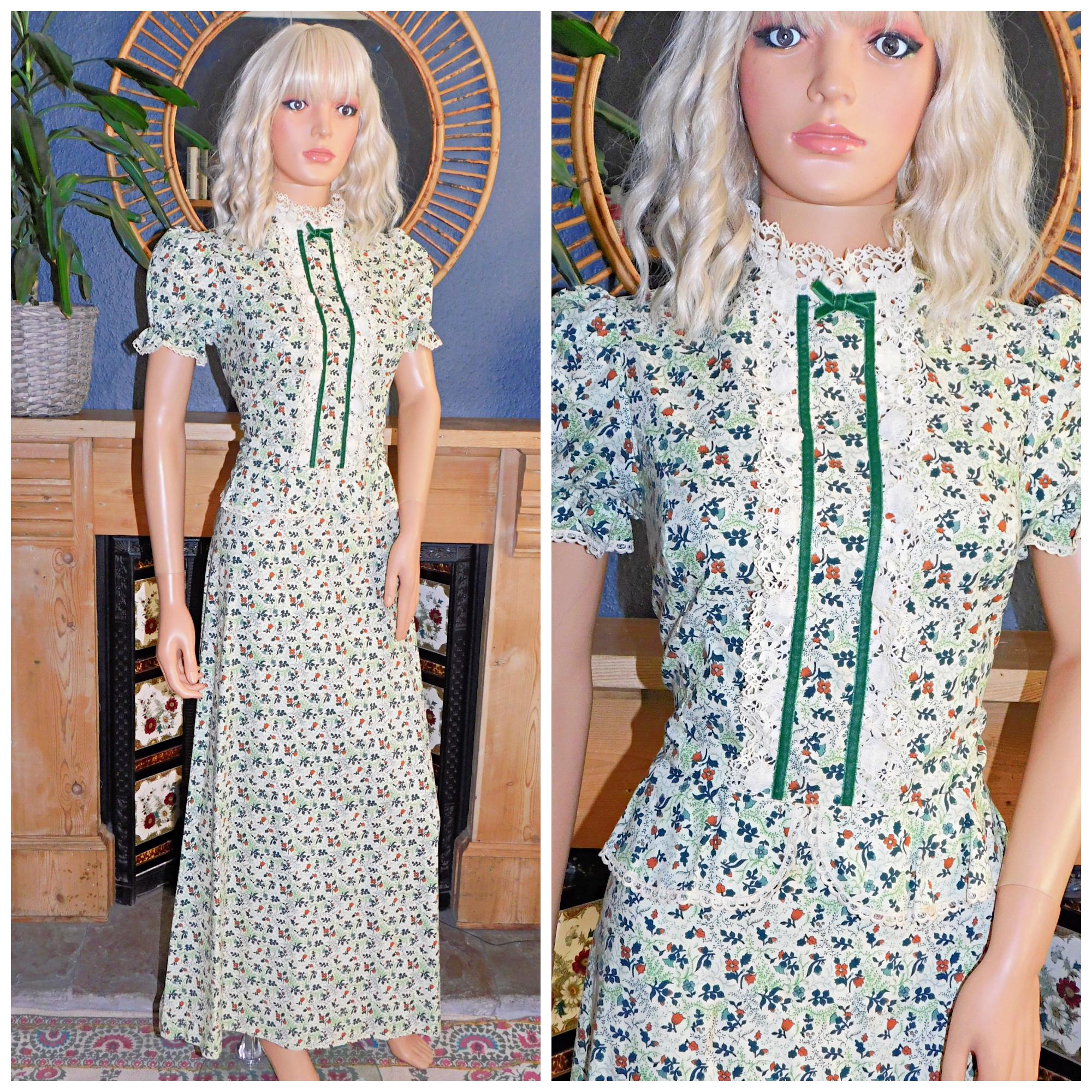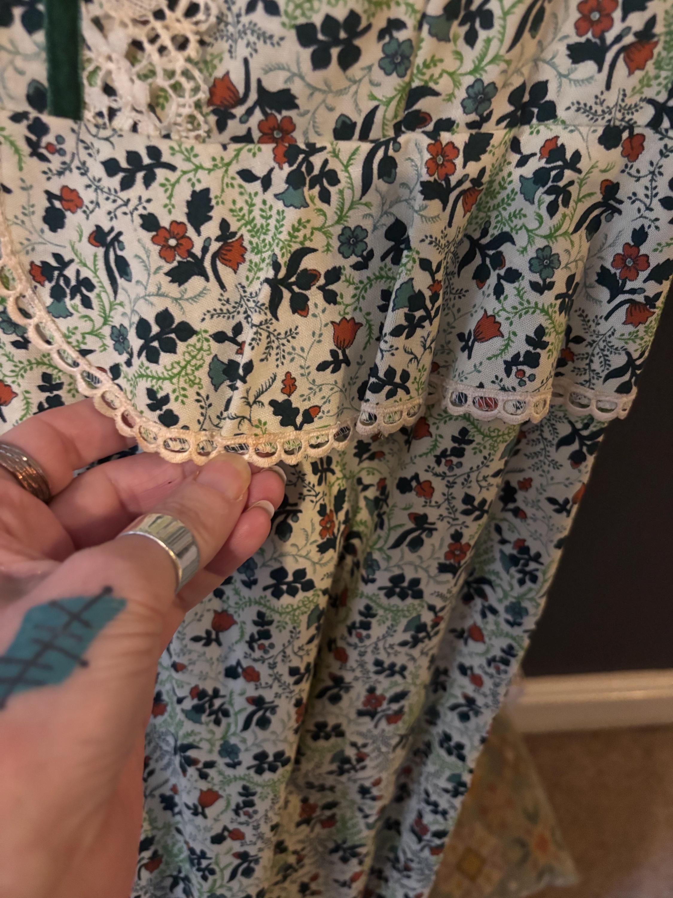 Amazing Seventies Bohemian/Victoriana/Prairie maxi dress in a green/tan ditsy floral print with cream crochet trim and dark green velvet ribbon