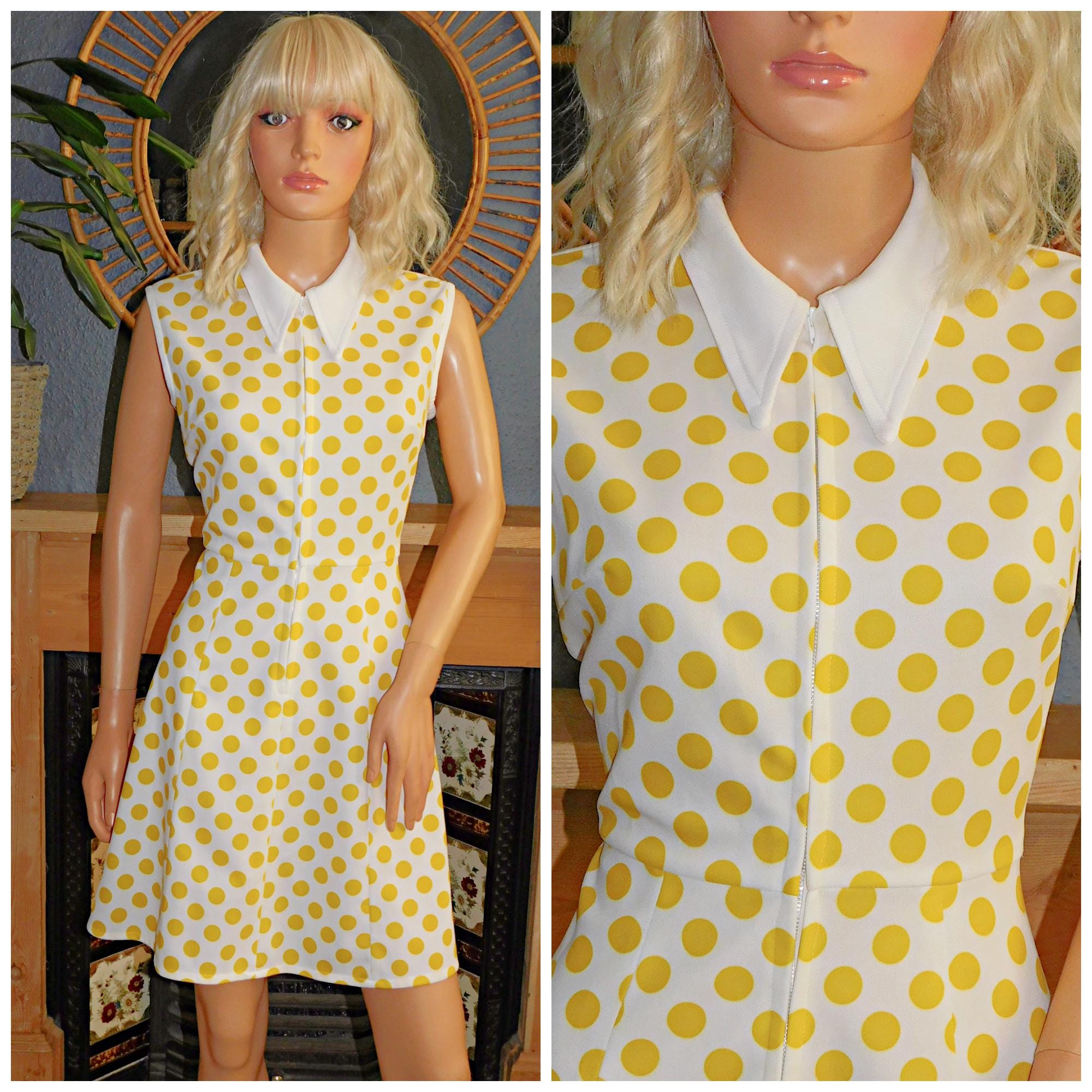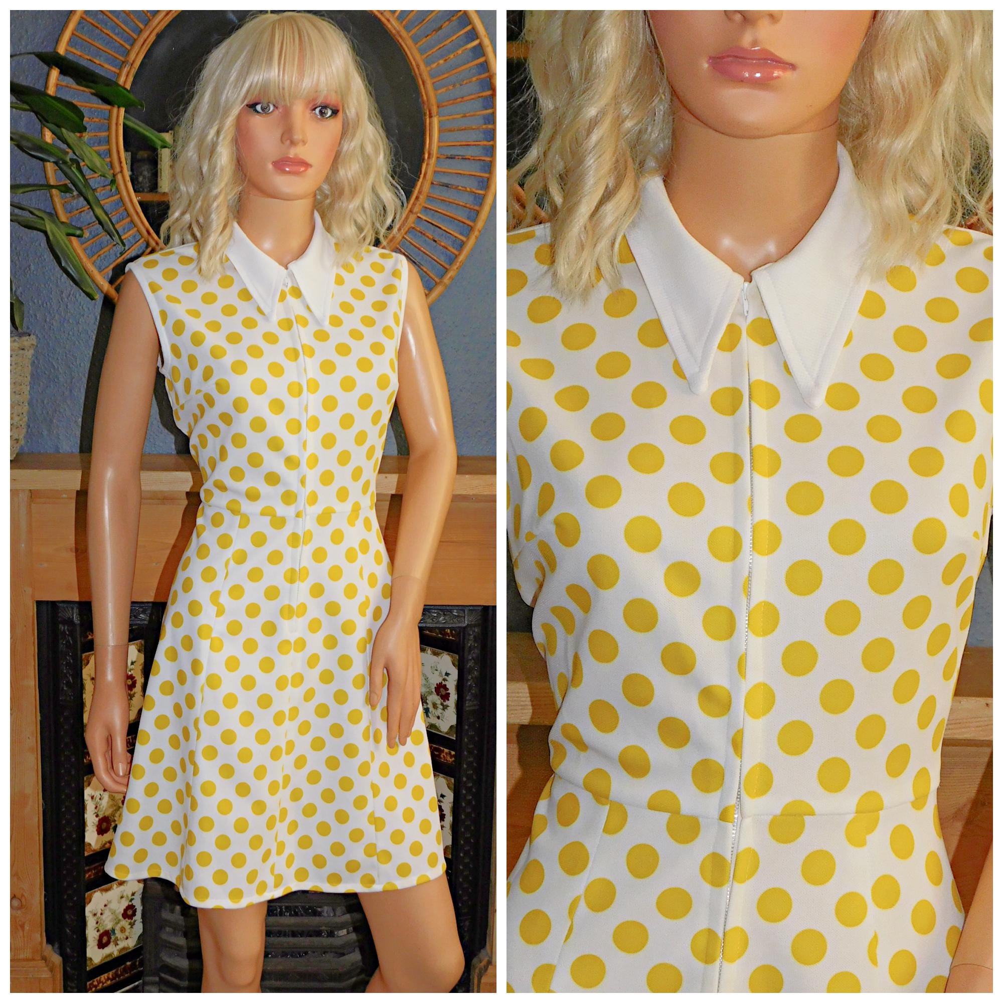 Vintage 60s Yellow White POLKA Dot Contrast COLLAR MOD Dress 1960s Dolly Modette