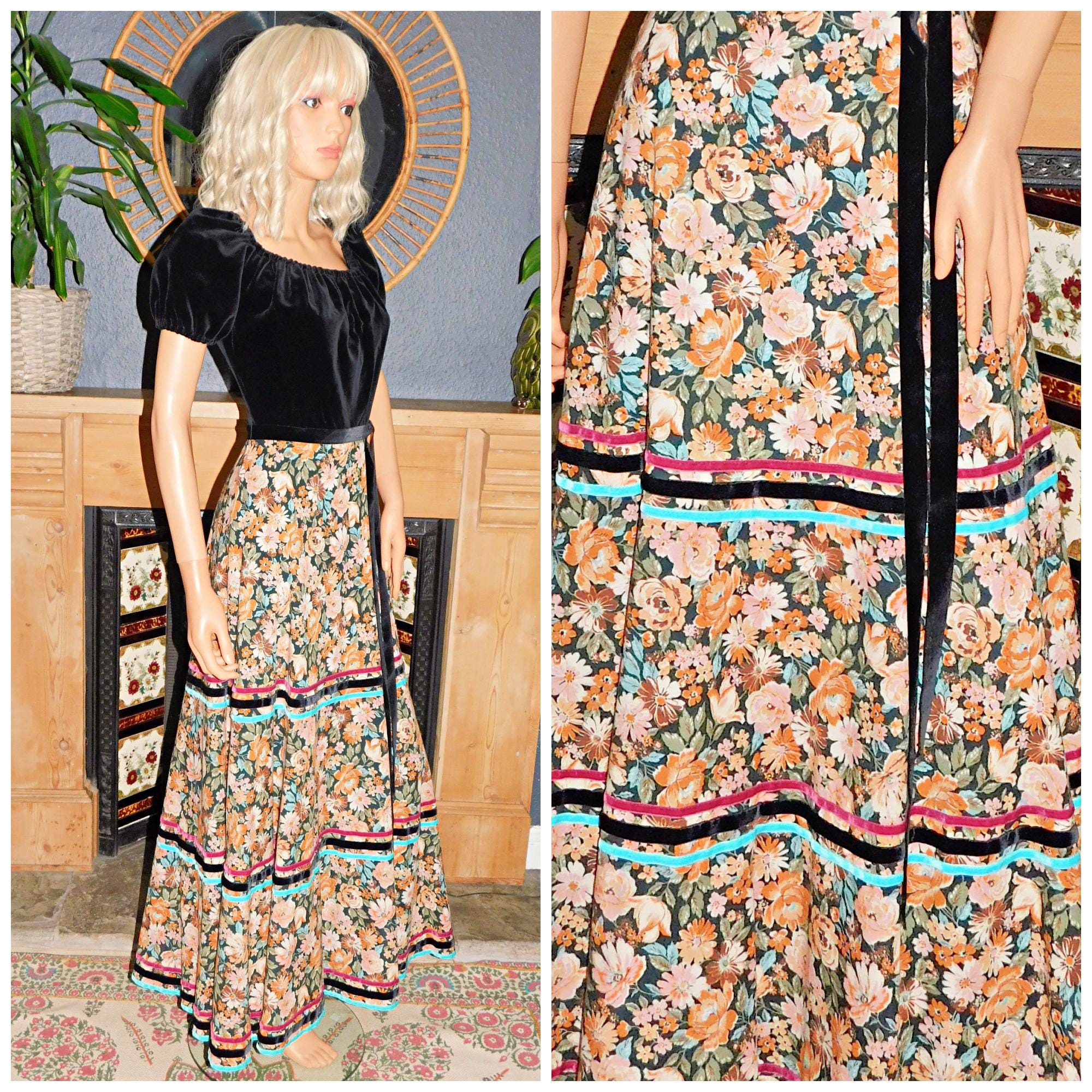 Vintage 70s Black Velvet Floral Contrast BOHEMIAN PRAIRIE Day Dress 8 10 S 1970s Folk Boho Hippy Hippie Woodstock Vera Mont