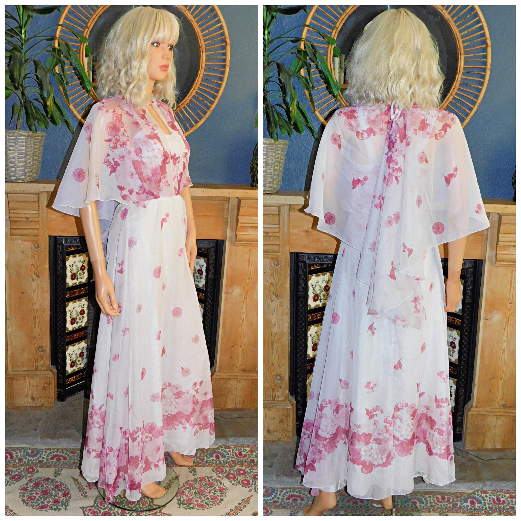 Vintage 70s White DUSKY Pink FLOATY ANGEL Cape Bohemian Stevie Maxi Dress 6 Xxs 1970s Boho