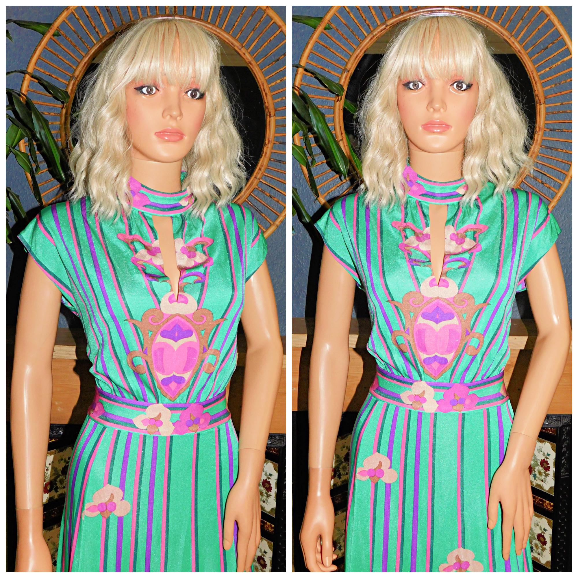 Gorgeous Original Seventies Art Nouveau/Psychedelic maxi dress in green/pink