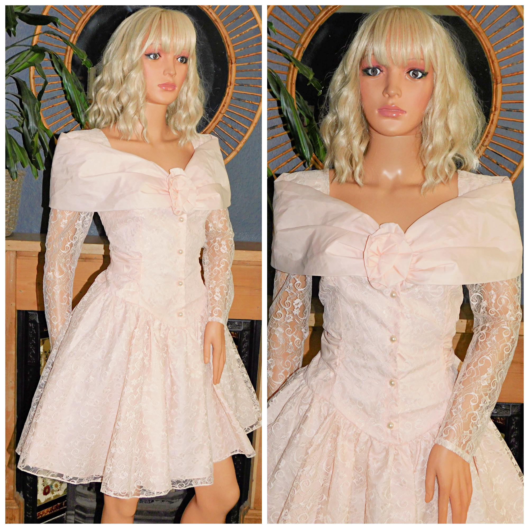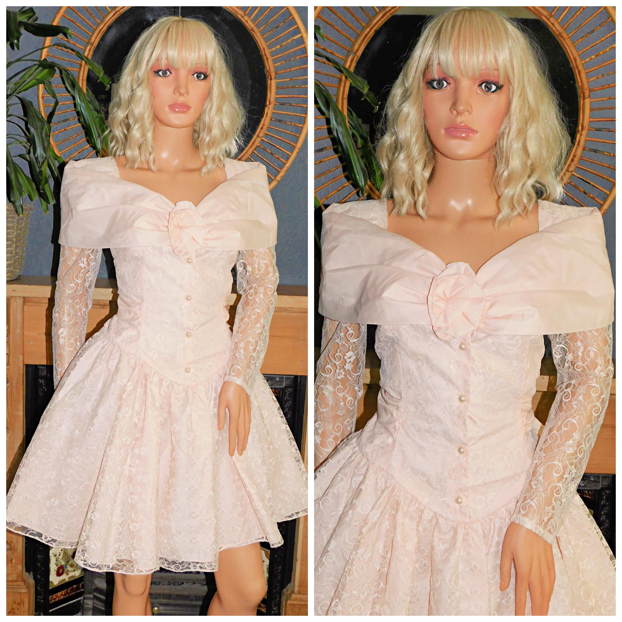 Vintage 80s Peach Lace MINI Prom Party Wedding Dress 12 14 M 1980s Hen Cocktail Bride Kitsch Bridesmaid Trashy