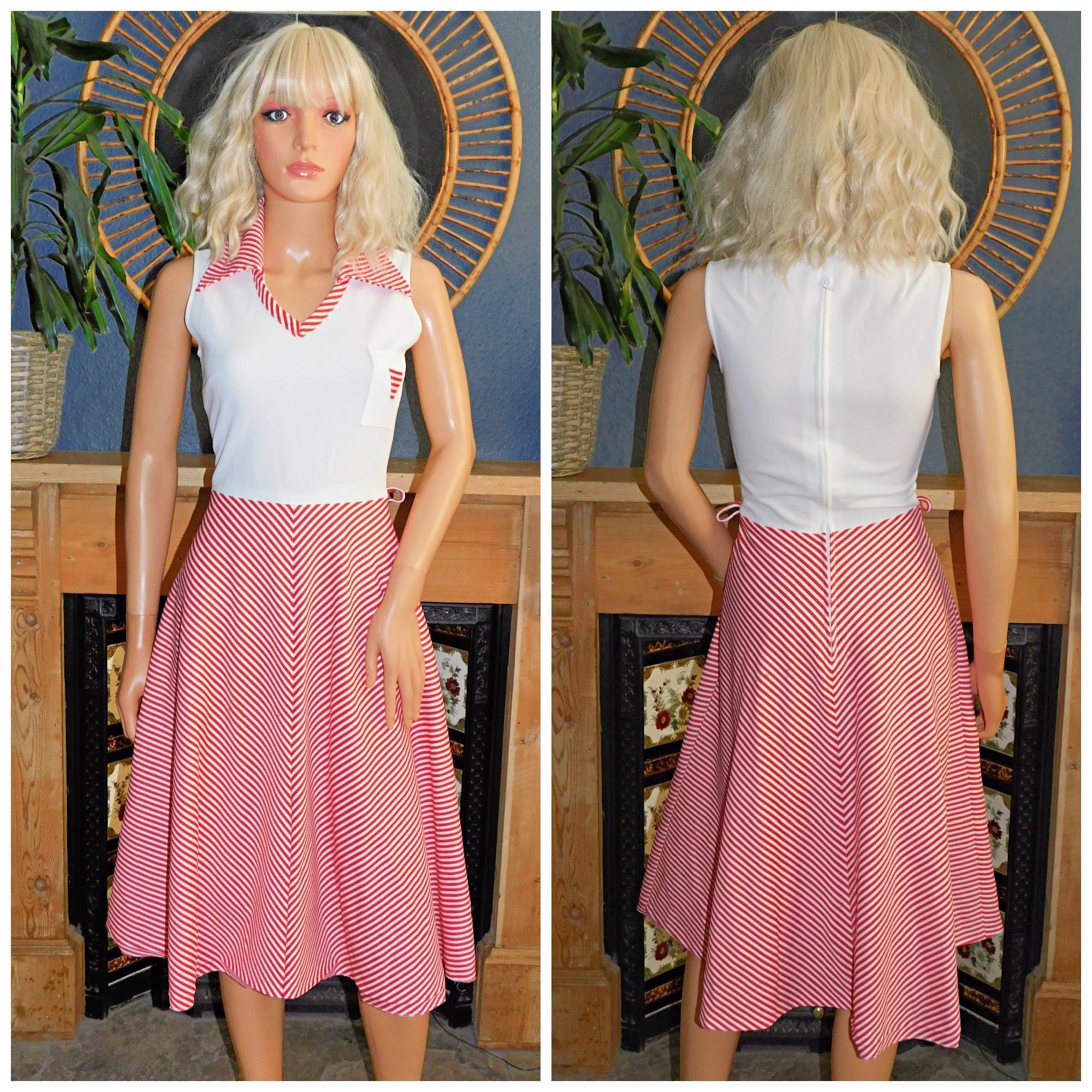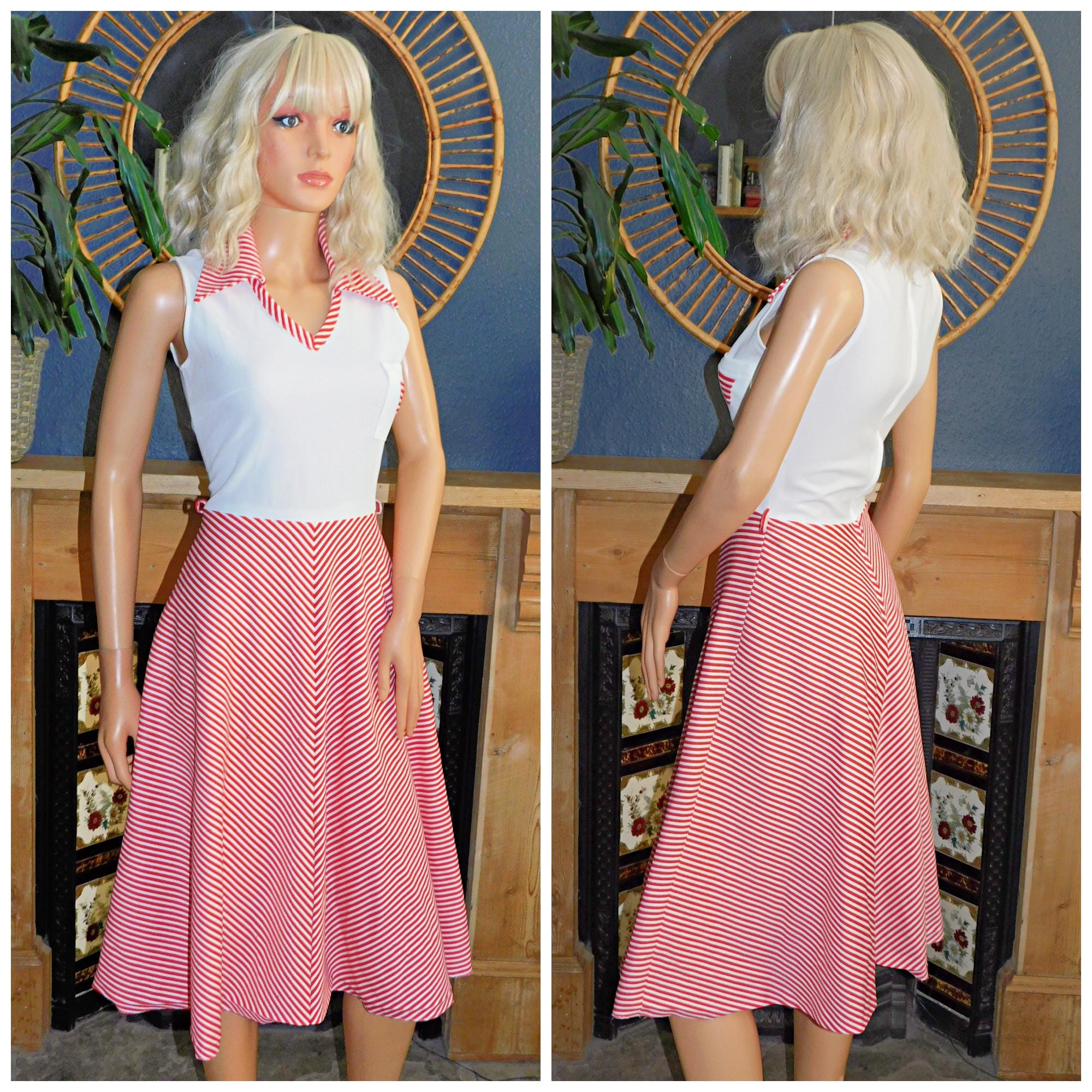 Vintage 70s Red White STRIPED Contrast Day Dress 8 S Xs 1970s