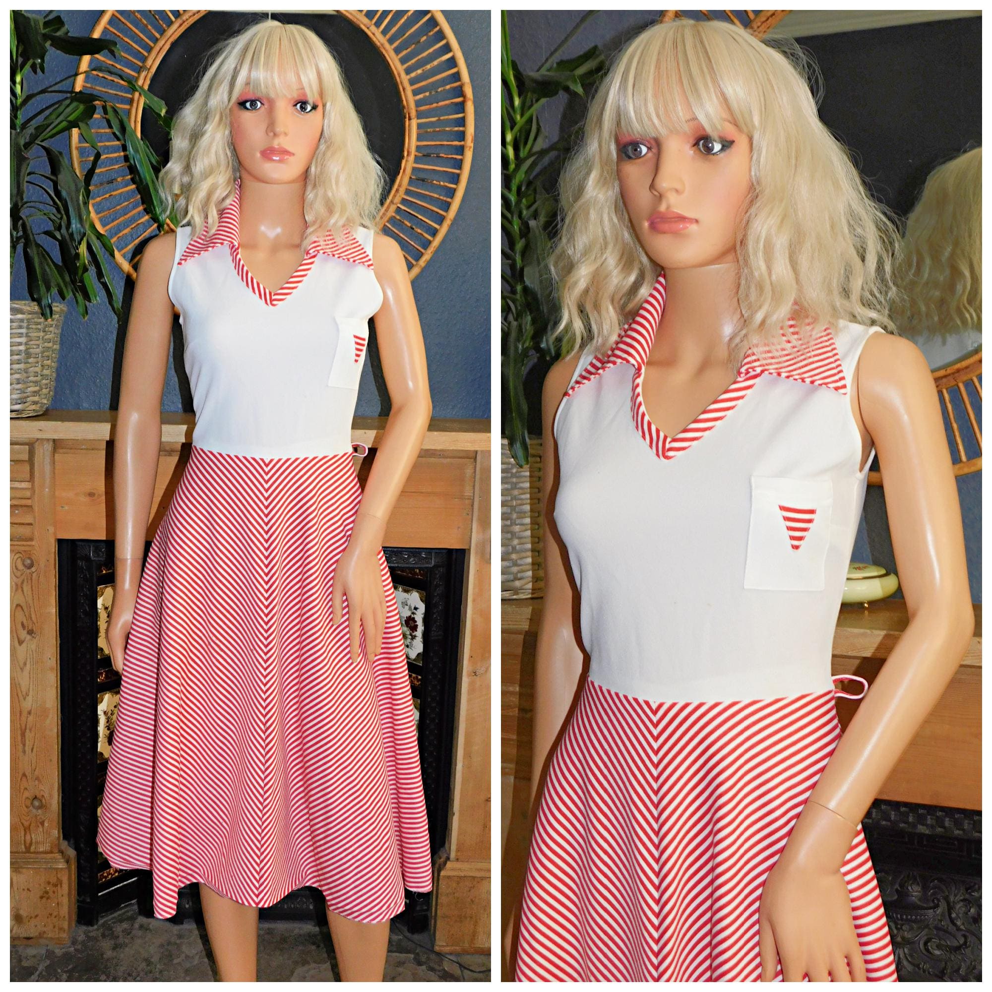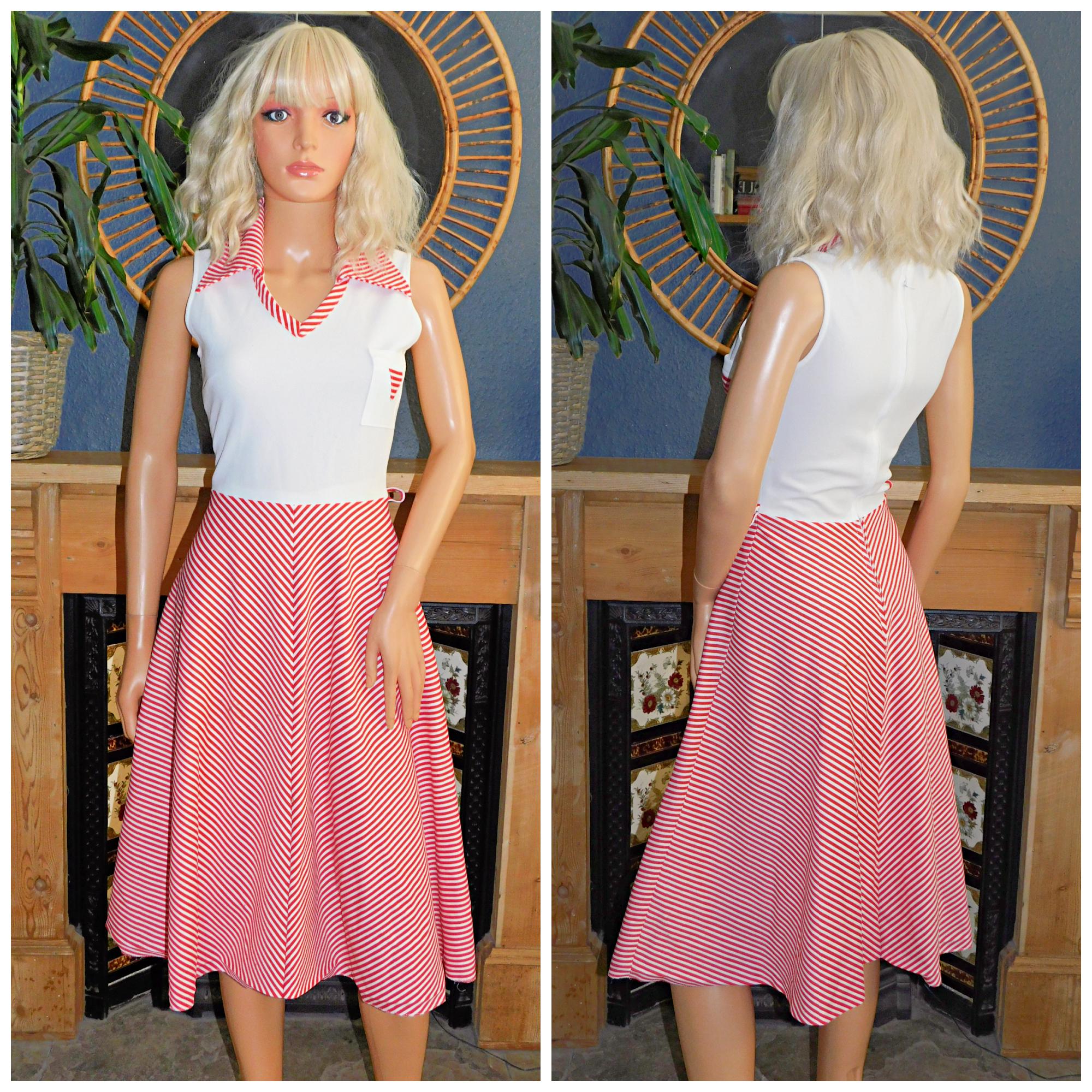 Original Seventies day dress in white with contrast red stripes