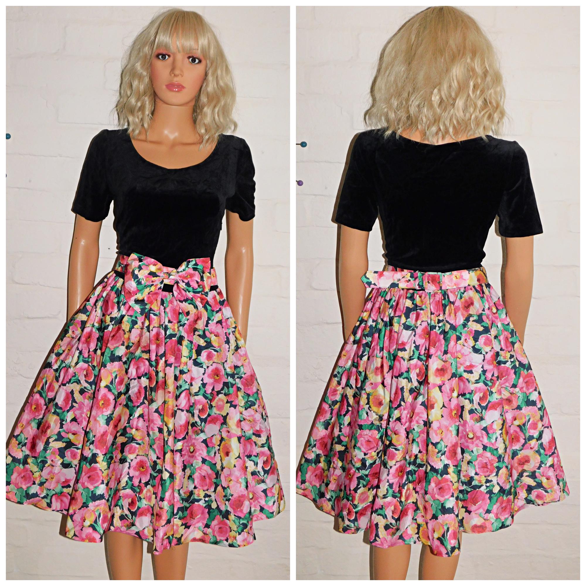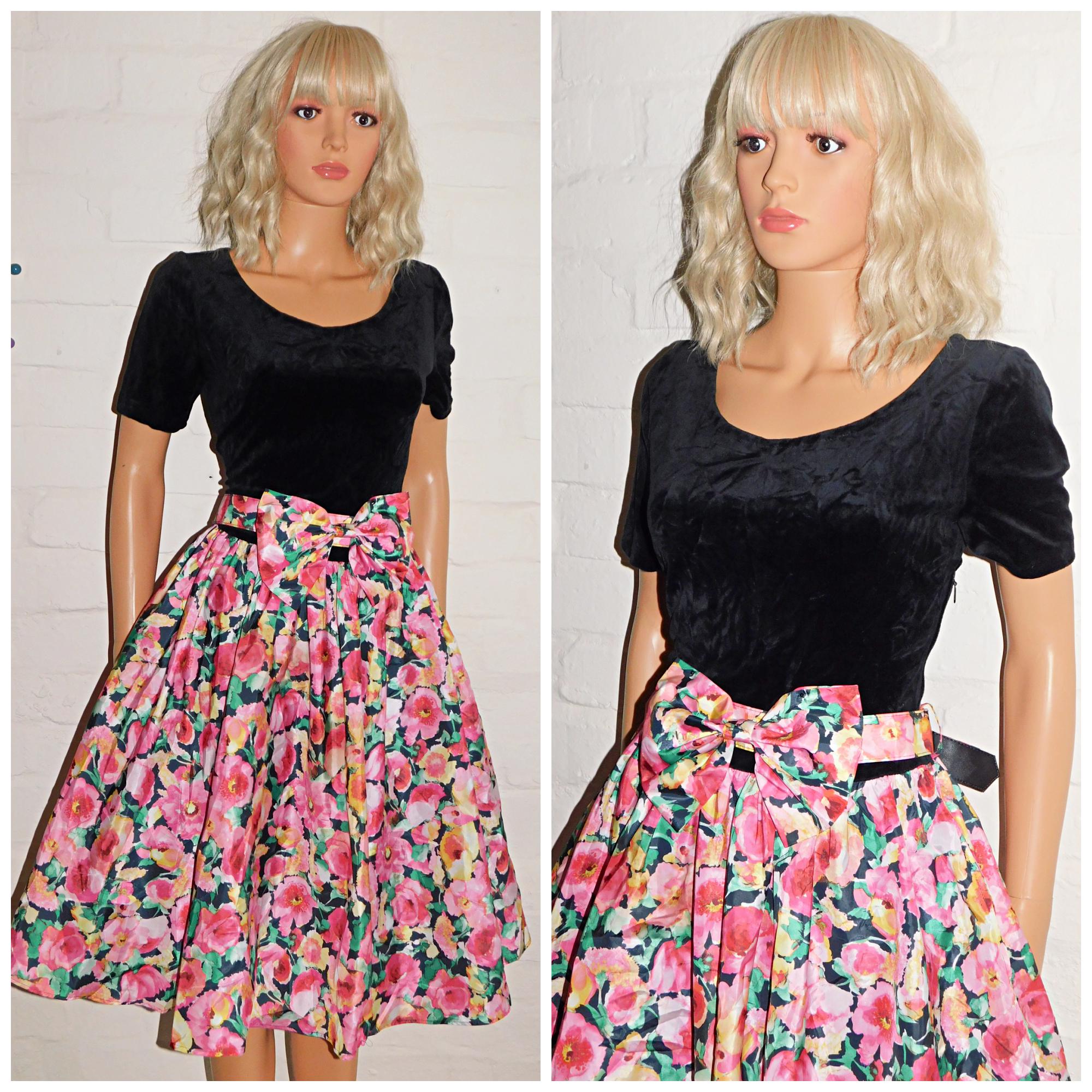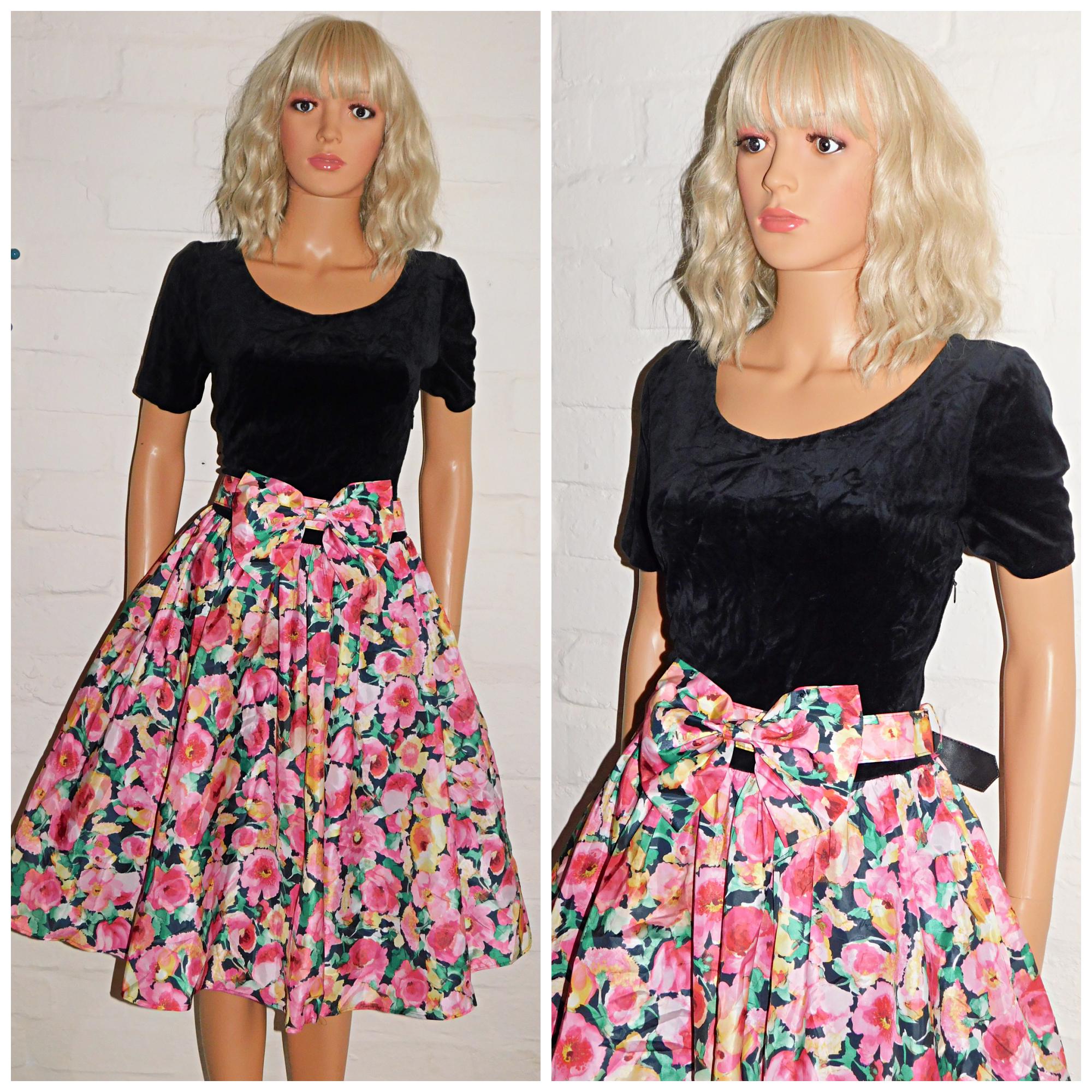 Eighties prom/day dress in black with contrasting bold floral print skirt