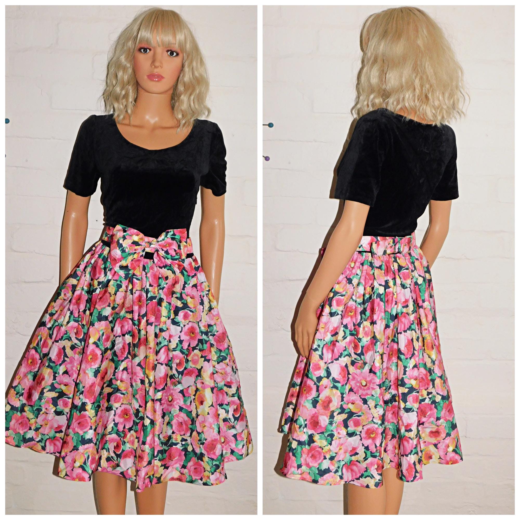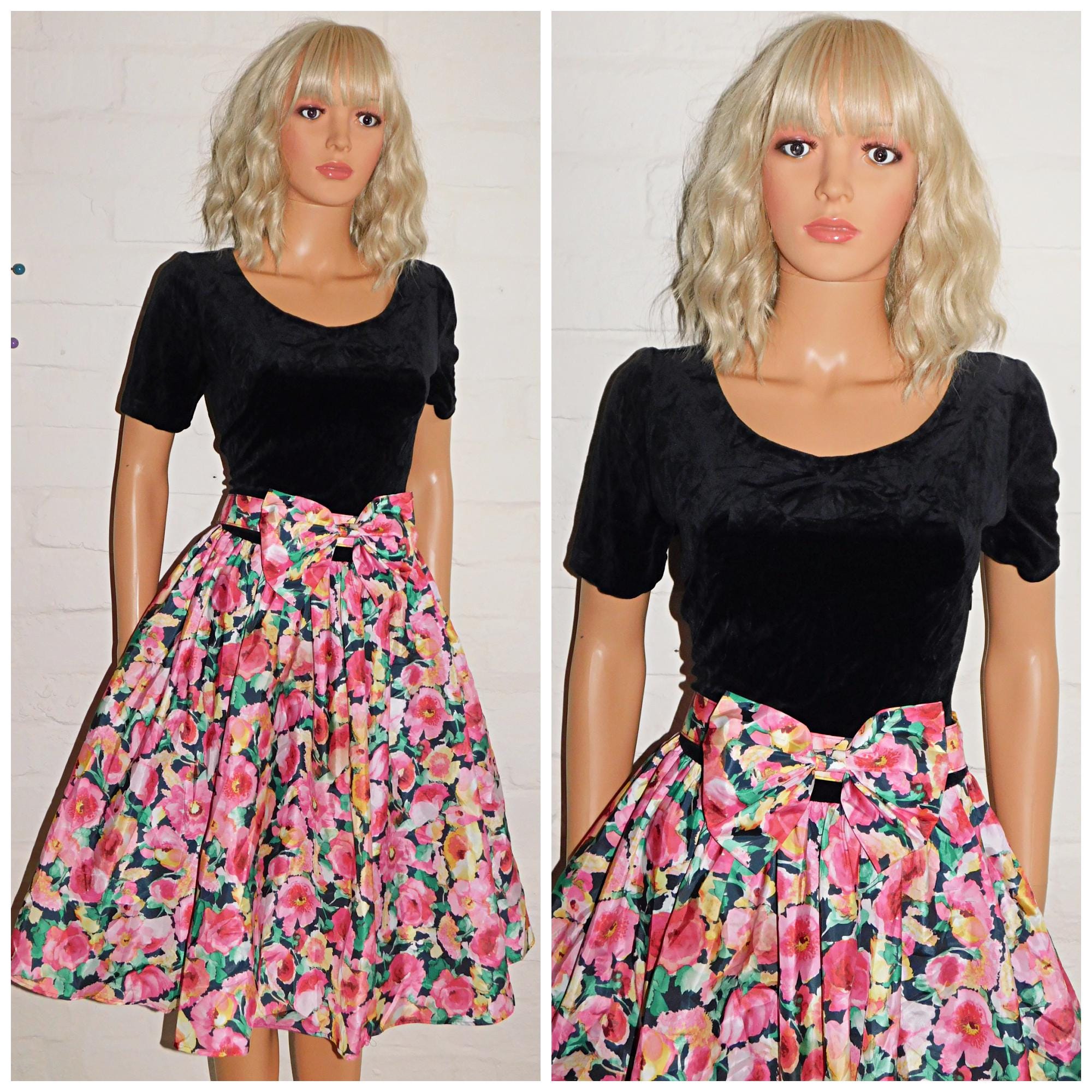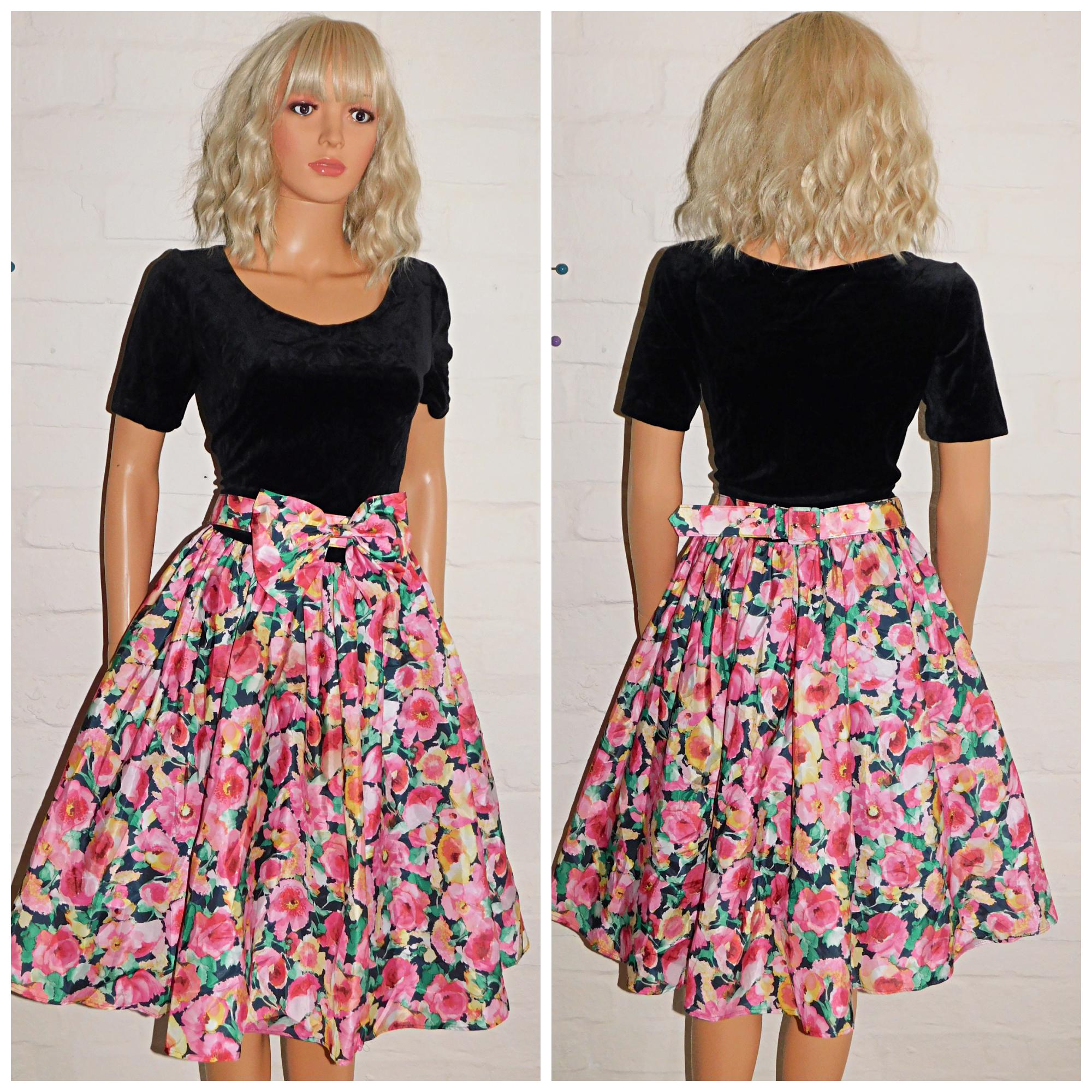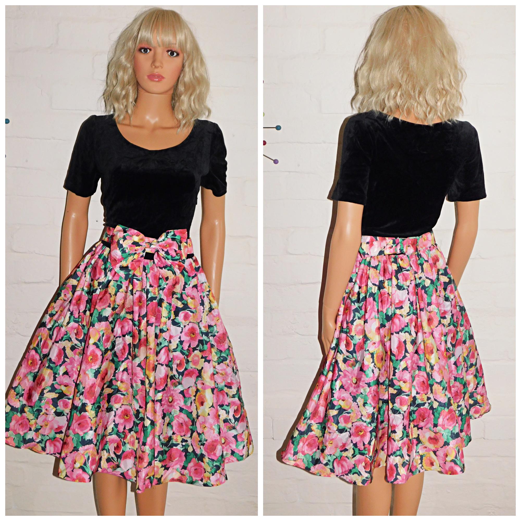 Eighties prom/day dress in black with contrasting bold floral print skirt