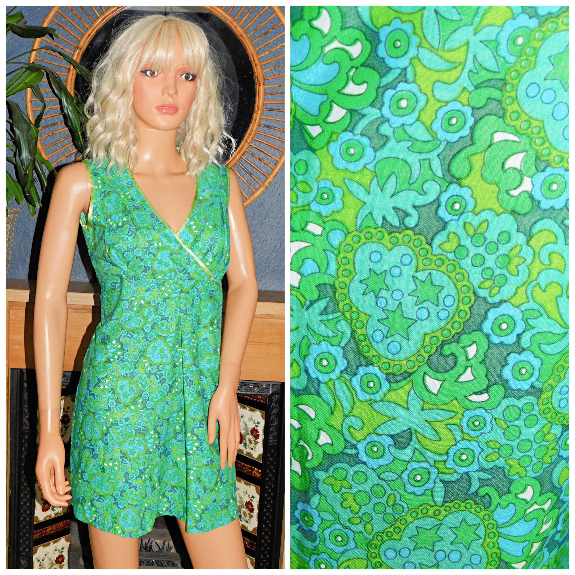 Vintage 60s Green PSYCHEDELIC FLOWER Power Print Cotton MINI Dress 12 S M 1960s Kitsch