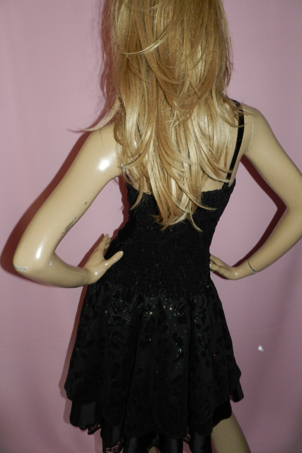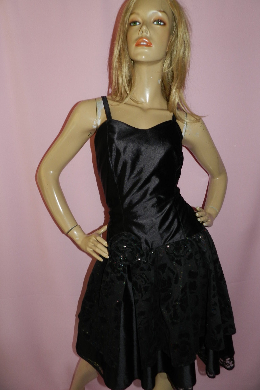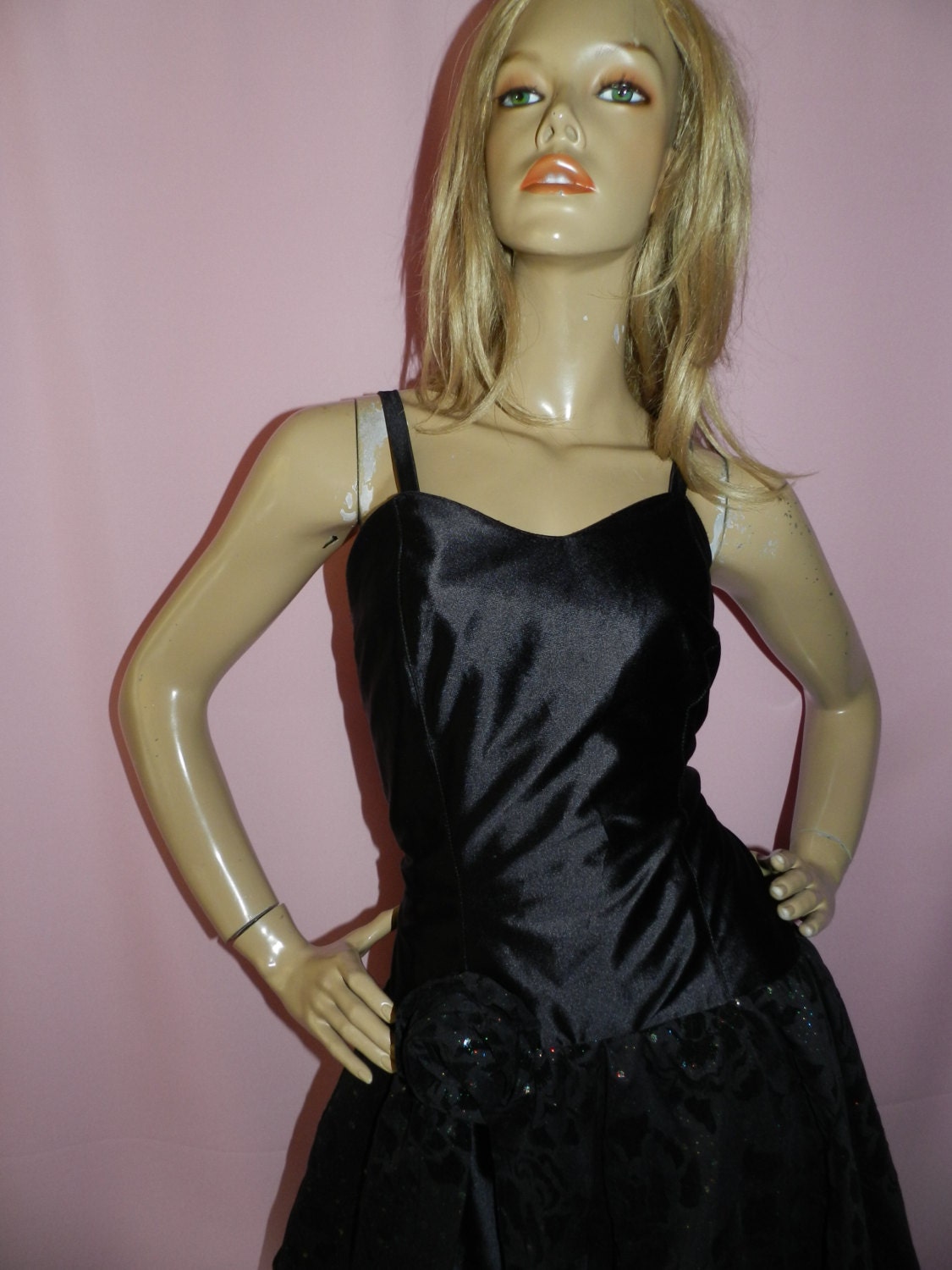Vintage 80s Black WET LOOK GLITTER Prom Party dress 12 M 1980s Detatchable straps Goth Halloween