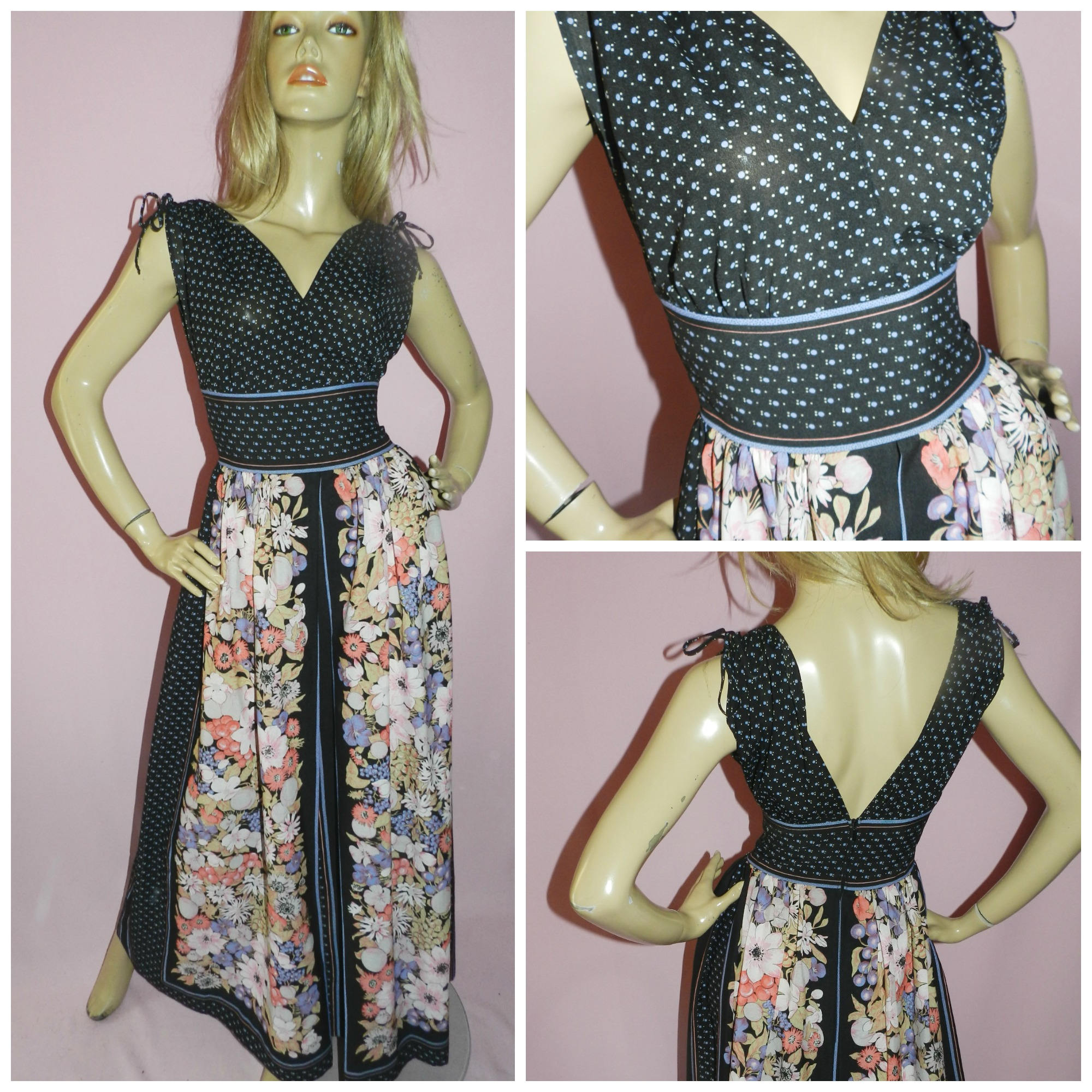 70s BOHEMIAN FLORAL Contrast Maxi Dress 8 S 1970s Hippy Hippie Festival Boho Woodstock revival Lucie Linden