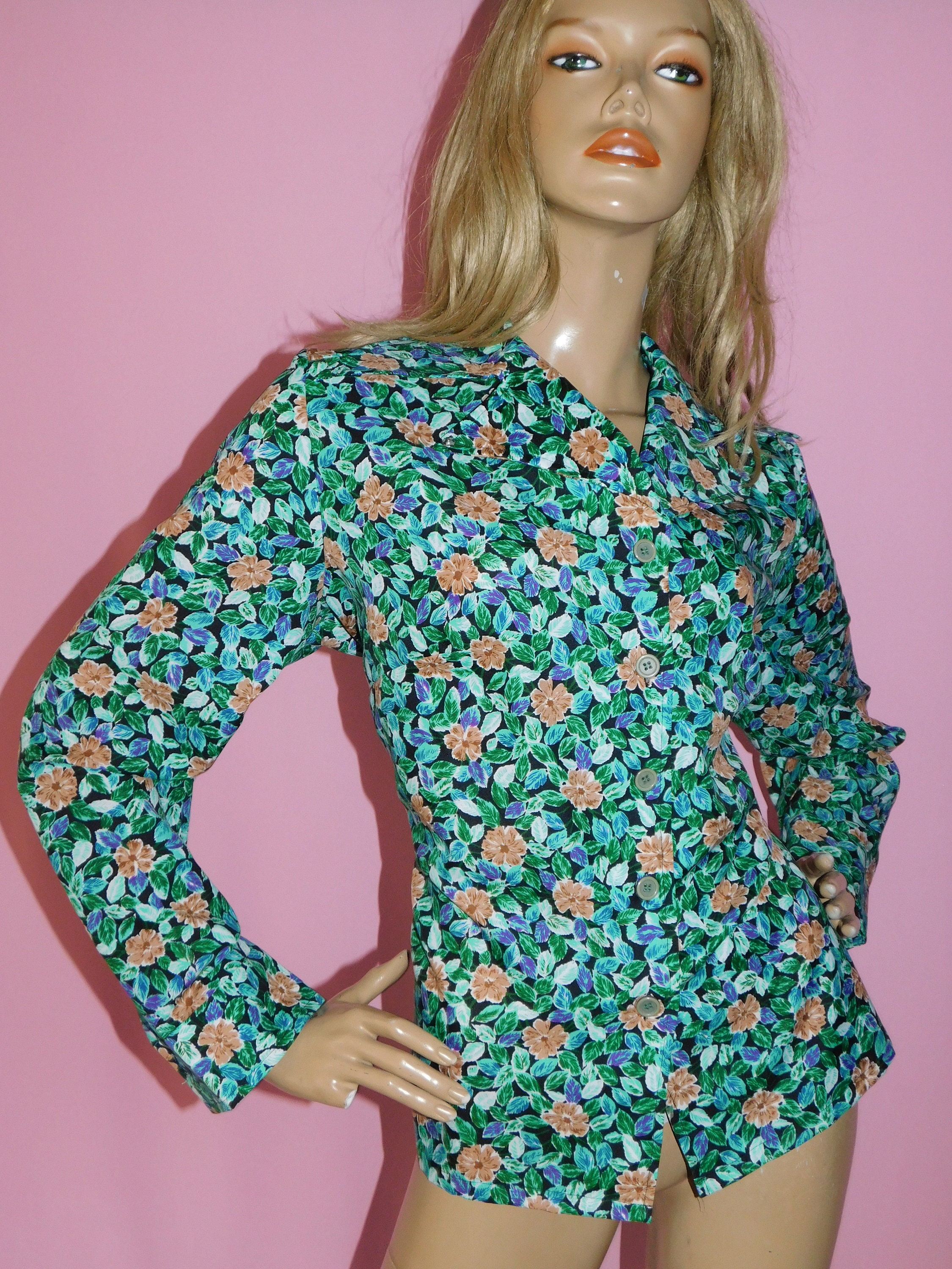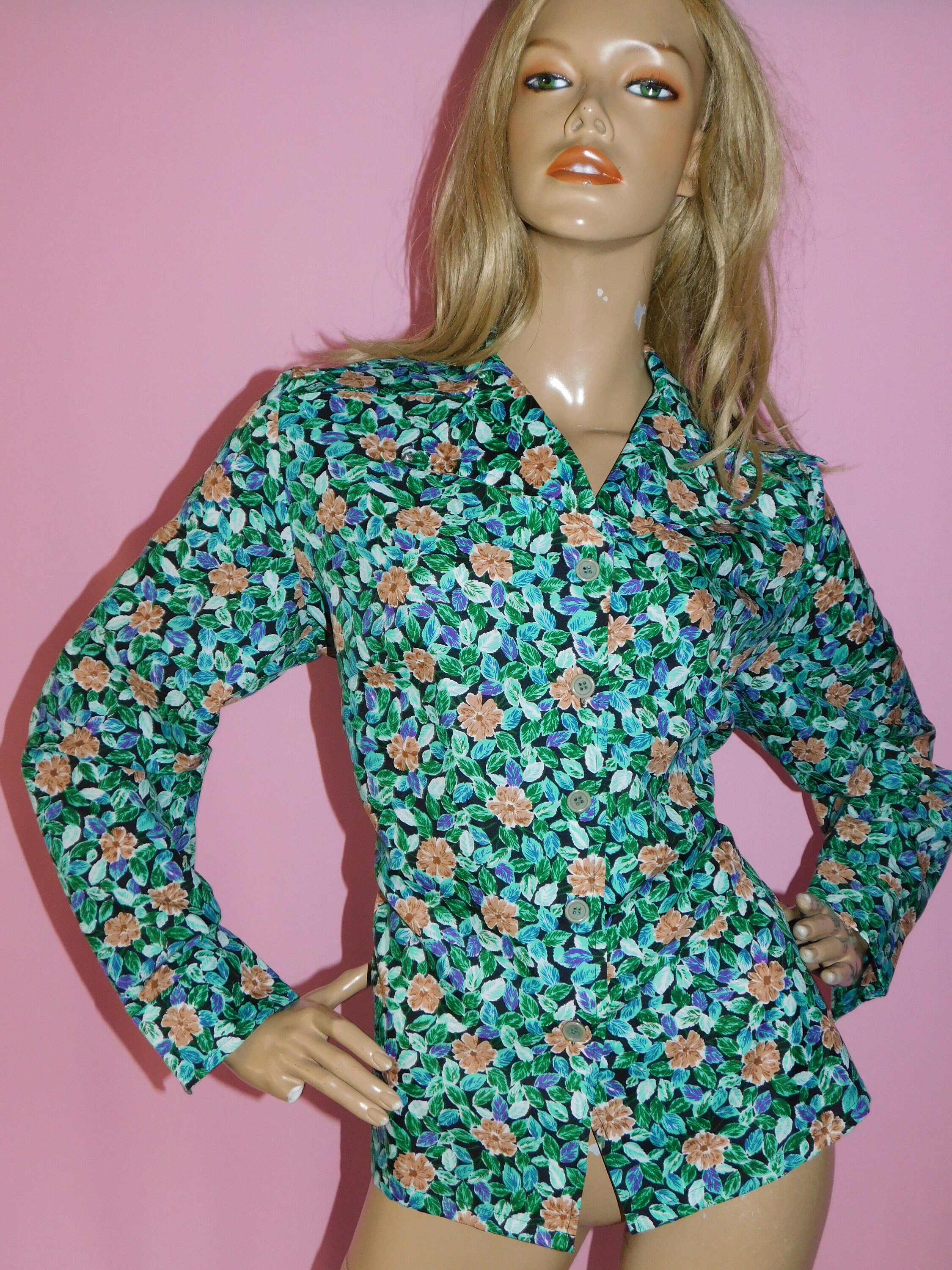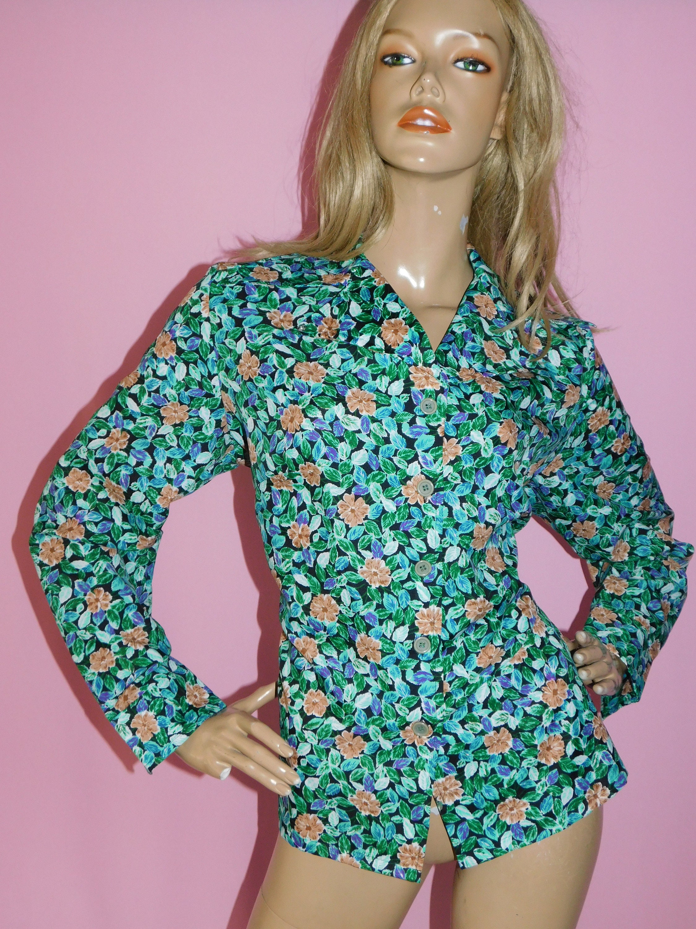 Very pretty Seventies 40s styled blouse in a green/tan/black floral print