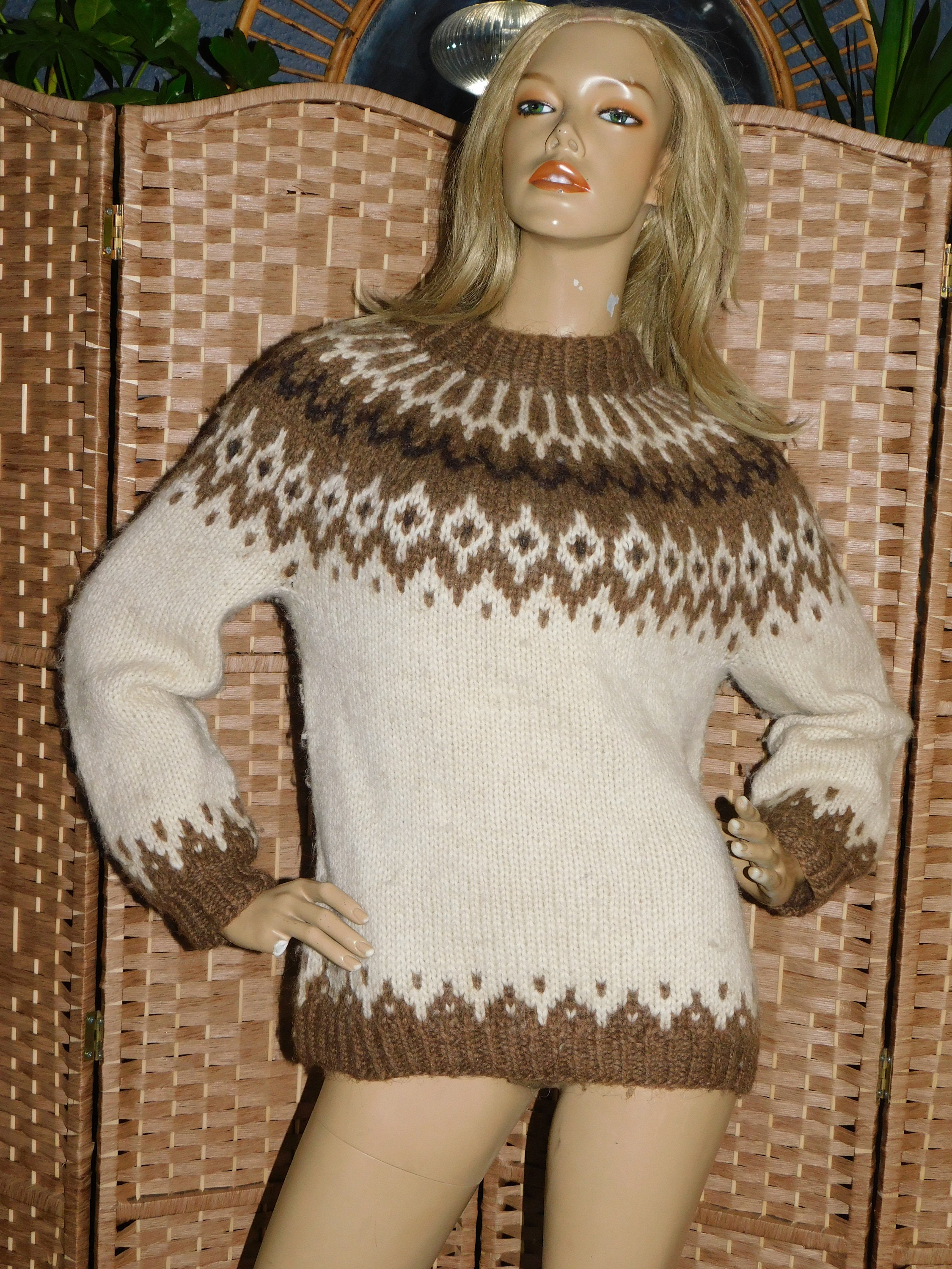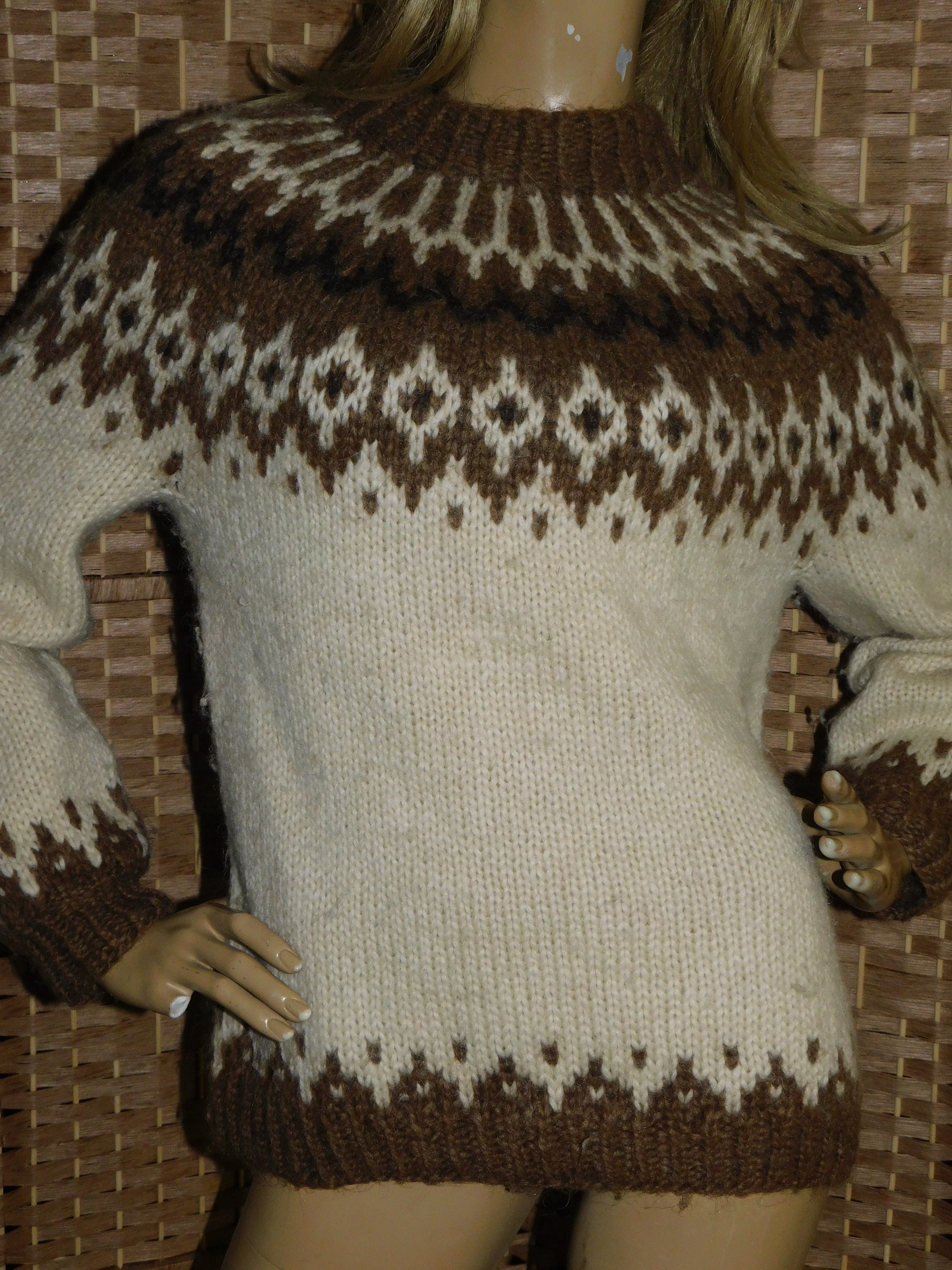 Traditional Icelandic pure wool chunky knit wool sweater from the 70s in cream/brown
